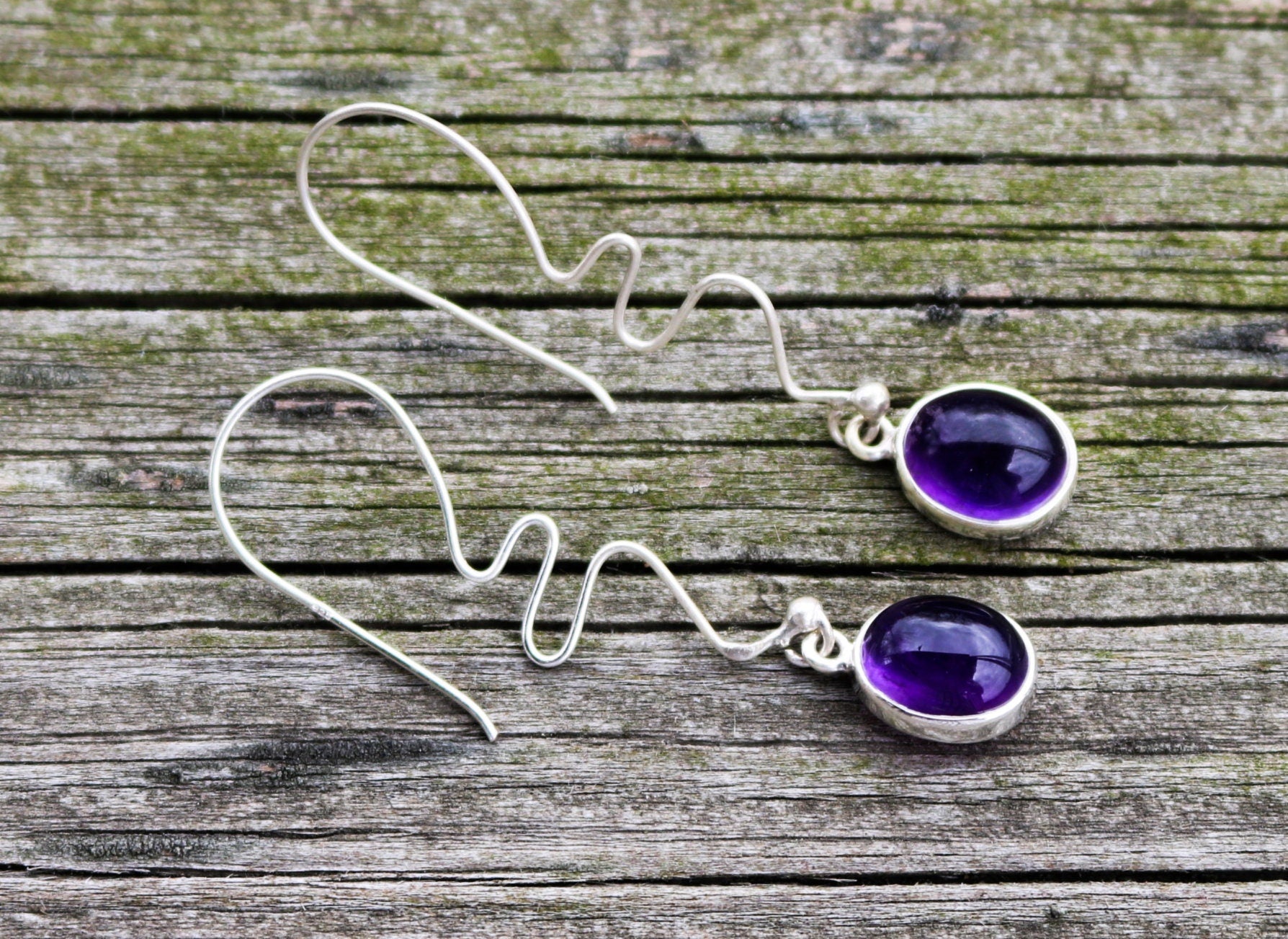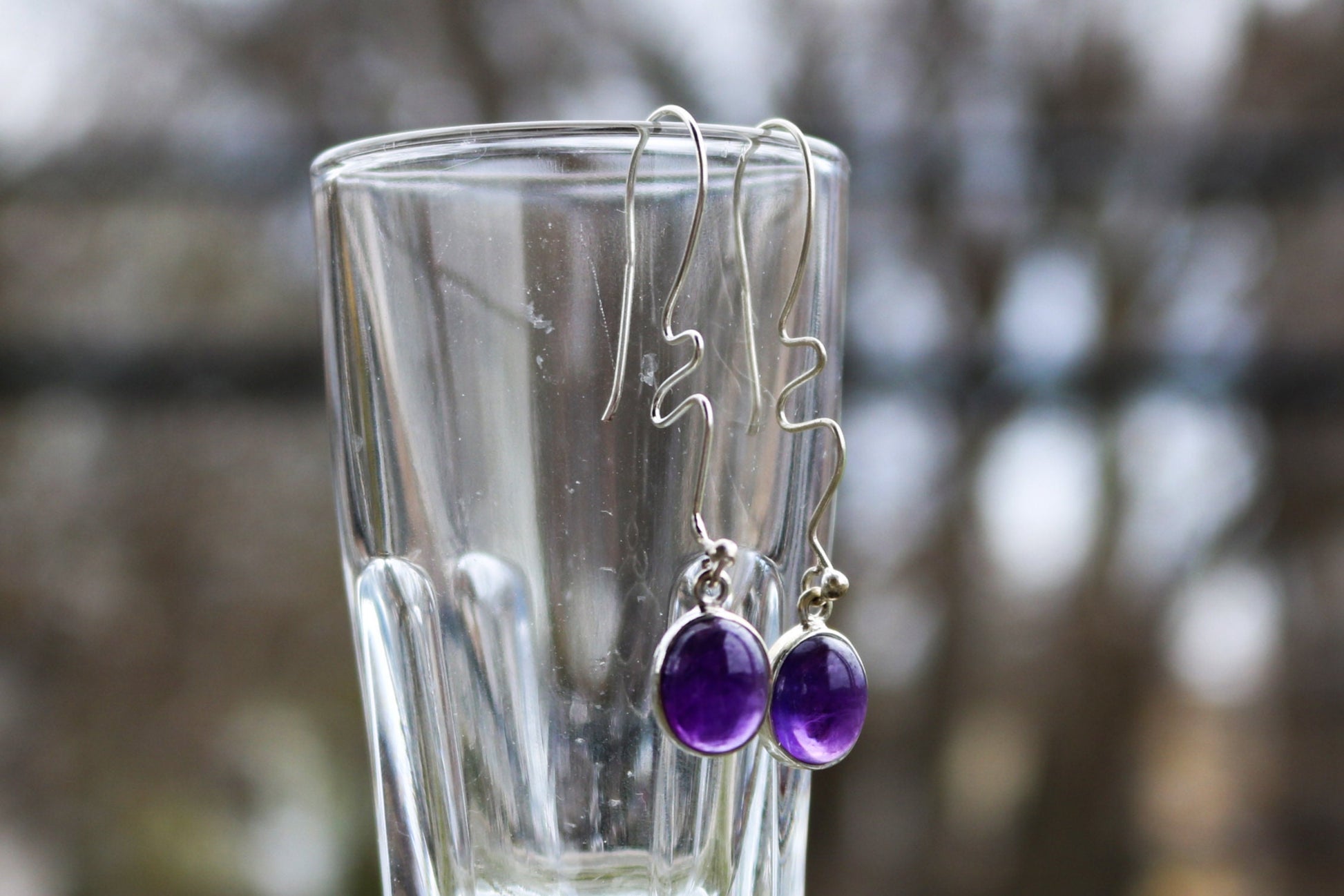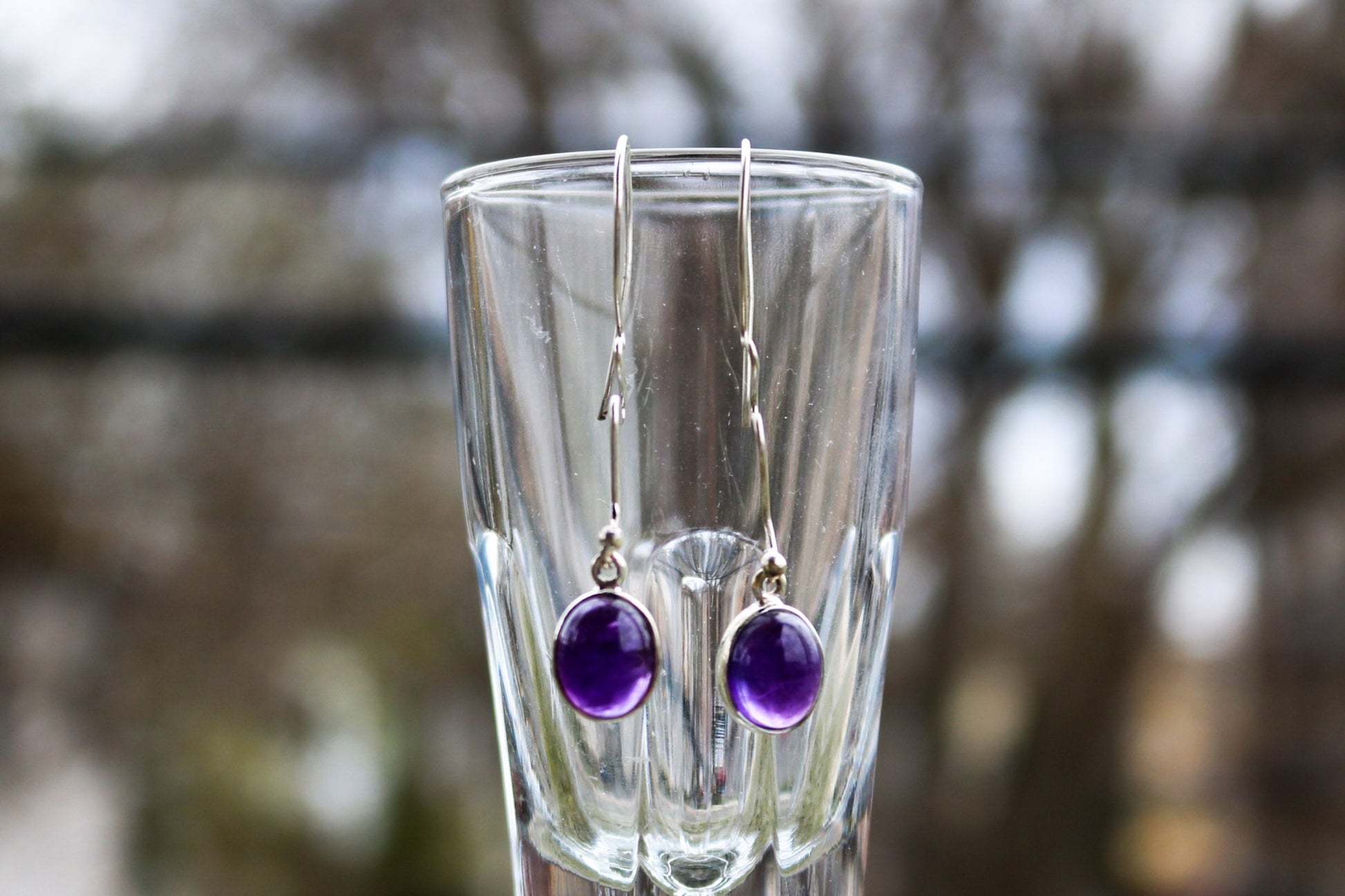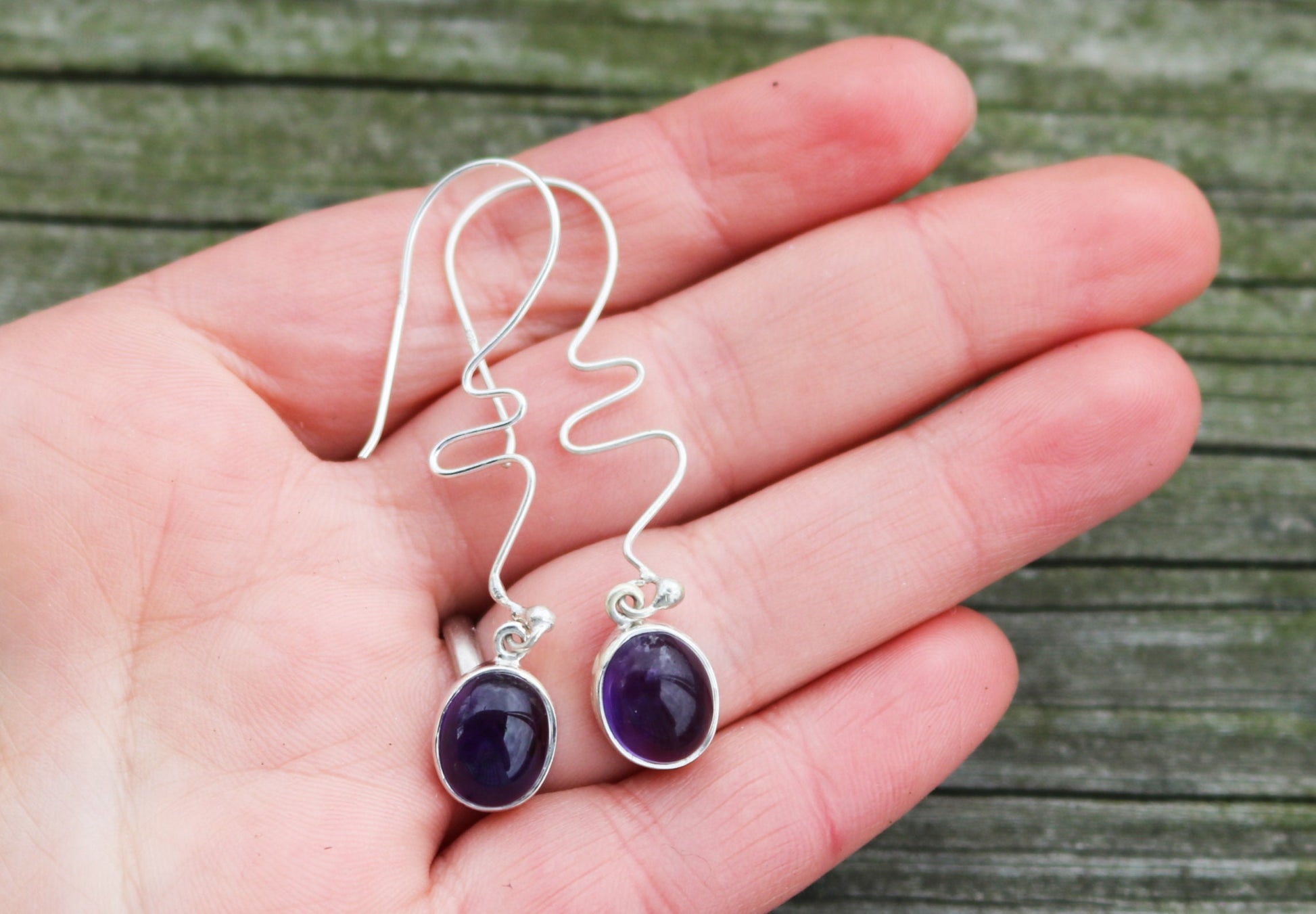 Amethyst Earrings Dangling Oval Long Wire Purple Jewelry 2.1" 925 Silver