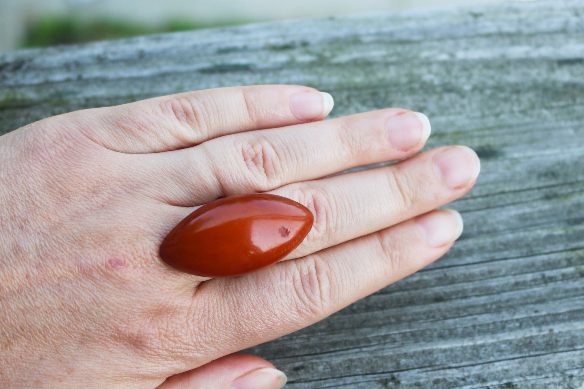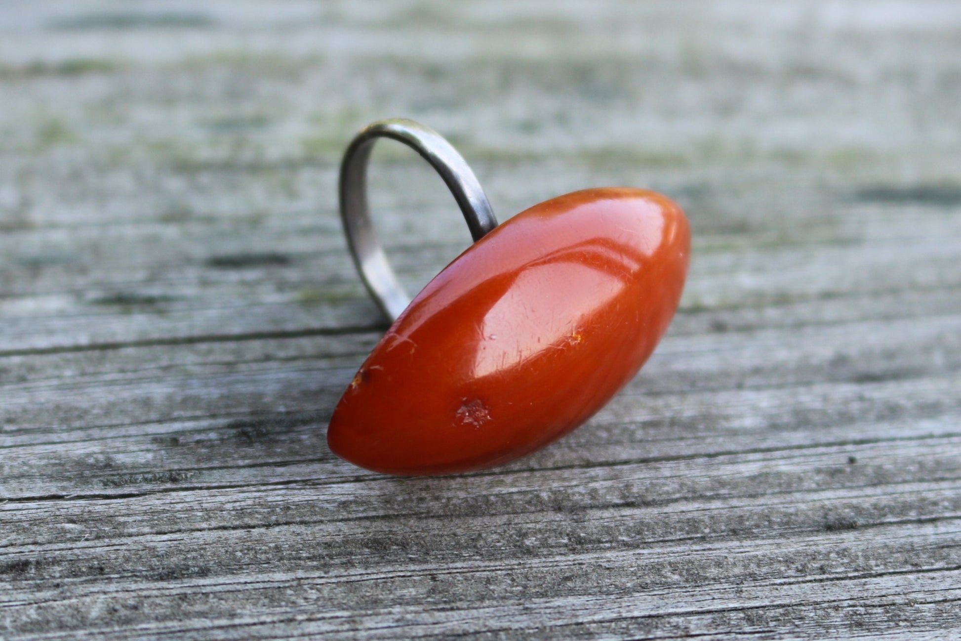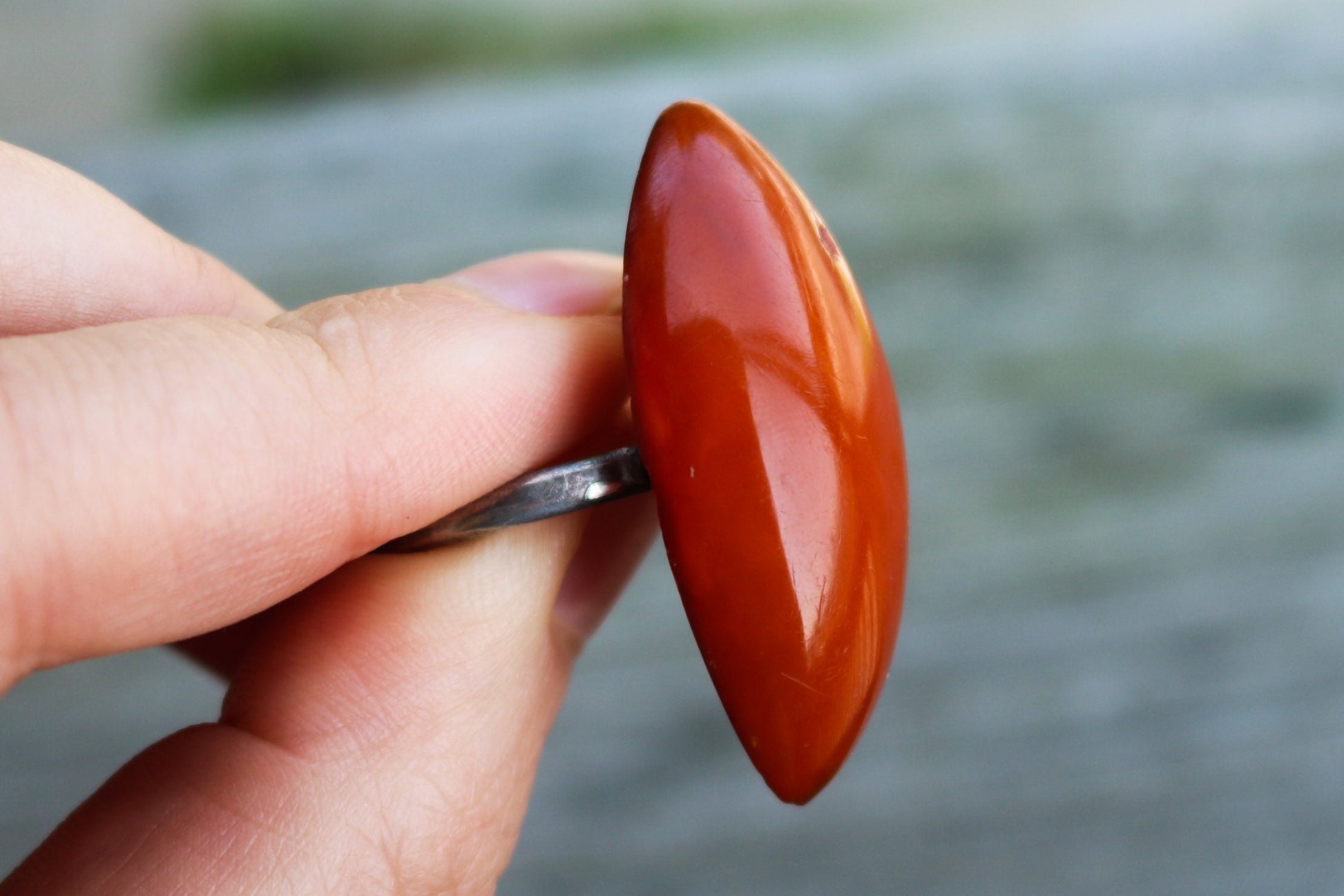 Antique Baltic Amber marquise cut ring in red color. Set in 925 sterling silver. Natural untreated stone.