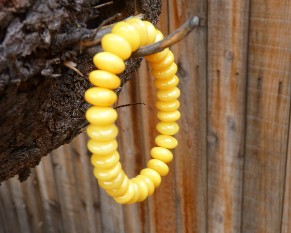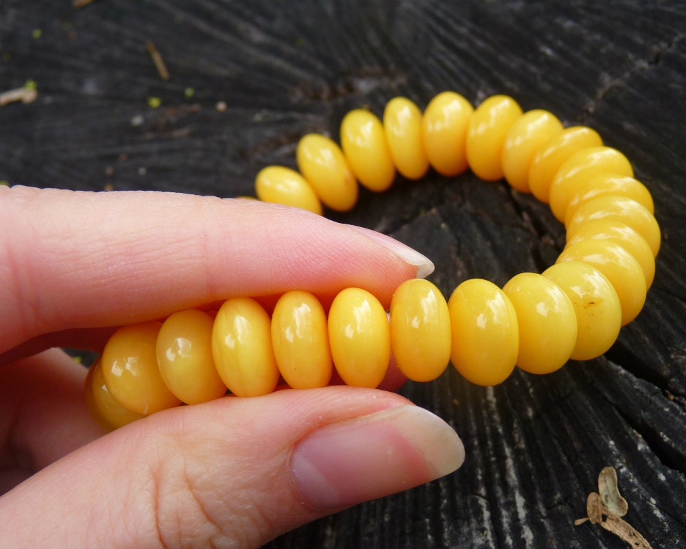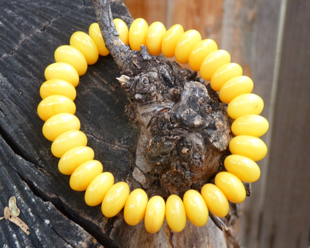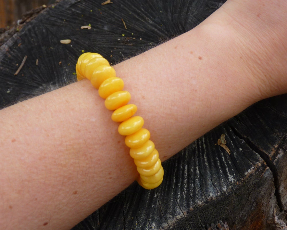 Baltic Amber stretch bracelet made out of rondelle shape beads in antique butterscotch (light yolk) color. Natural solid, not pressed or reconstructed, amber. Each bead is carved out of one piece of amber.