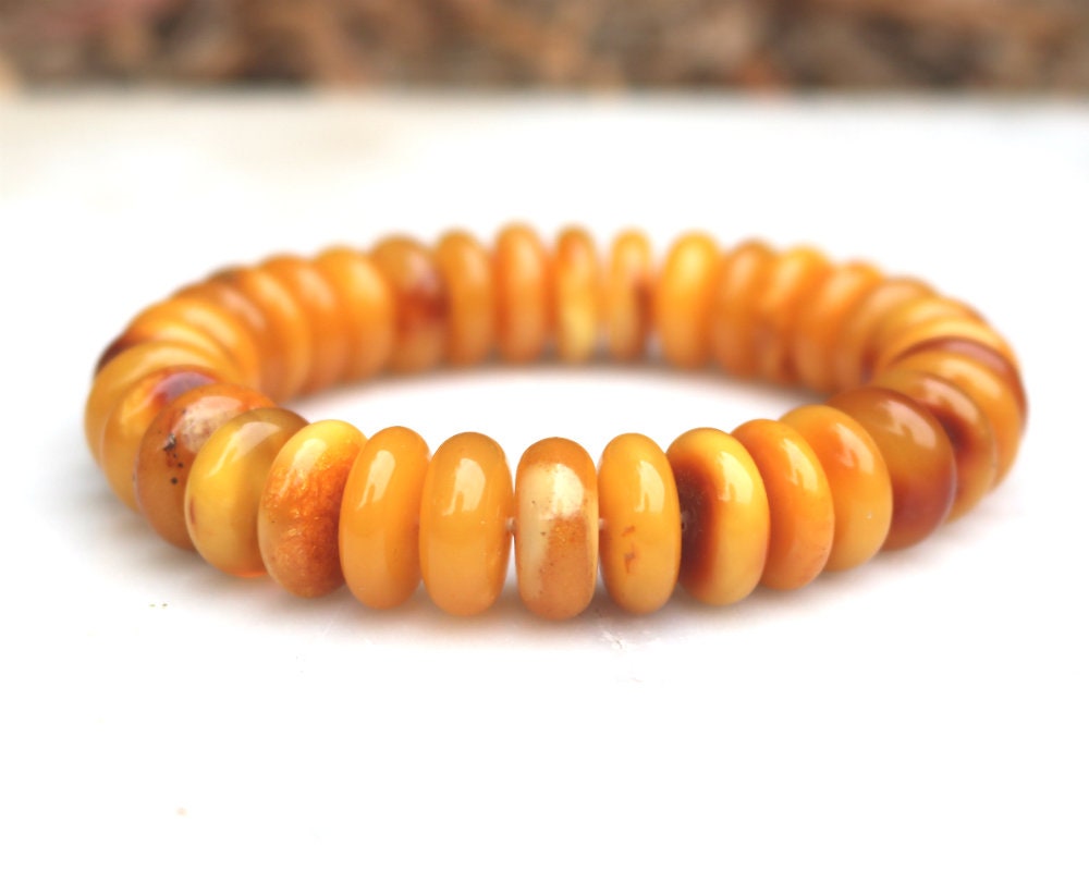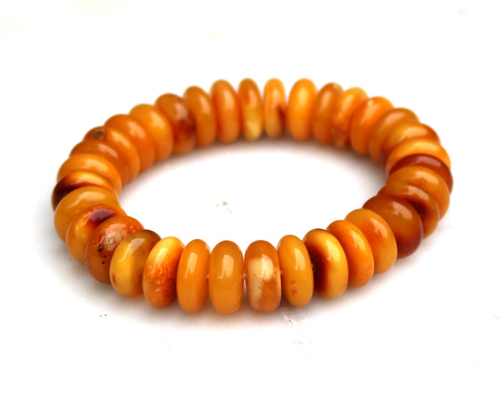 Rare Baltic Amber stretchy bracelet made out of polished antique butterscotch color (yolk) hand carved rondelle shaped beads. This is naturally aged untreated amber. Each bead is hand carved out of one solid piece of Baltic Amber.