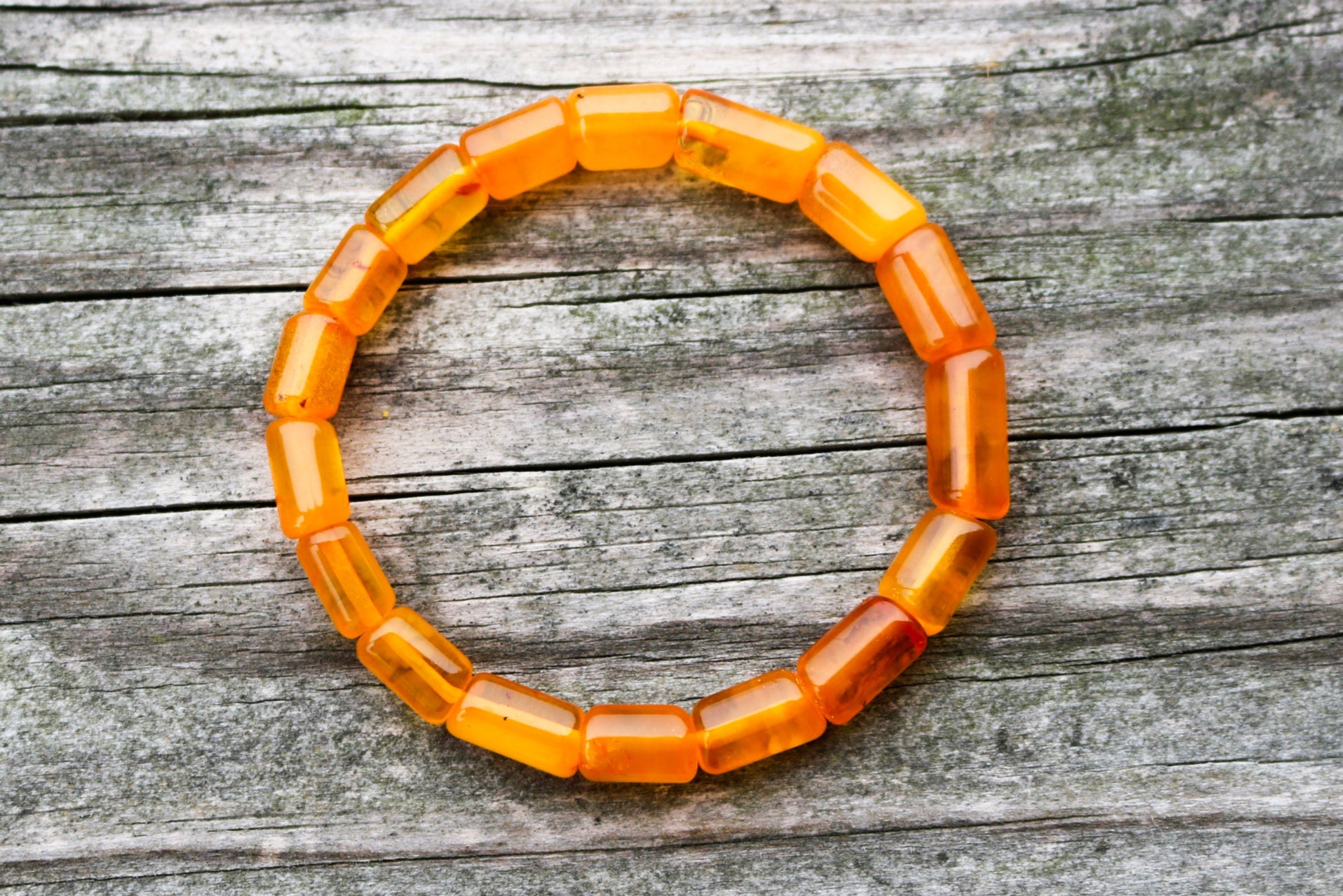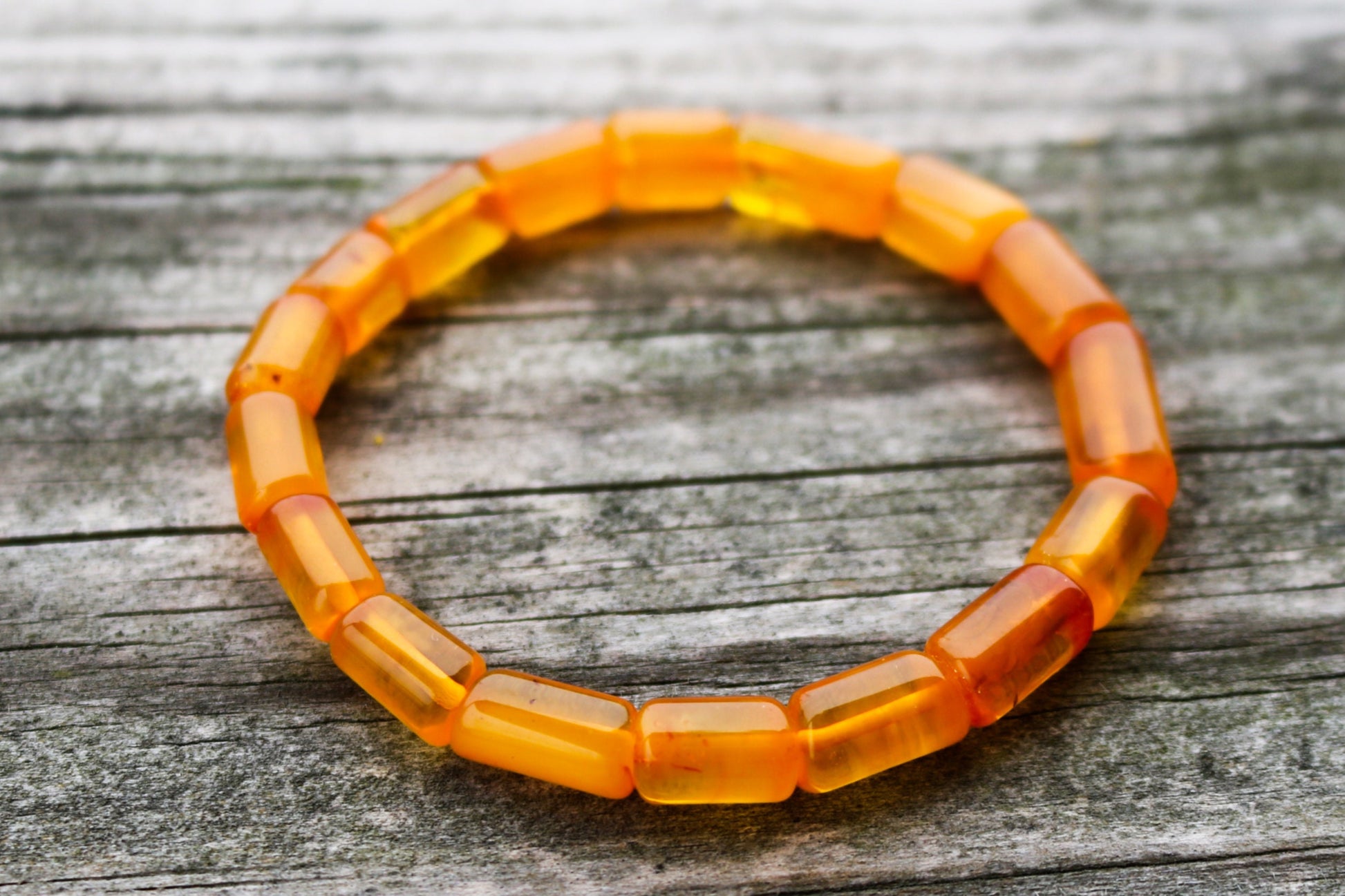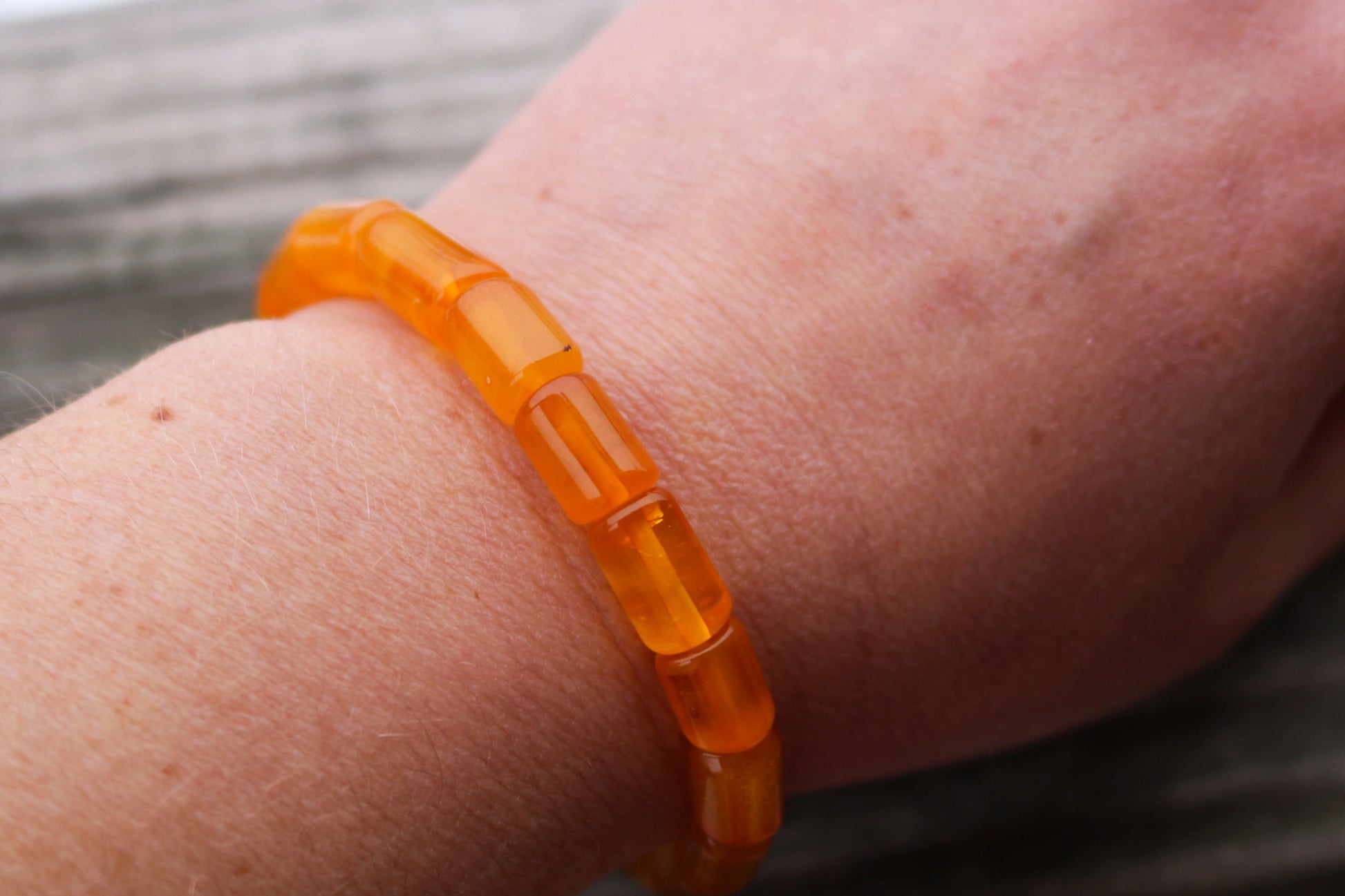 Baltic Amber stretch bracelet made out of natural untreated barrel shaped beads in semi-translucent naturally cloudy antique caramel color.