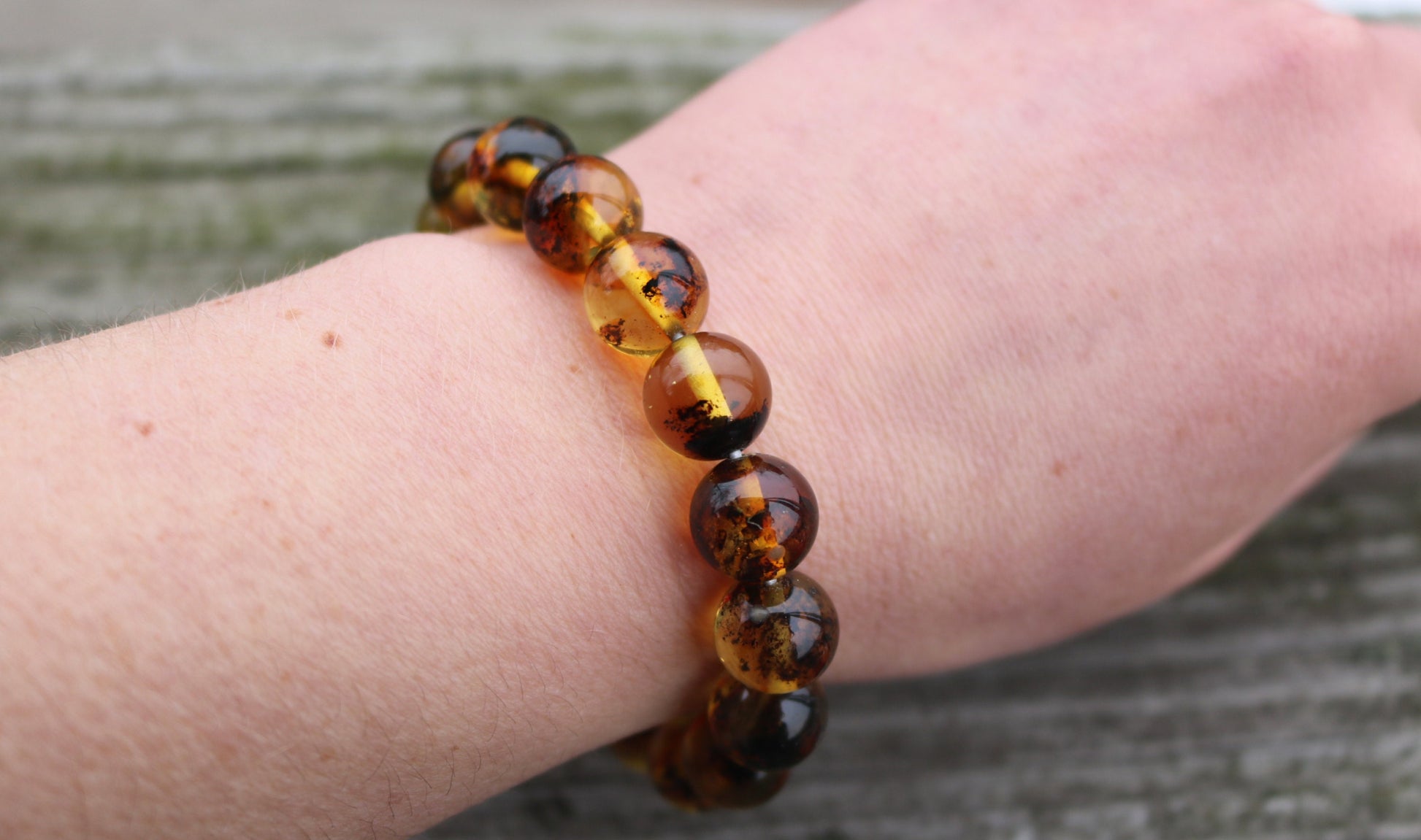 Baltic Amber stretch bracelet made out of 12 mm balls in green color with natural inclusions.
