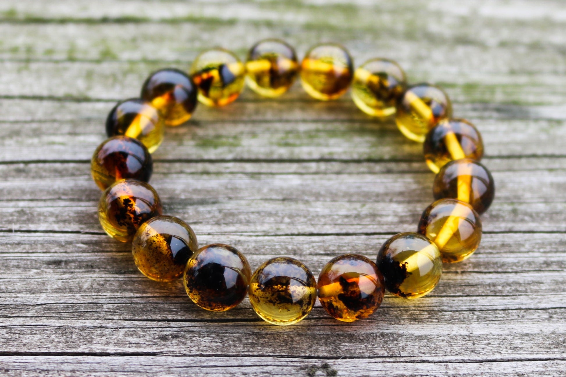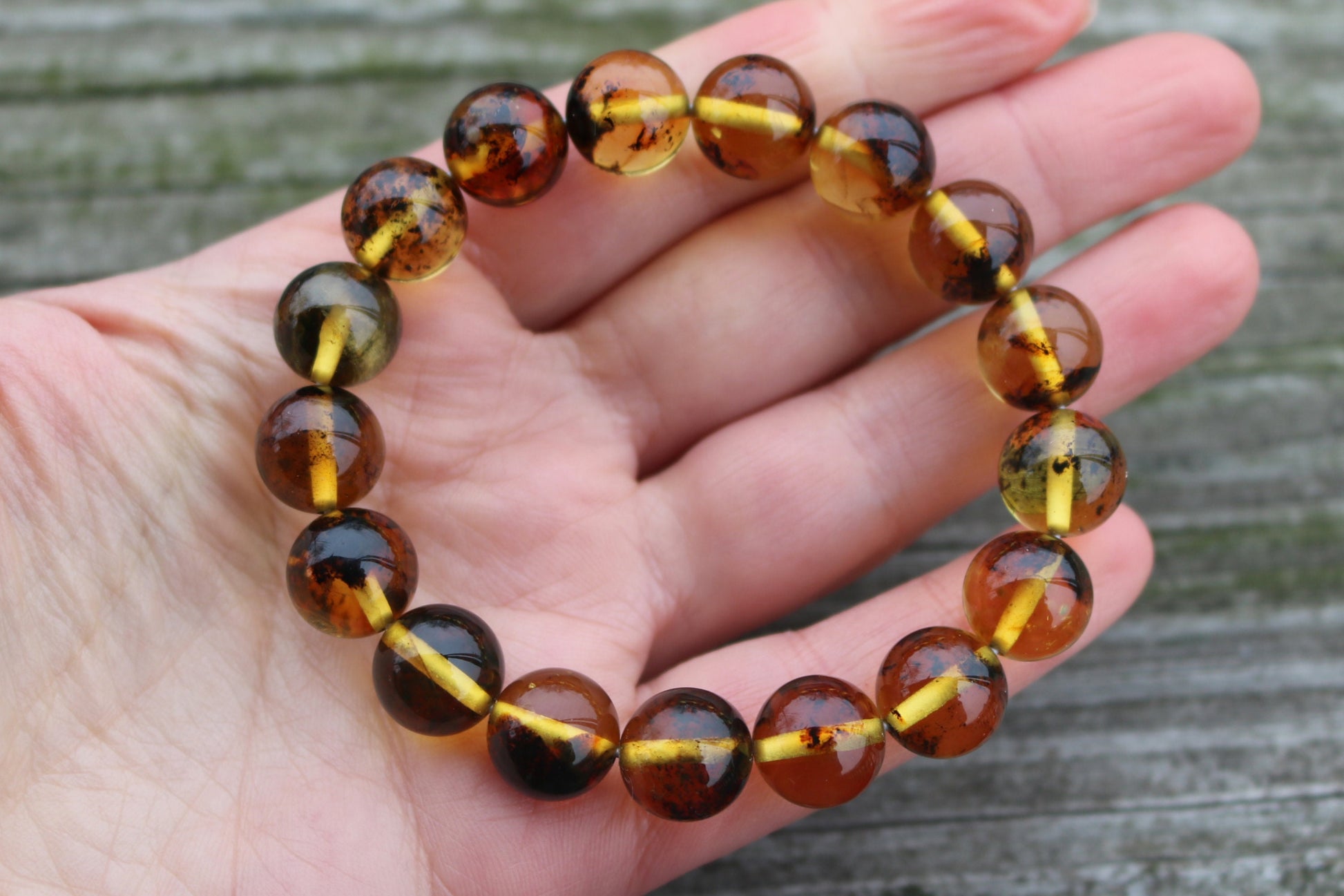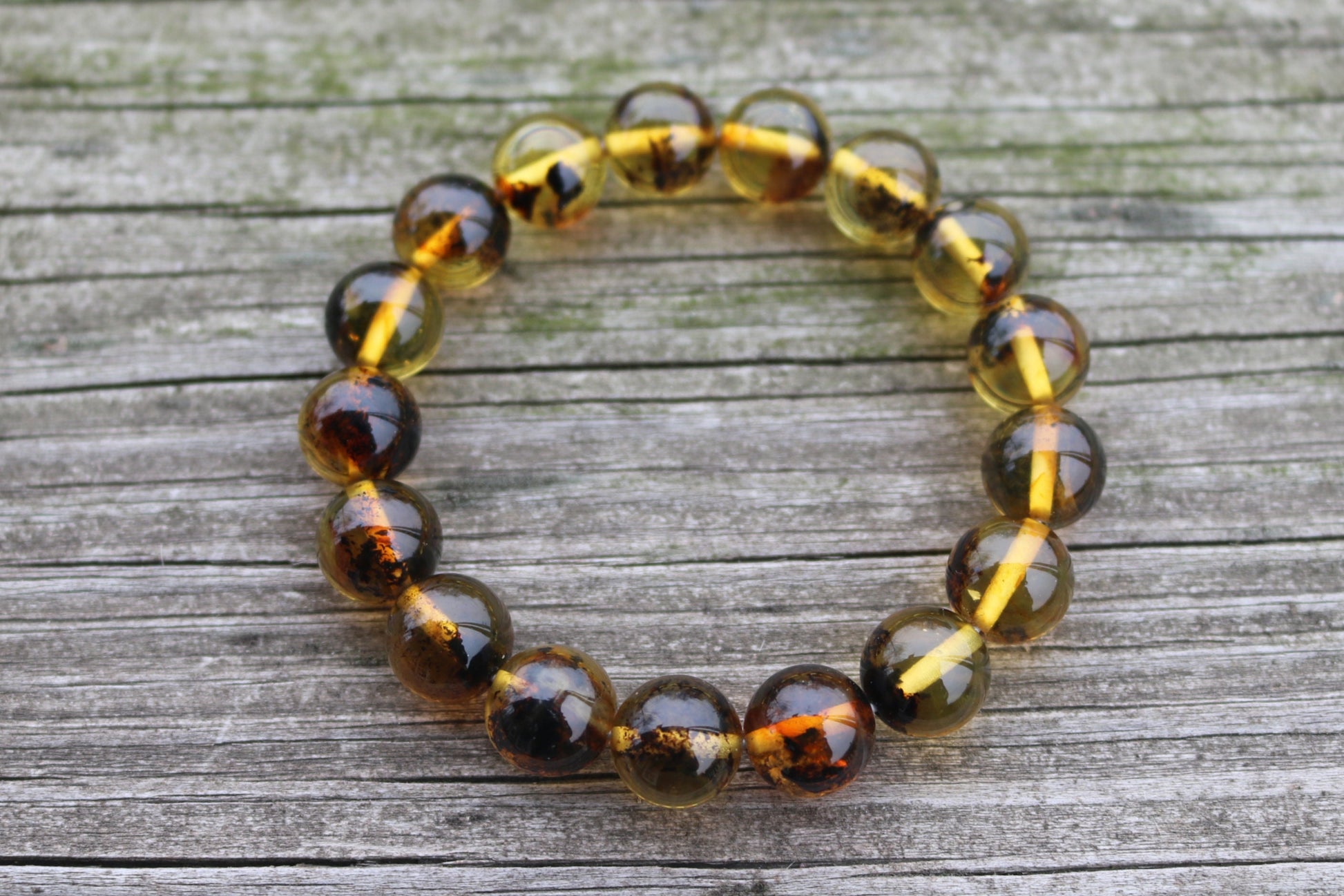 Baltic Amber Bracelet Green Balls Inclusions Natural Unisex 7.5" 12 mm 15 gram