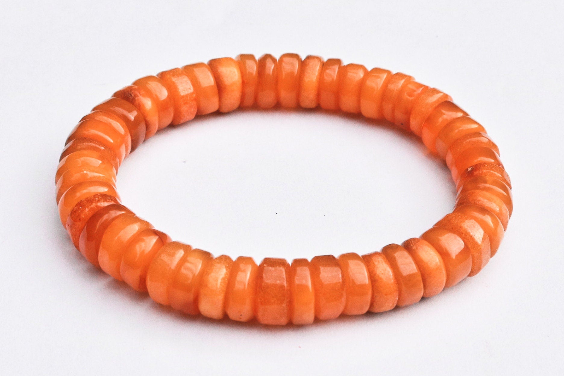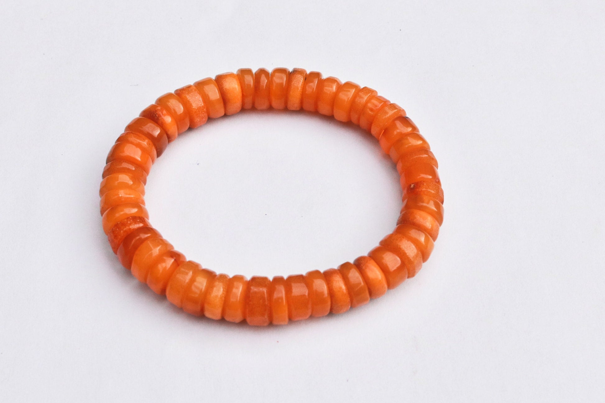 Baltic Amber bracelet made out of hand carved disc shaped beads in antique (yolk) color. Each bead measures about 0.36 - 0.38 inch in diameter (0.92 - 0.98 cm).