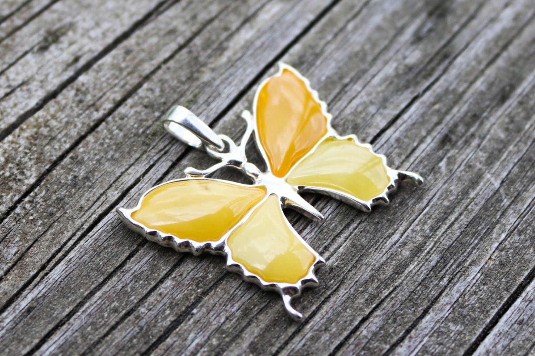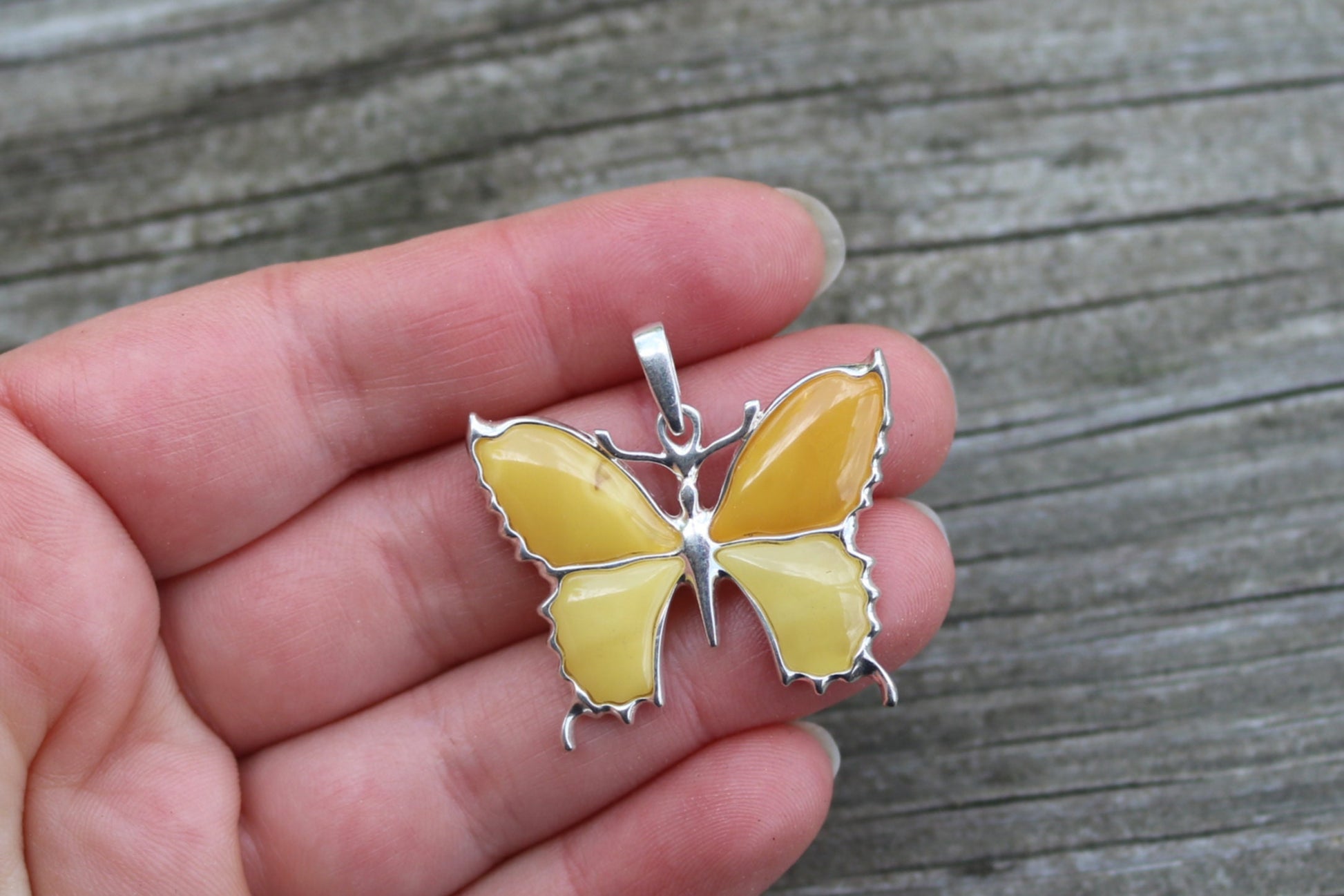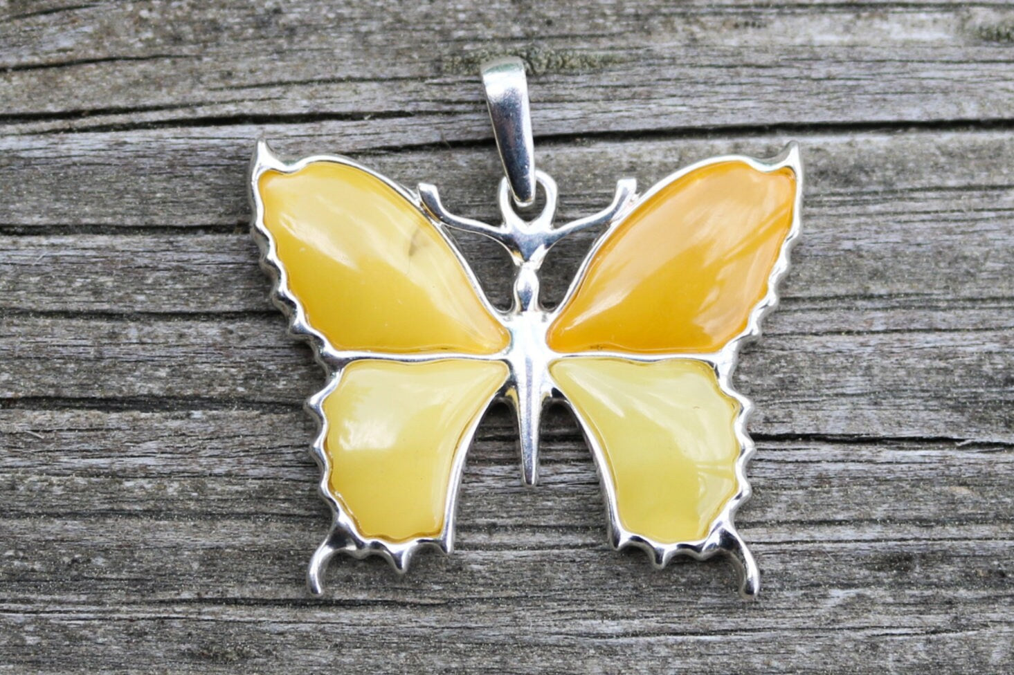 Gorgeous hand crafted Baltic Amber Butterfly pendant in 925 sterling silver.