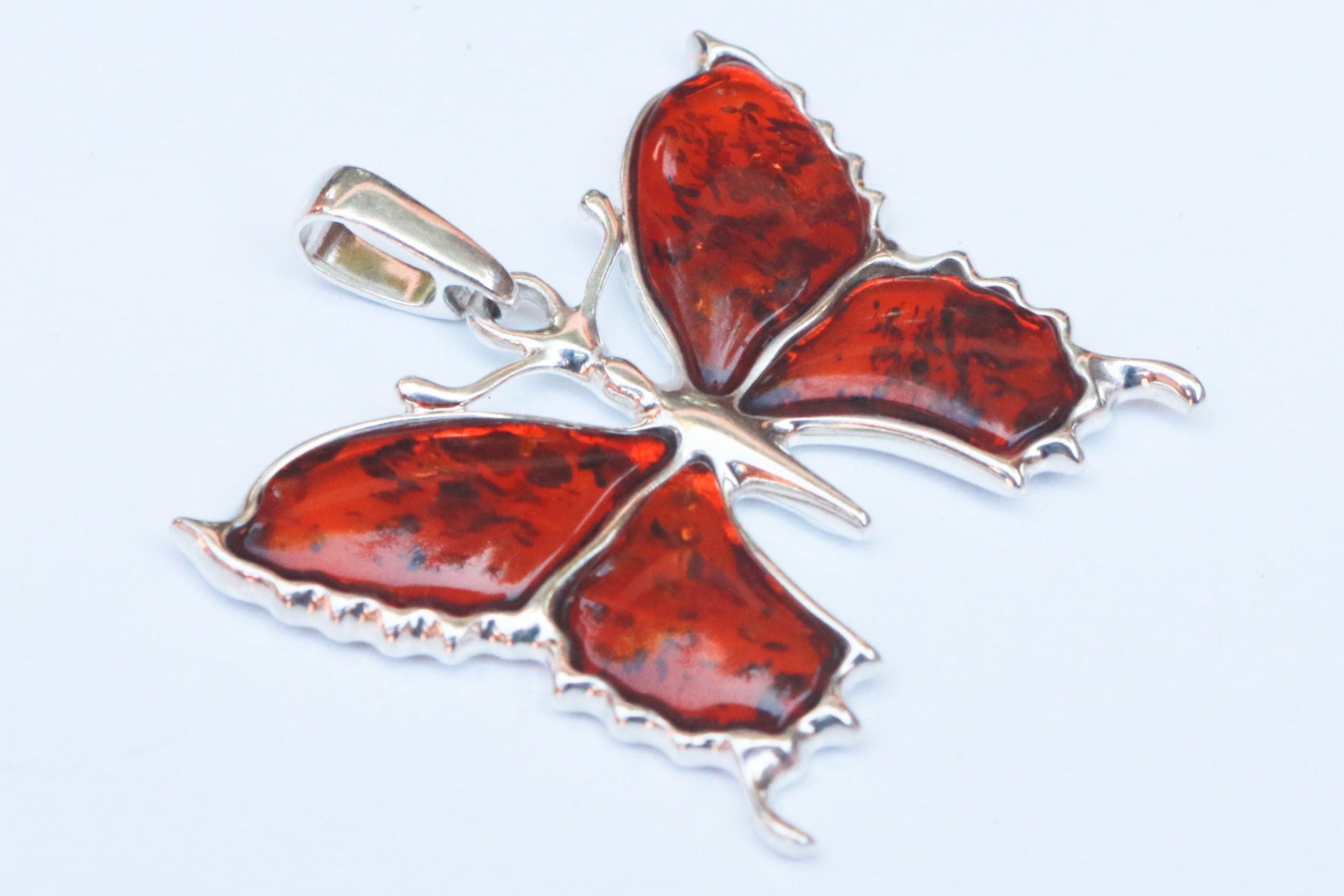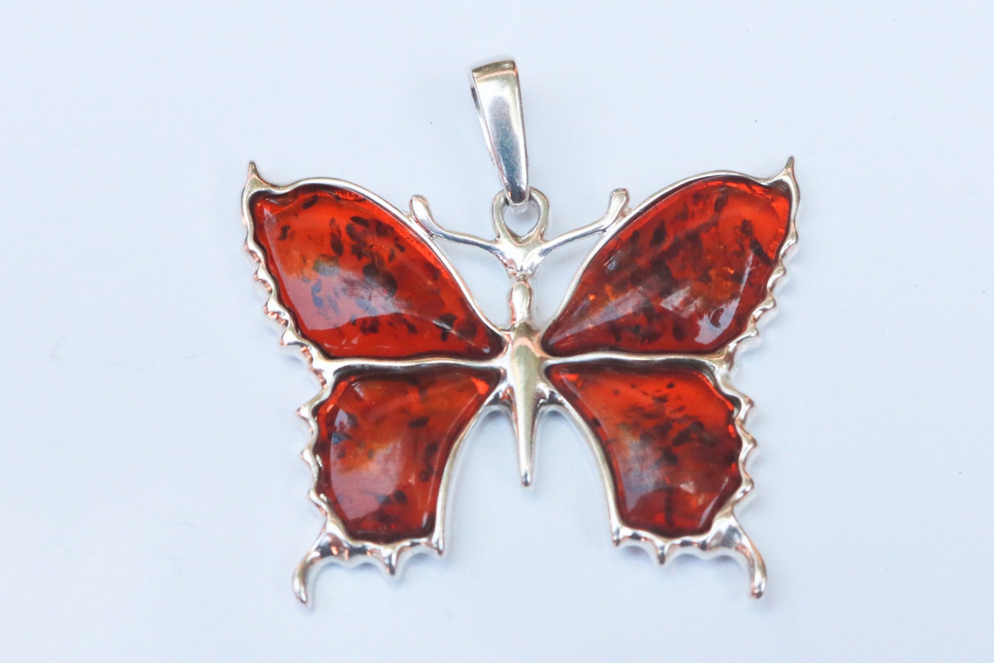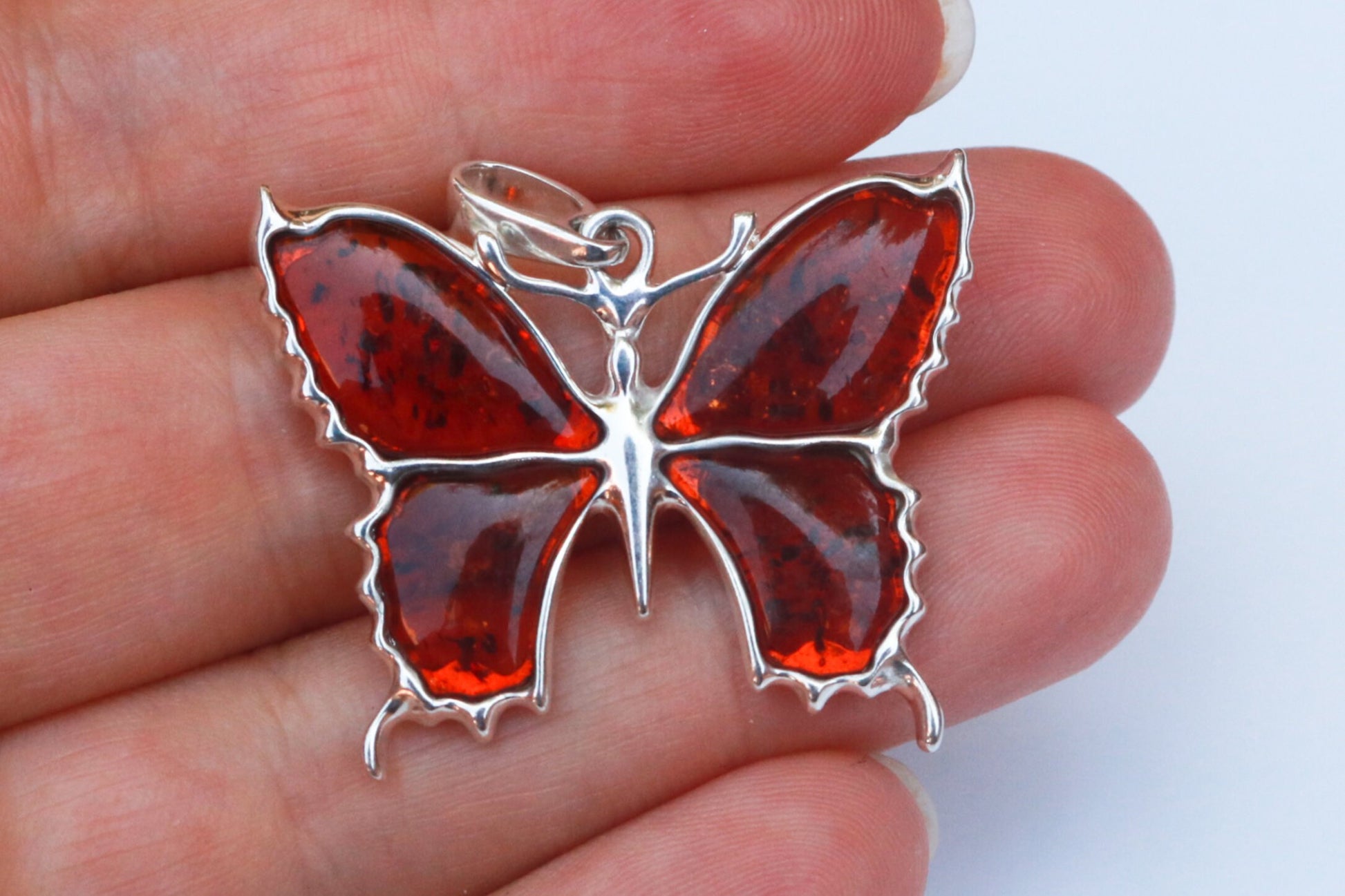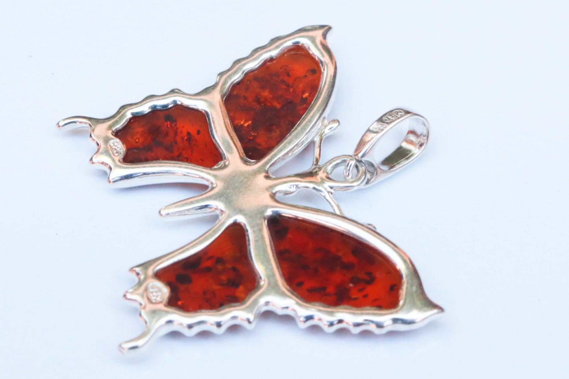 Gorgeous hand crafted Baltic Amber Butterfly pendant in 925 sterling silver