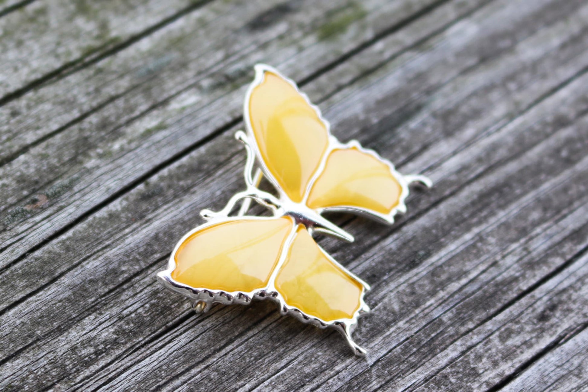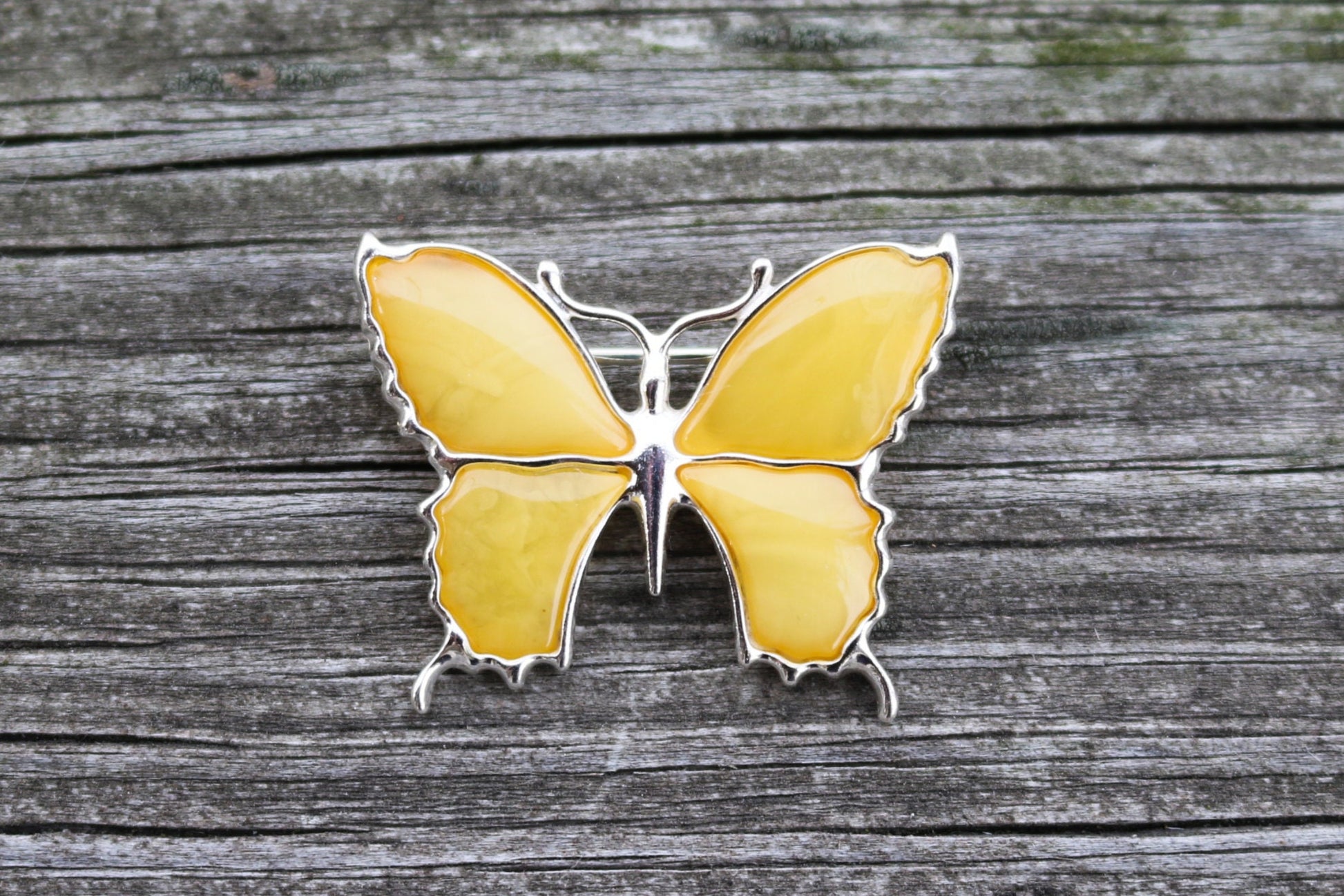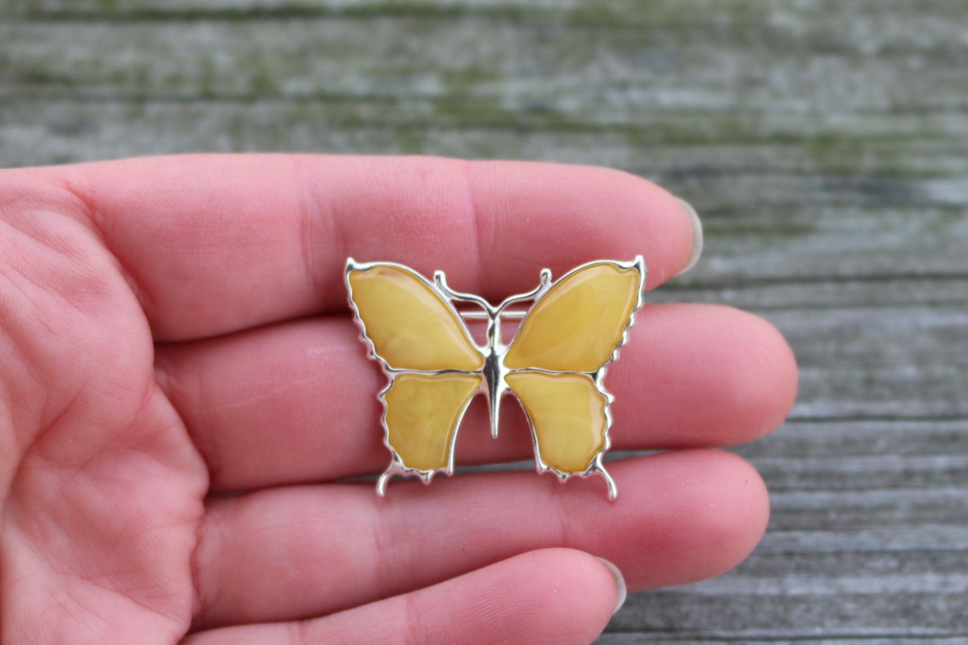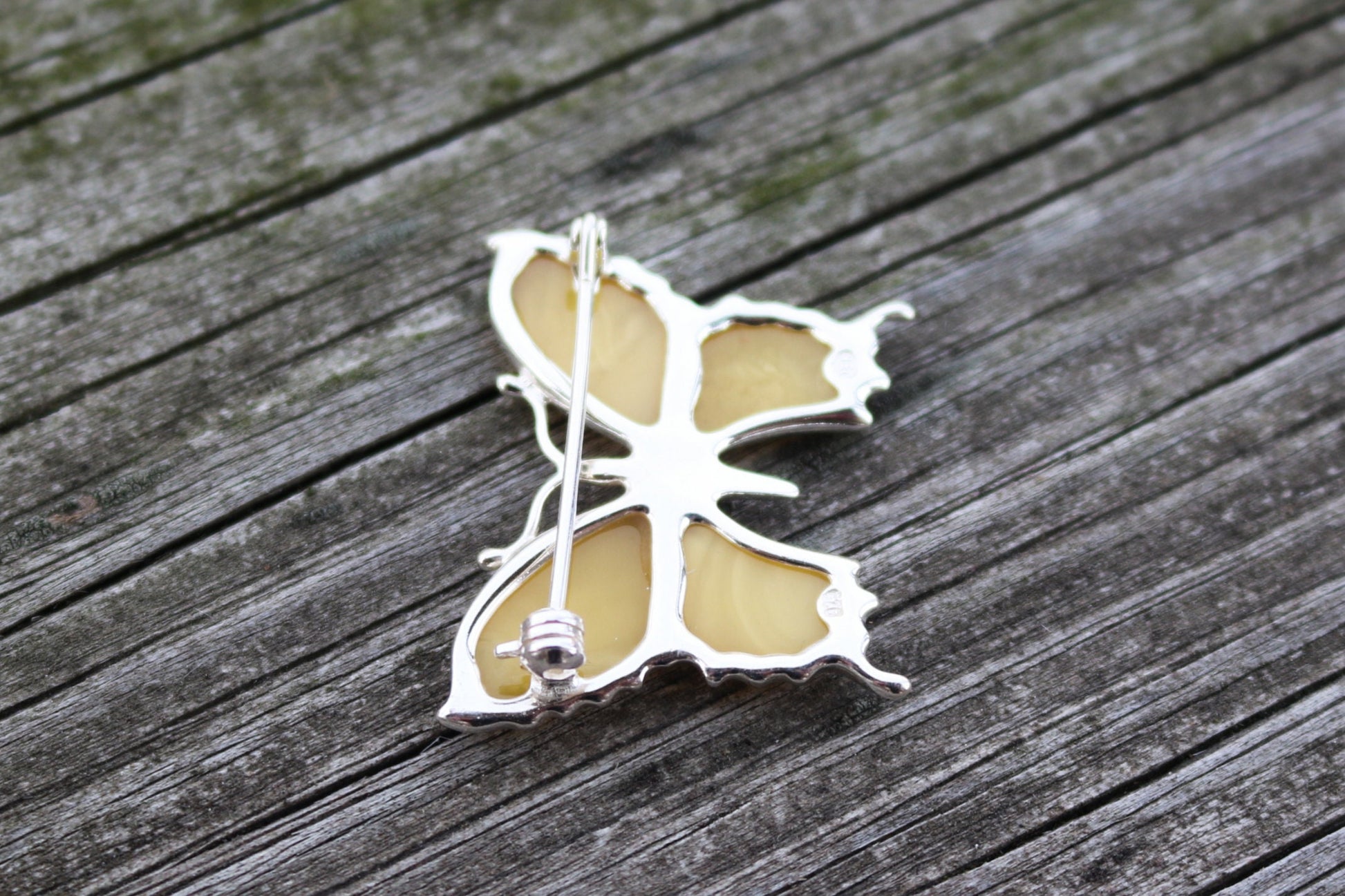 Baltic Amber Butterfly Pin Brooch Butterscotch Milky Natural Untreated Jewelry 925 Silver