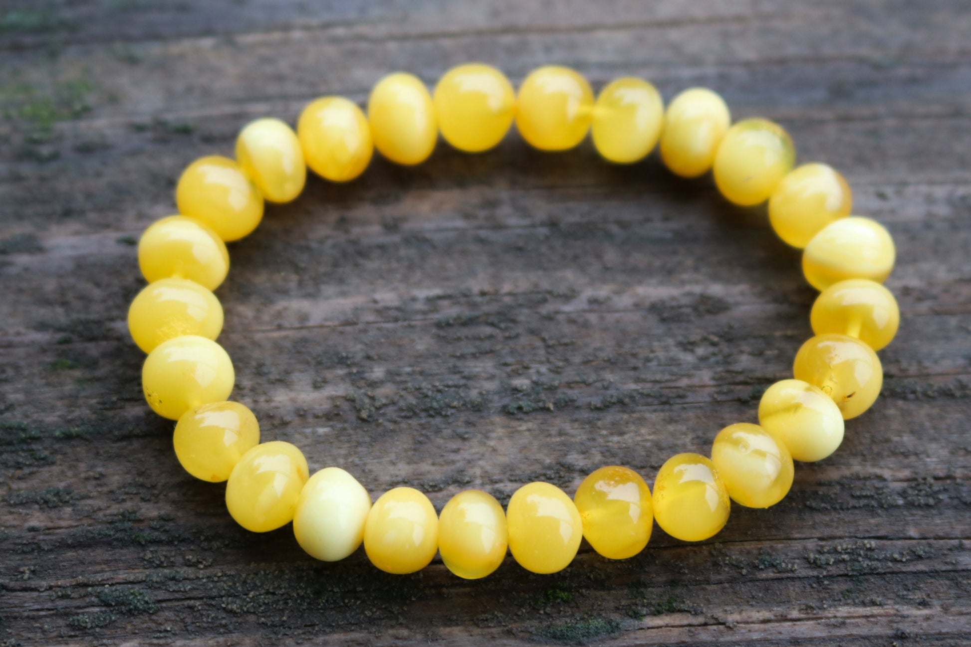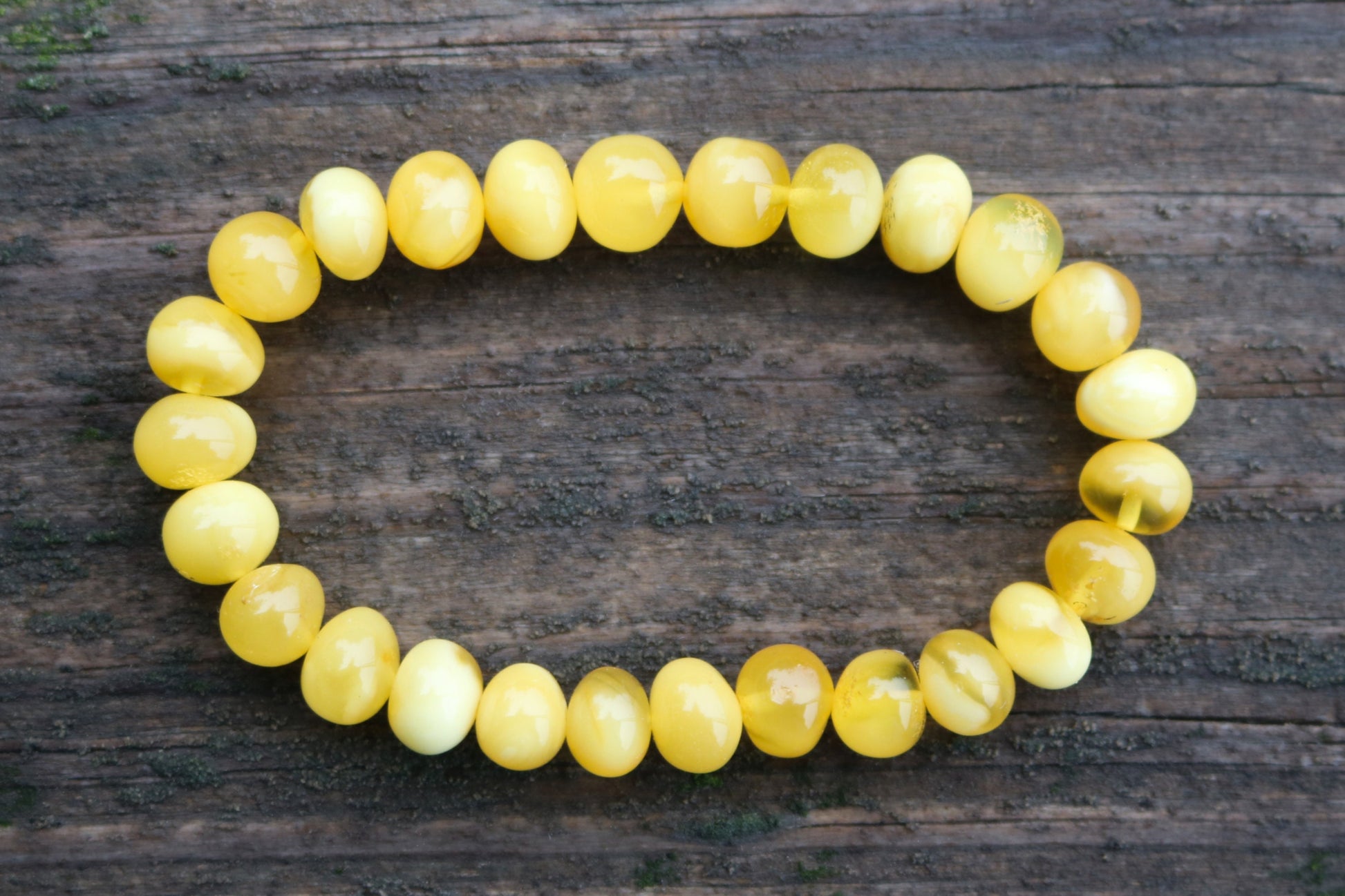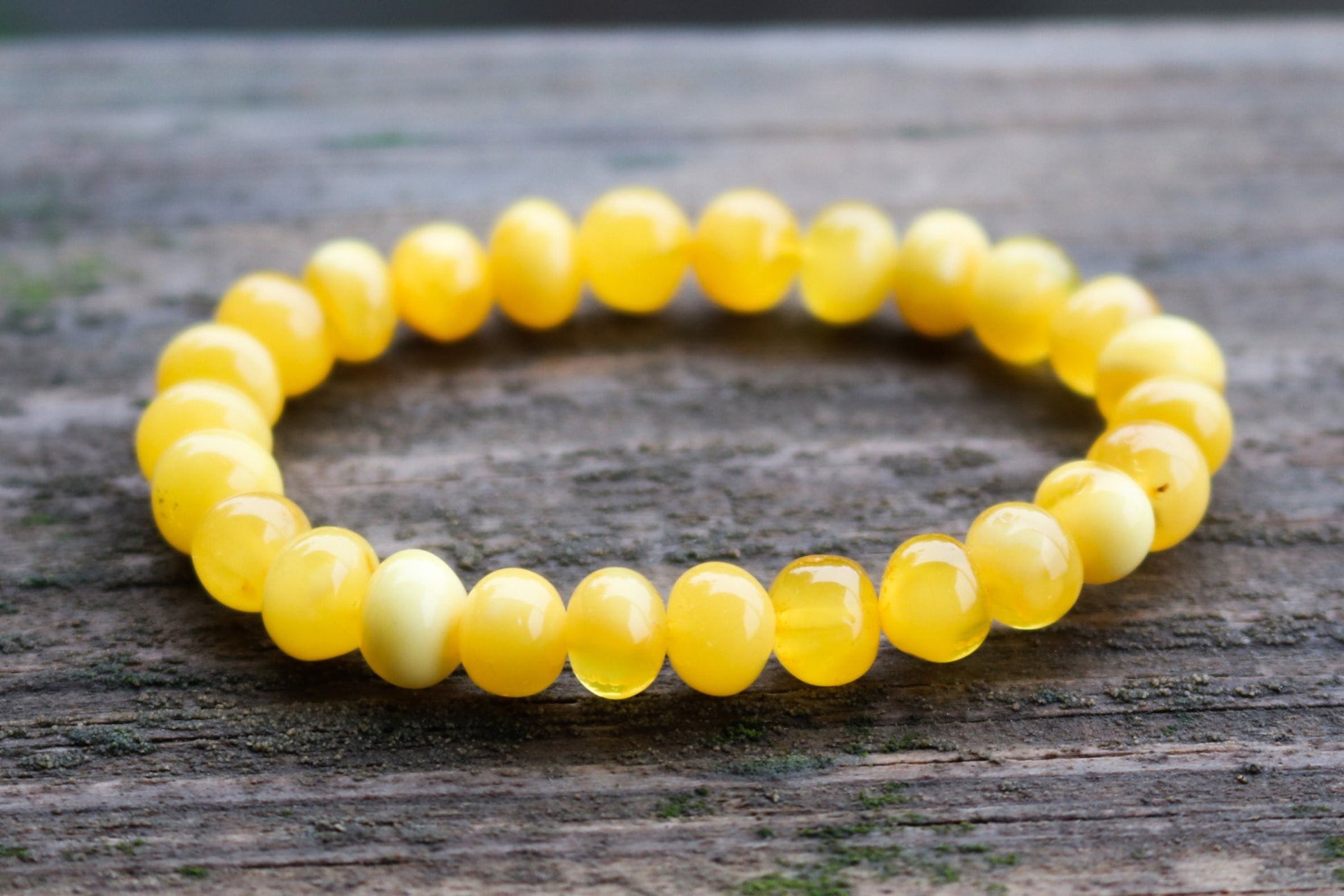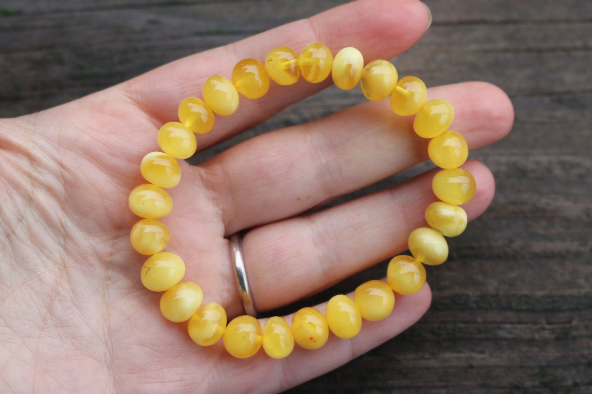 Baltic Amber stretch bracelet made out of baroque round beads in natural untreated butterscotch color with milky swirls.