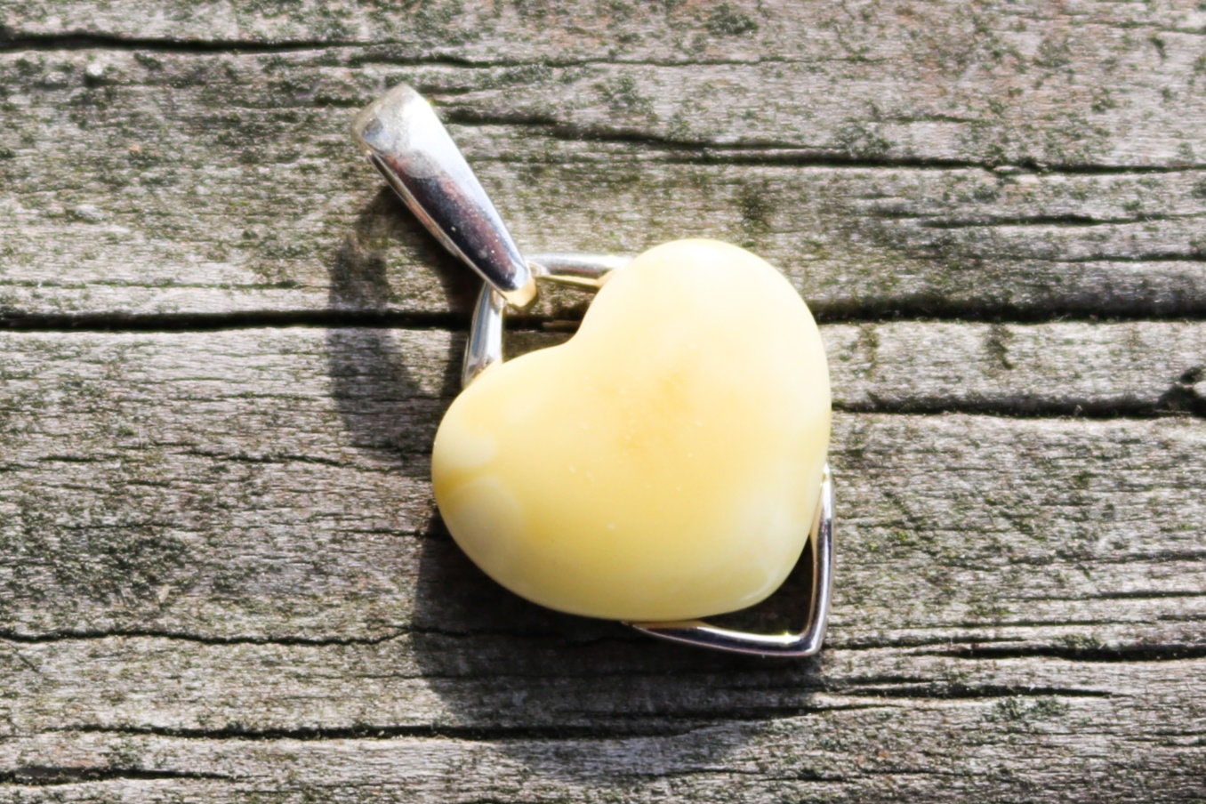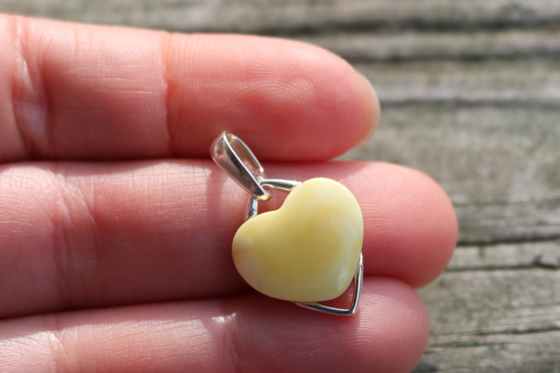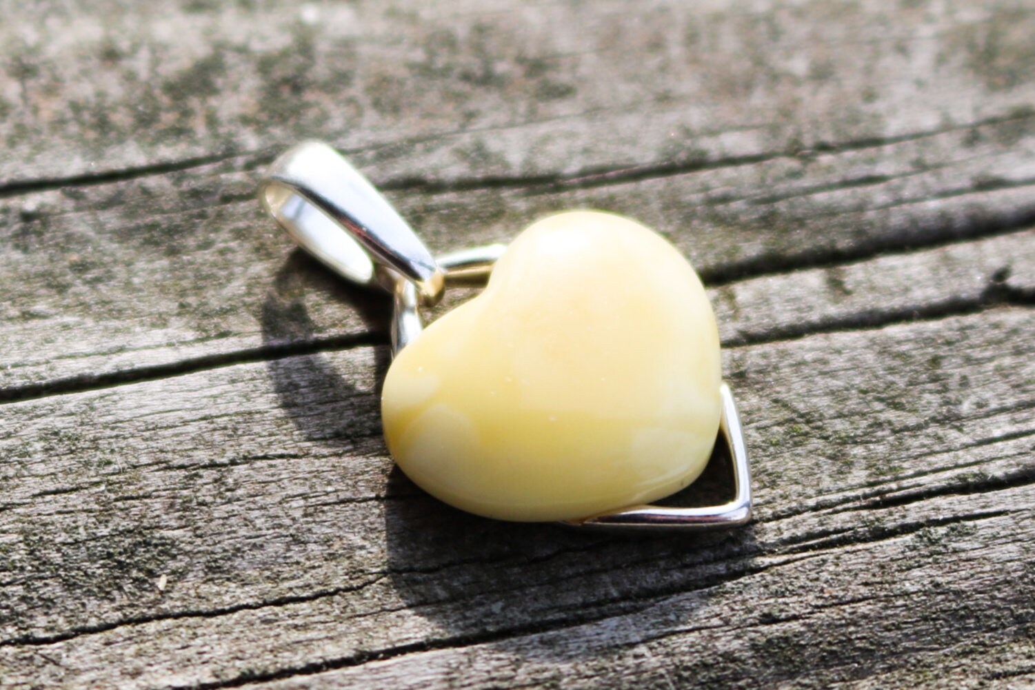 Baltic Amber delicate heart pendant in butterscotch color. Set in 925 sterling silver.