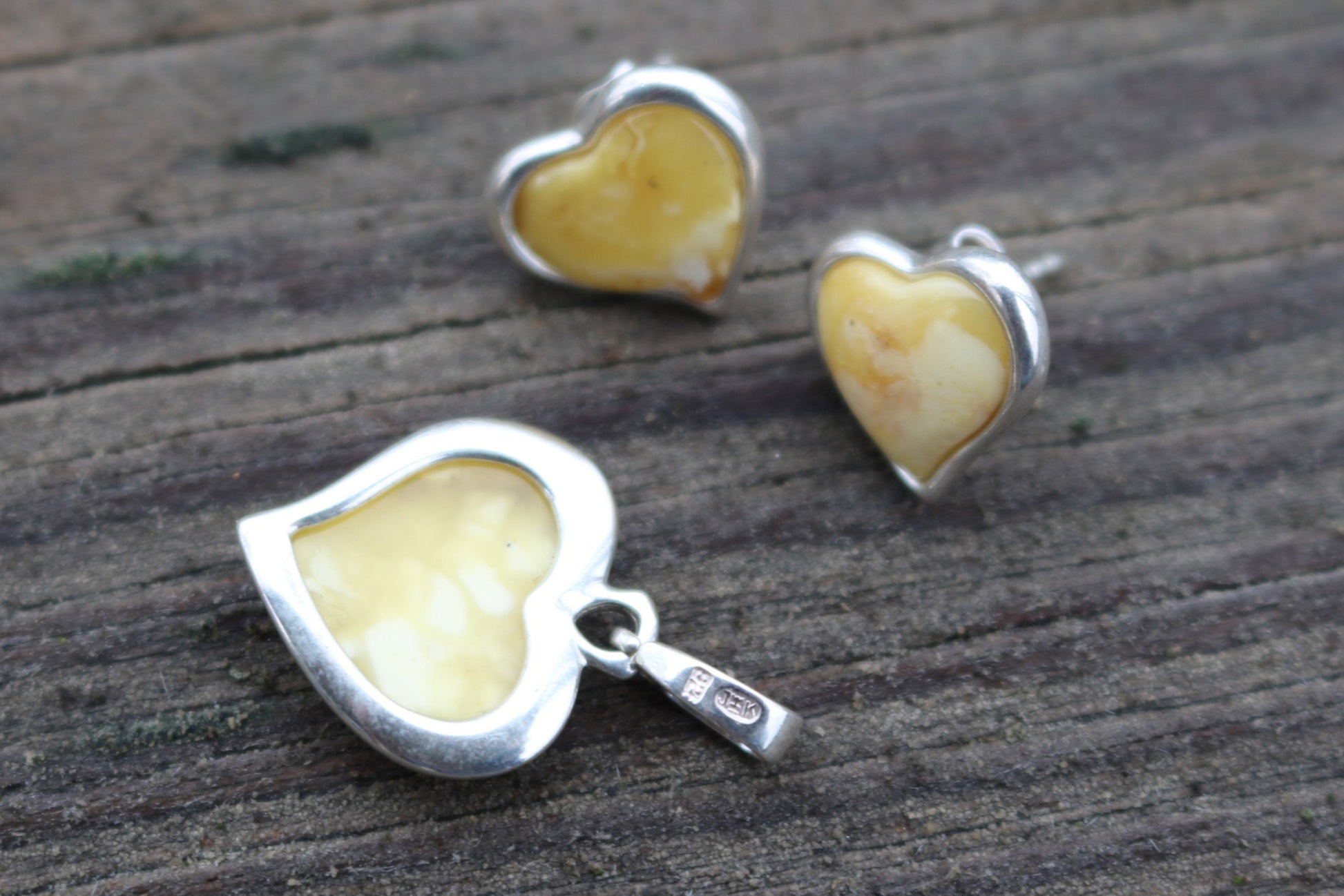 Baltic Amber Butterscotch Jewelry Set Heart Pendant and Earrings Natural 925 Silver