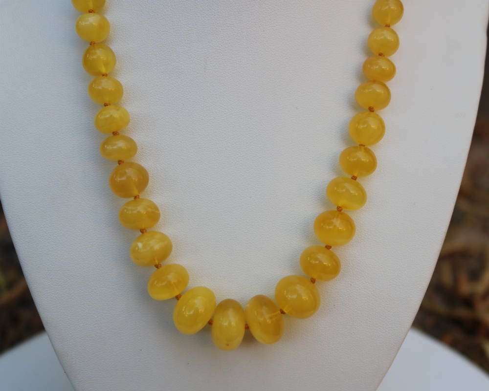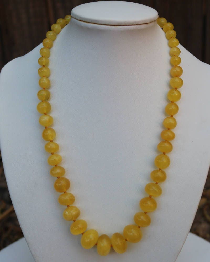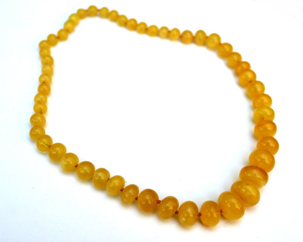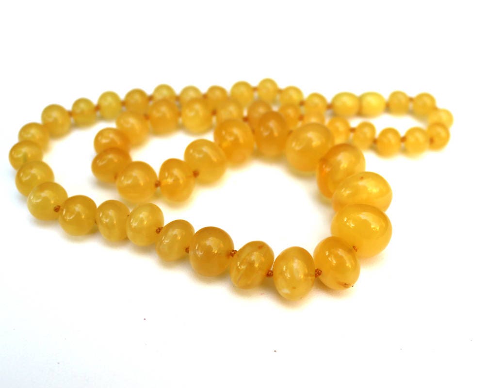 Baltic Amber necklace made out of hand carved baroque shape rounded beads in yellow cloudy butterscotch color. This is natural untreated color. The beads are polished.