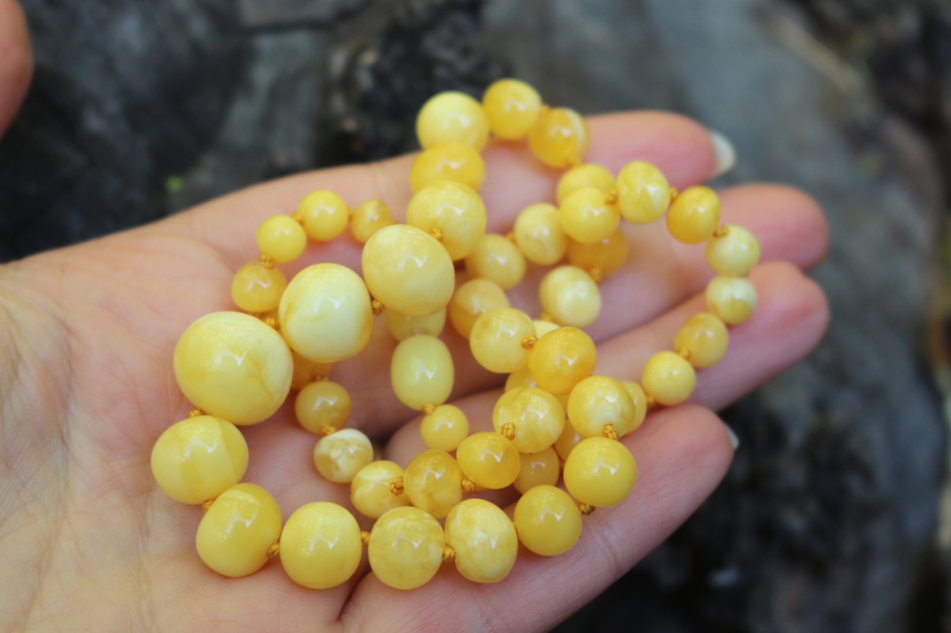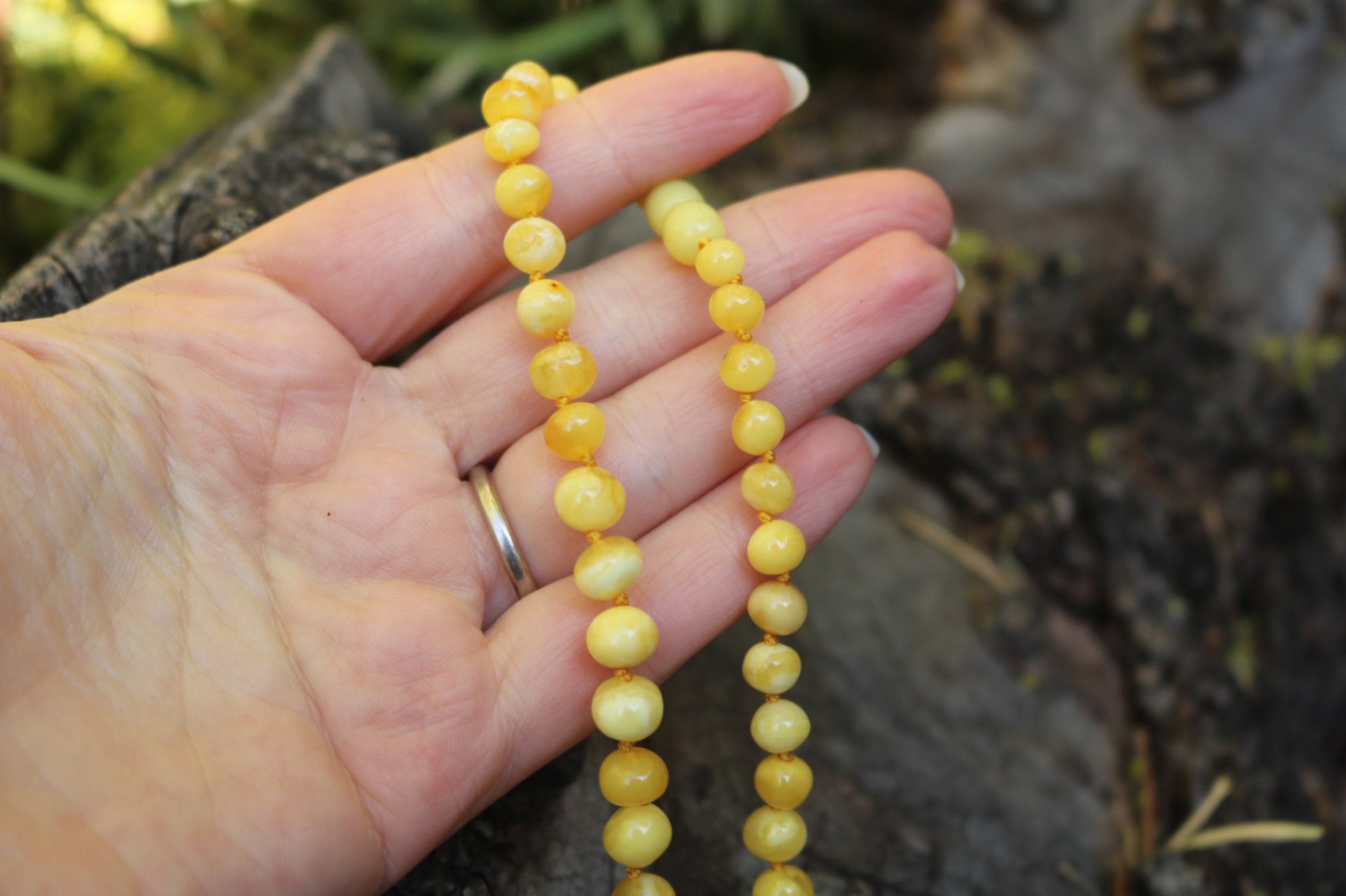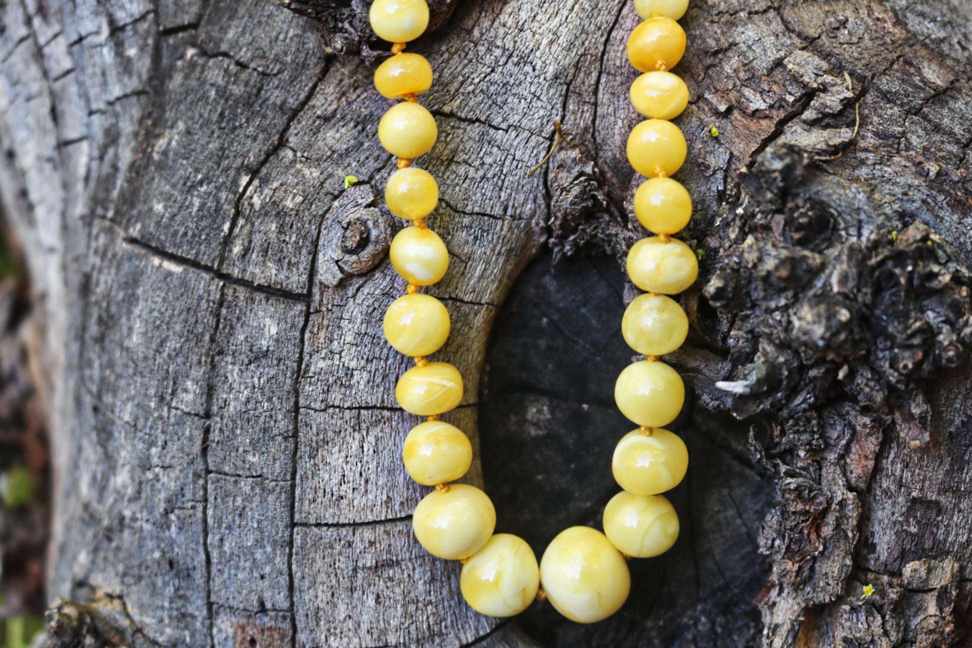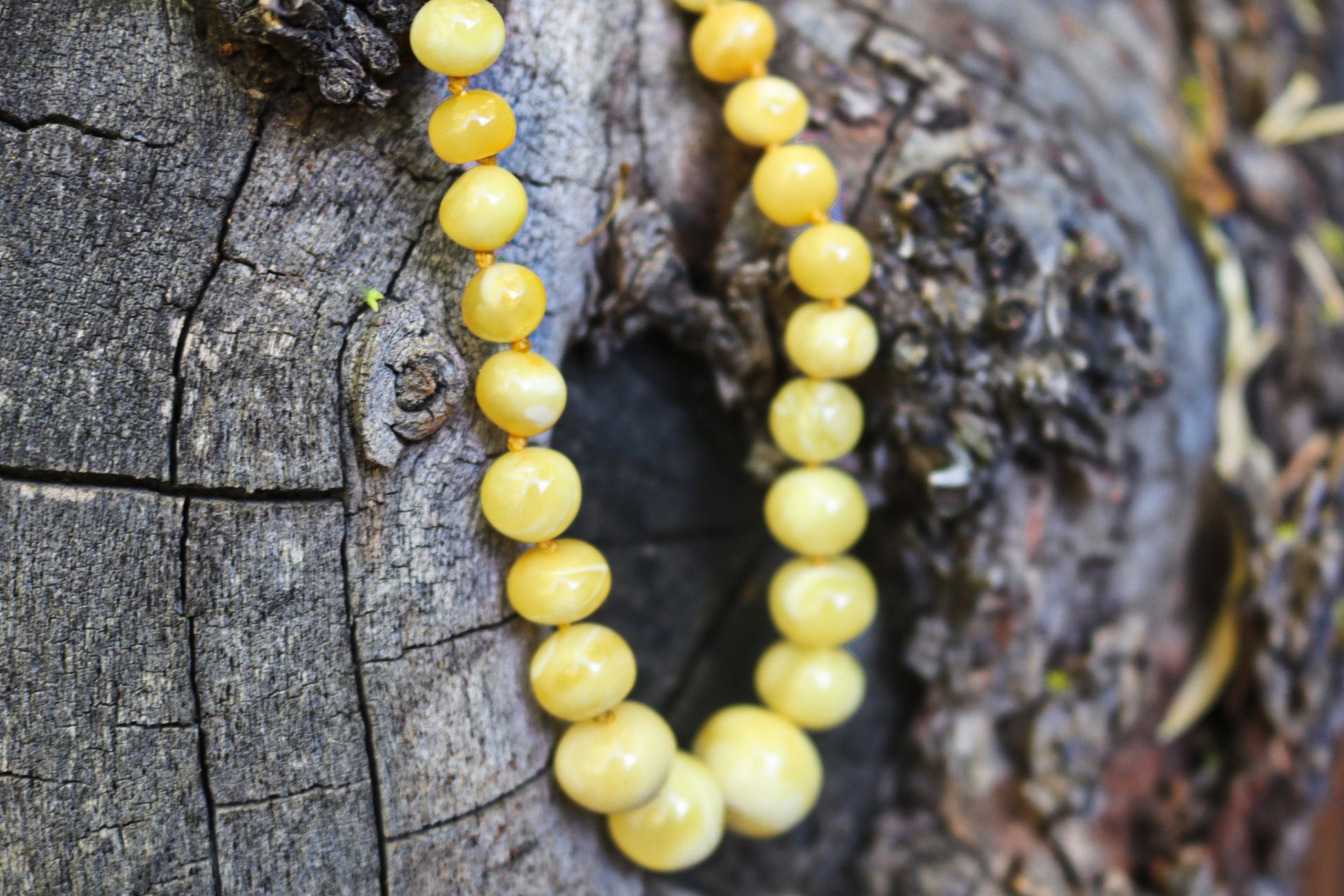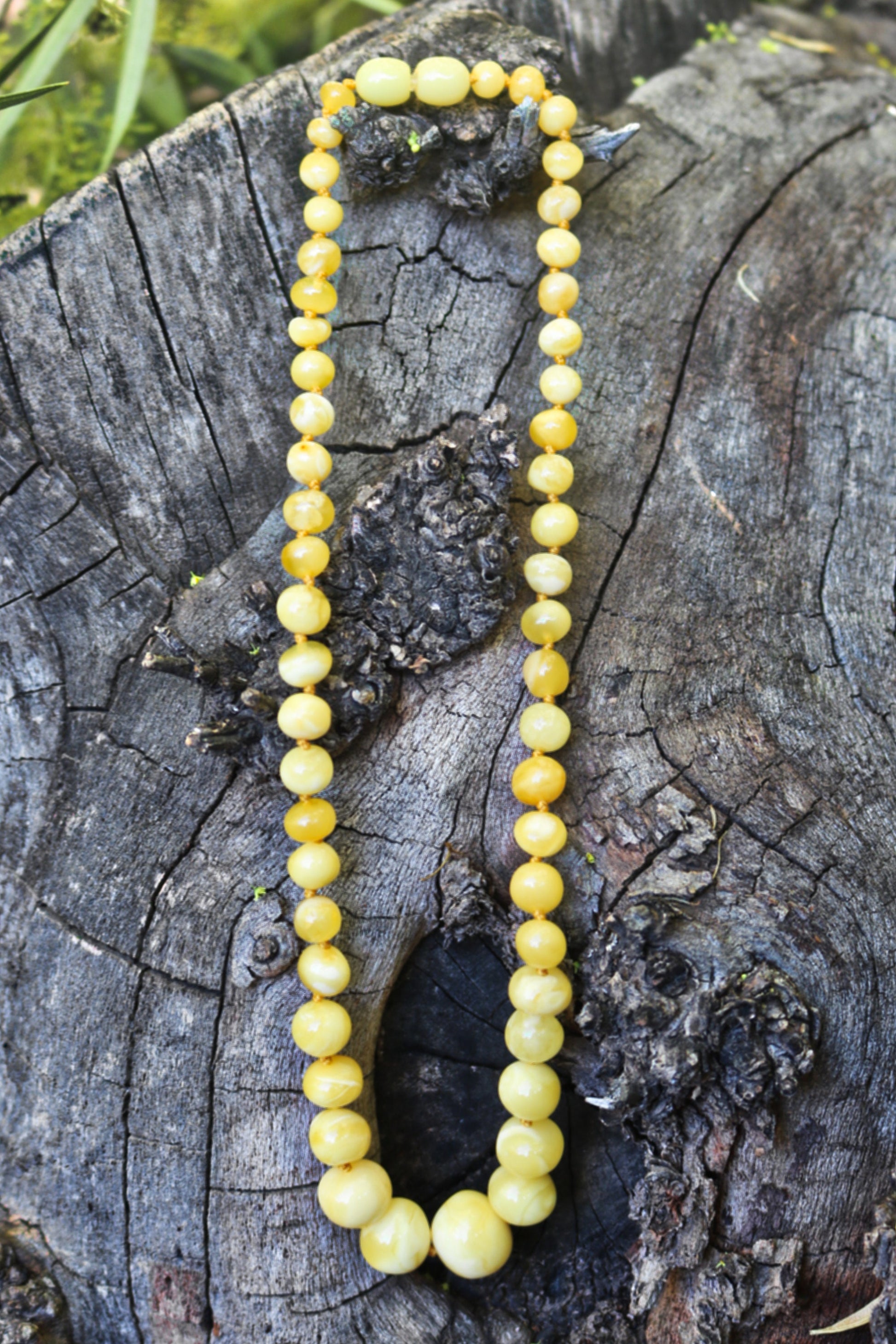 Baltic Amber necklace made out of natural untreated polished beads in rounded baroque shape. Milky opaque color. The beads measure between 0.29 and 0.54 in diameter (0.75 – 1.37 cm).