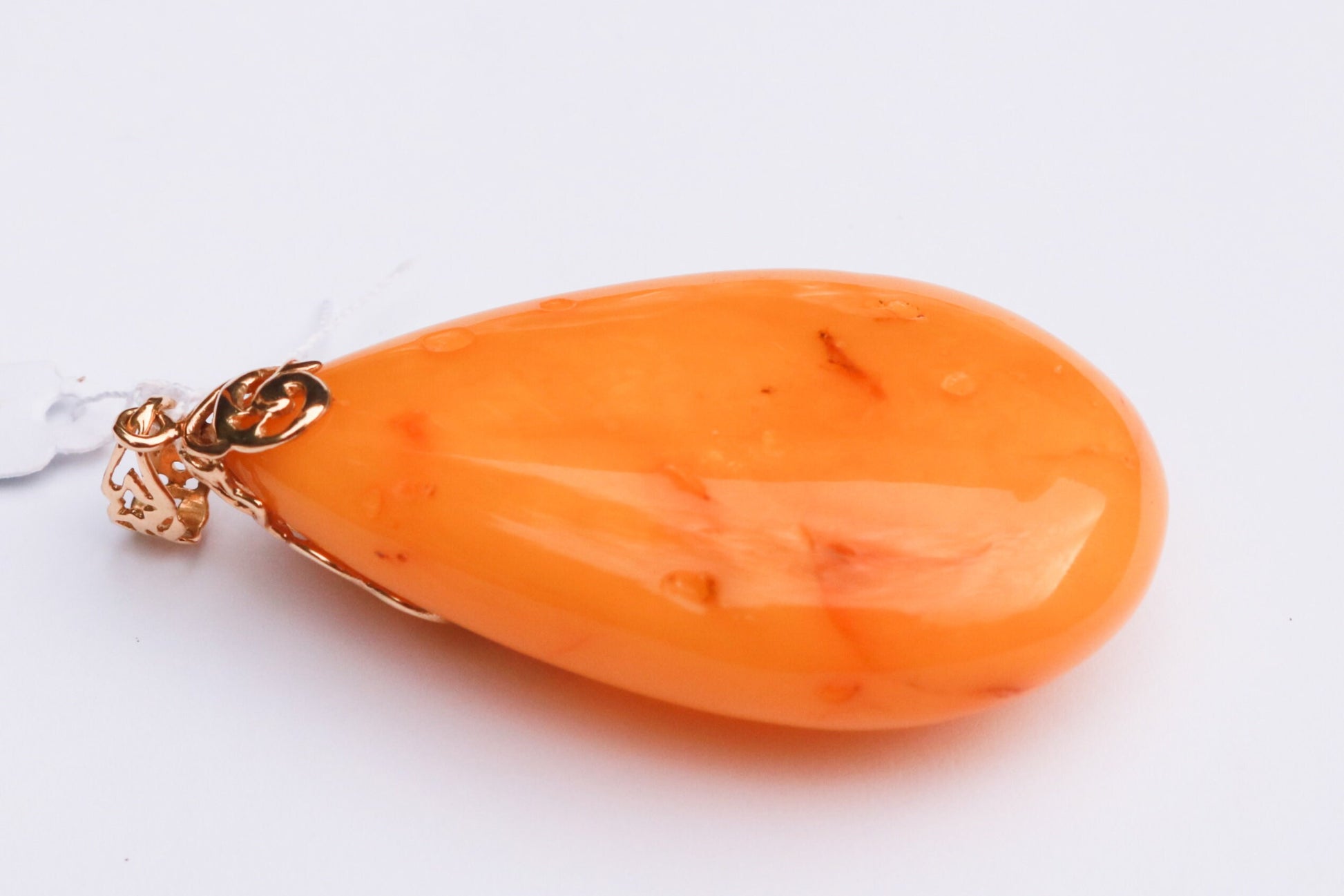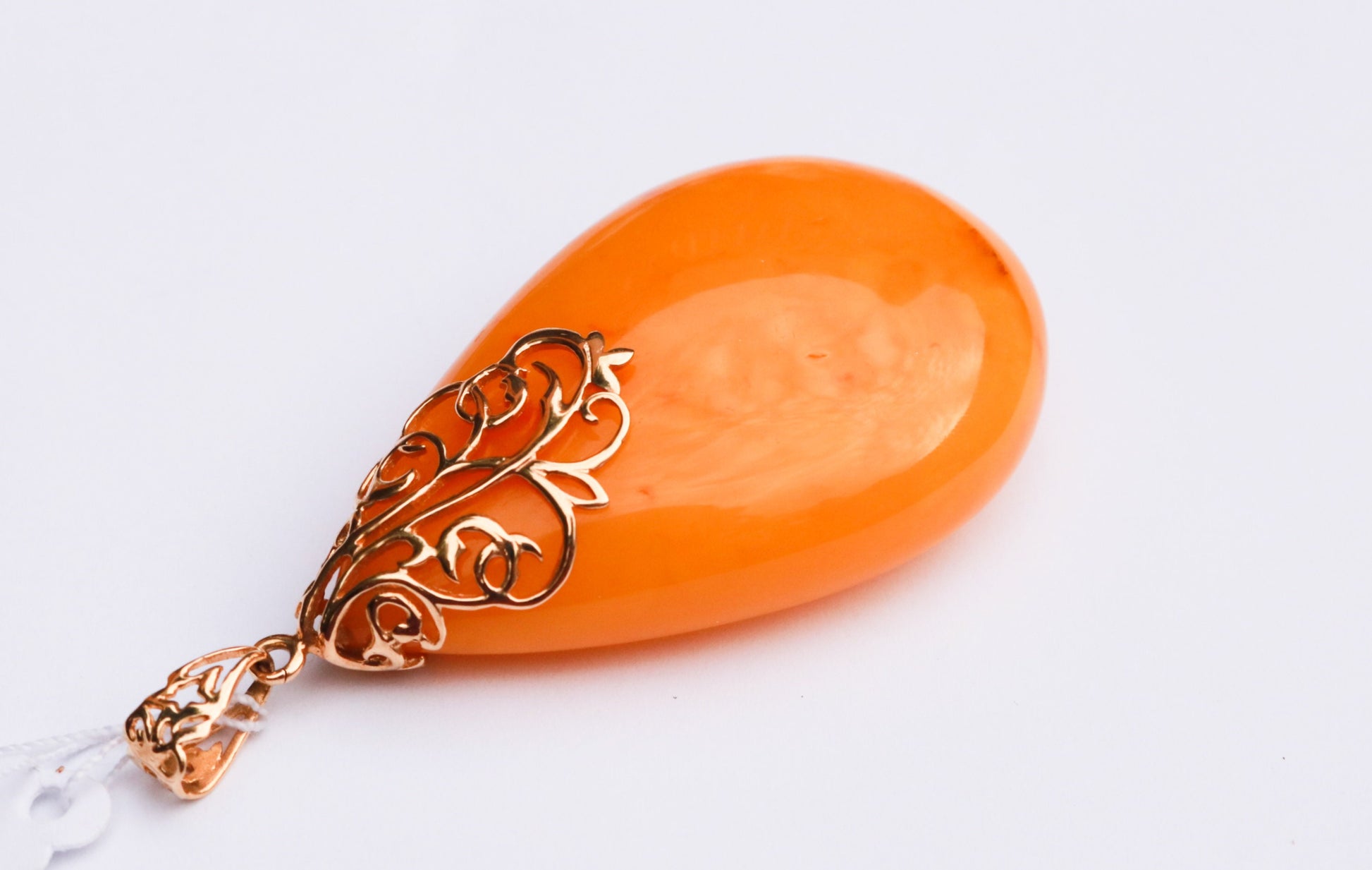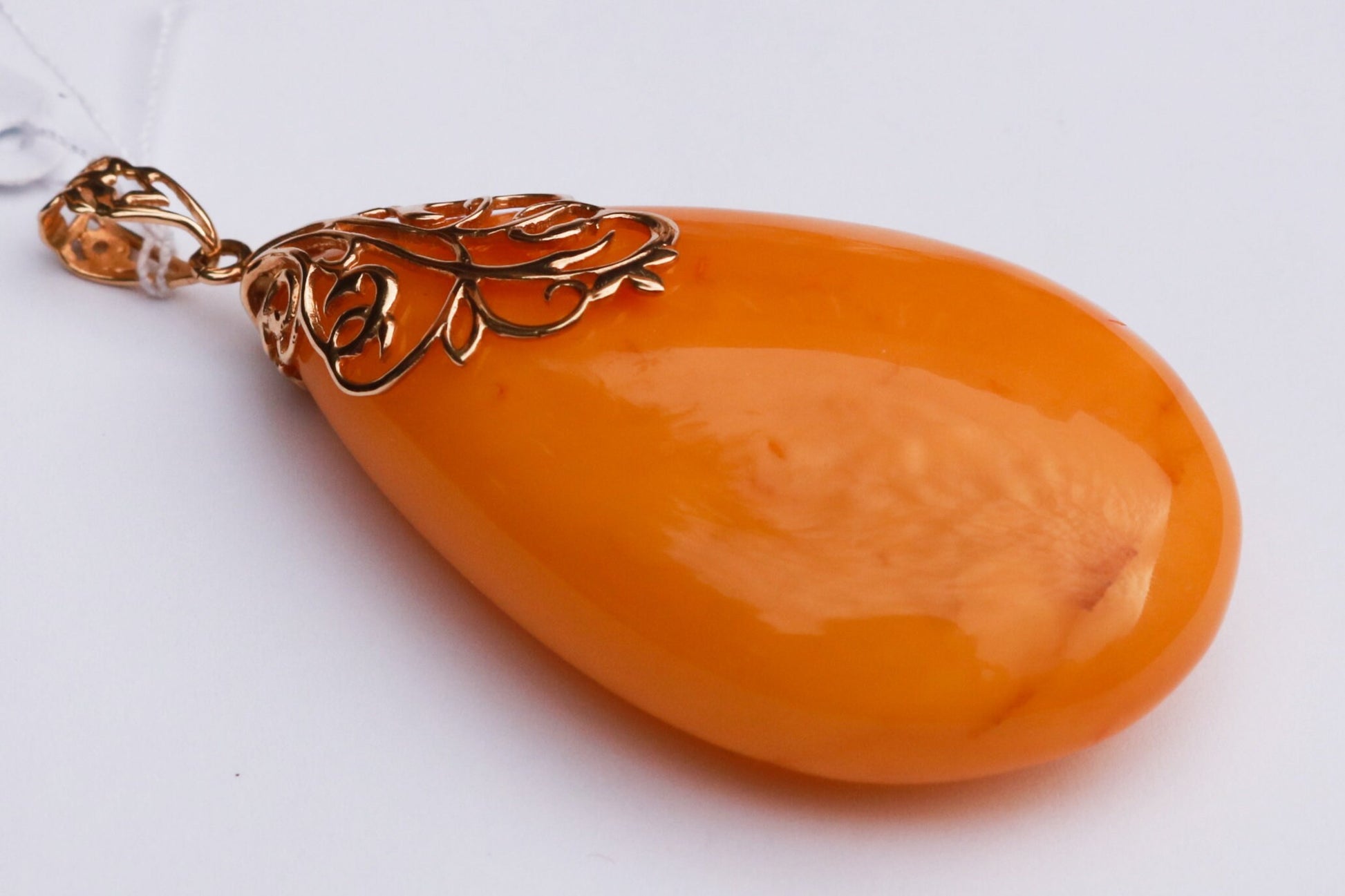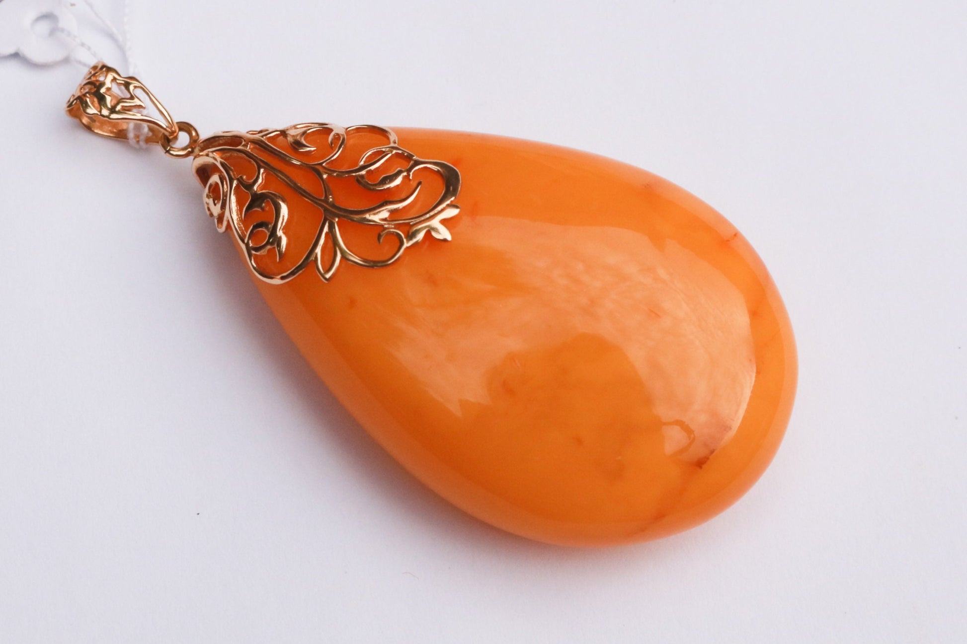 Baltic Amber pendant in natural butterscotch (egg yolk) color. Hand carved as a drop, polished and set in 14K gold. This is natural untreated solid amber.