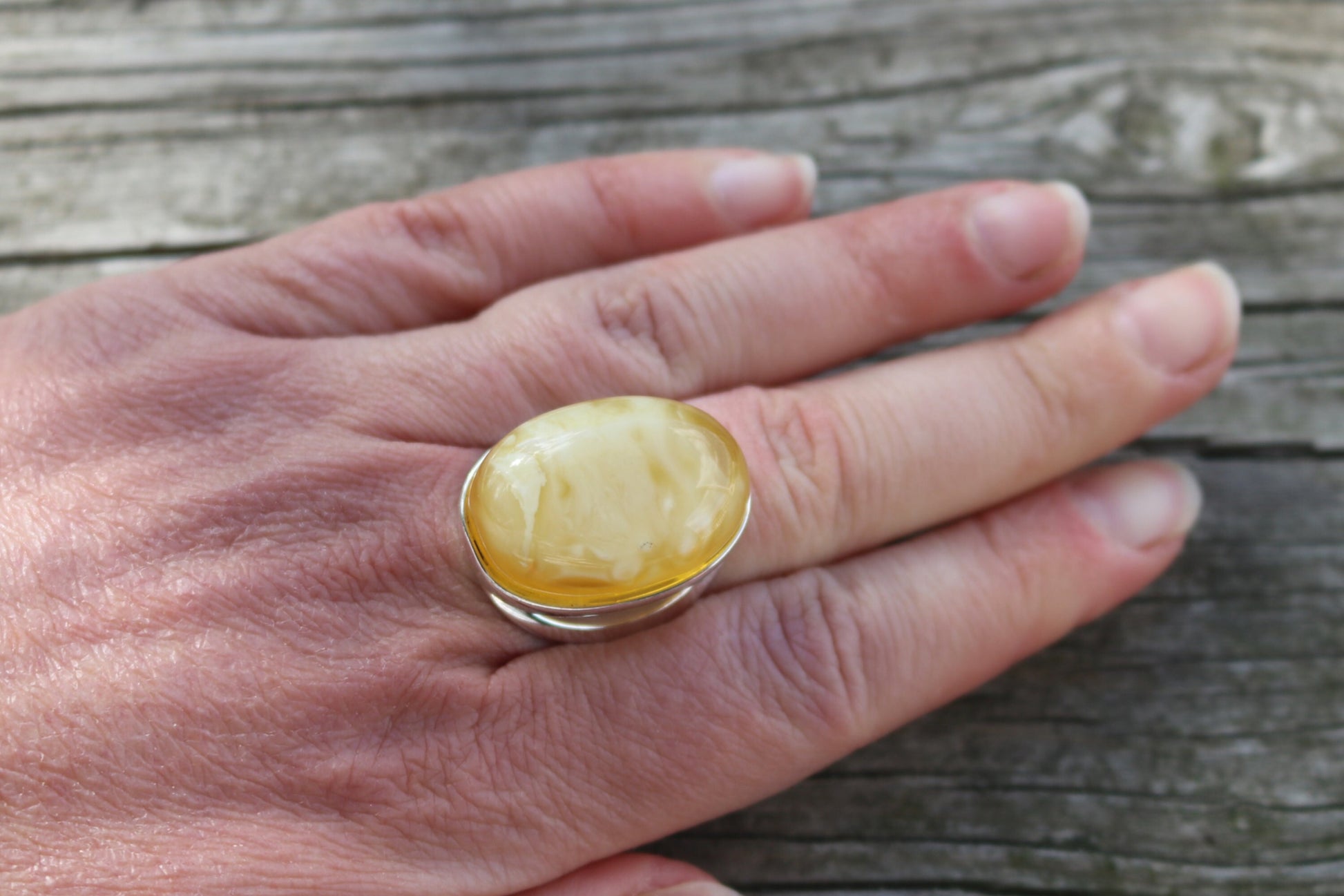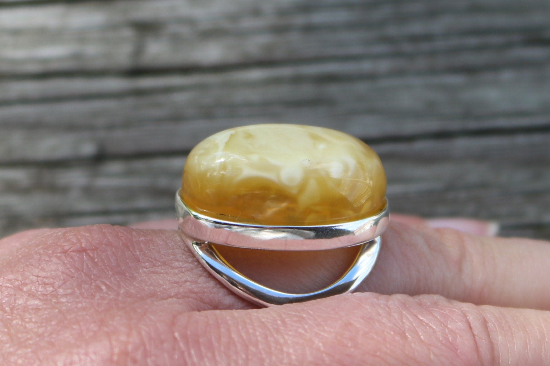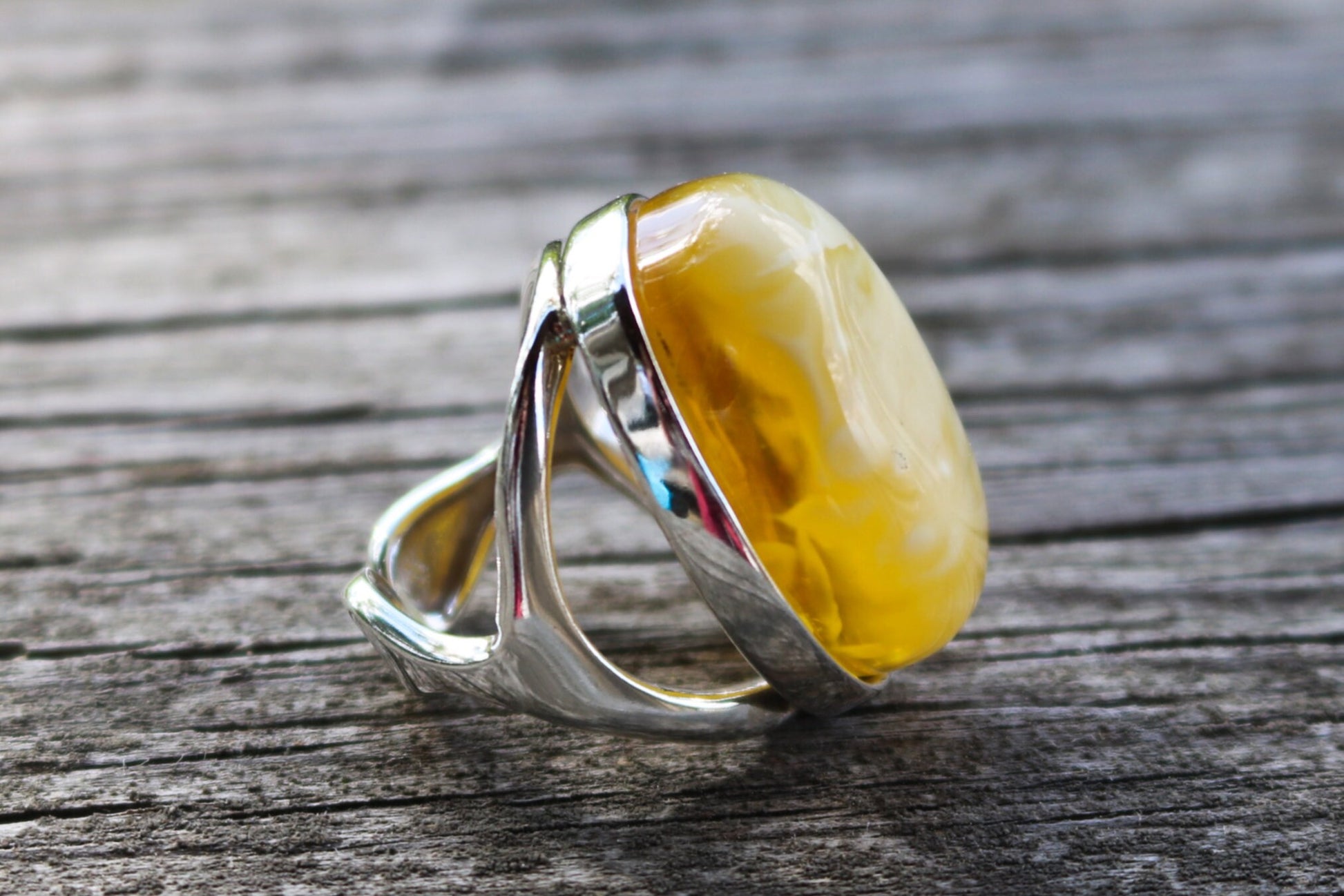 Unique Baltic Amber ring in butterscotch color with milky and cloudy swirls. Set in 925 sterling silver. Natural untreated stone. This ring is adjustable. Will fit any size.
