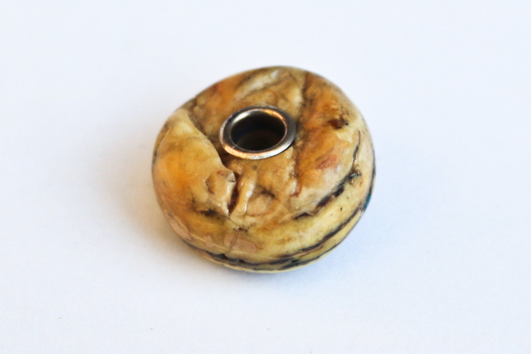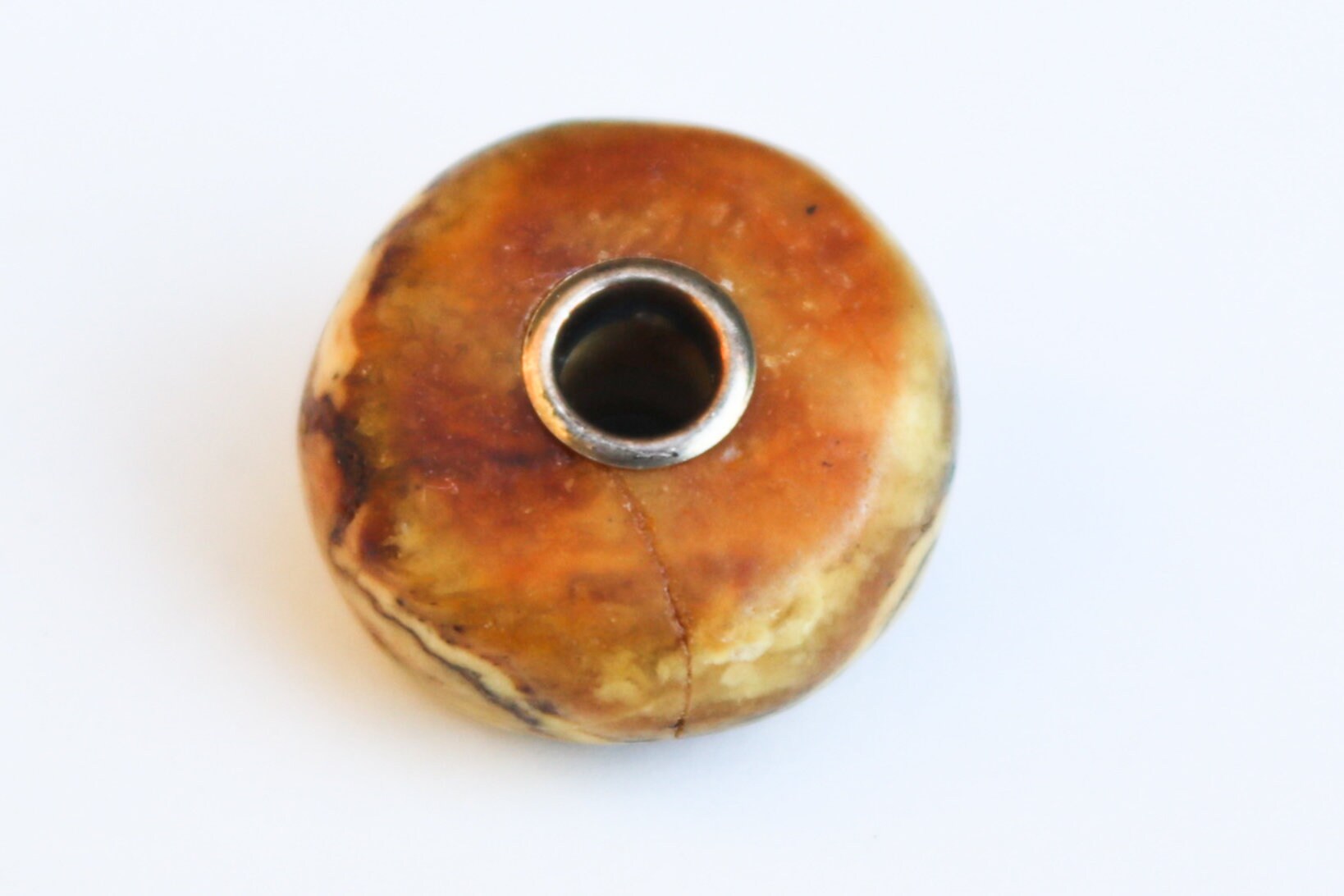 Raw untreated butterscotch amber charm bead. Natural smooth surface with dark caramel swirls and imperfections typical for raw amber.