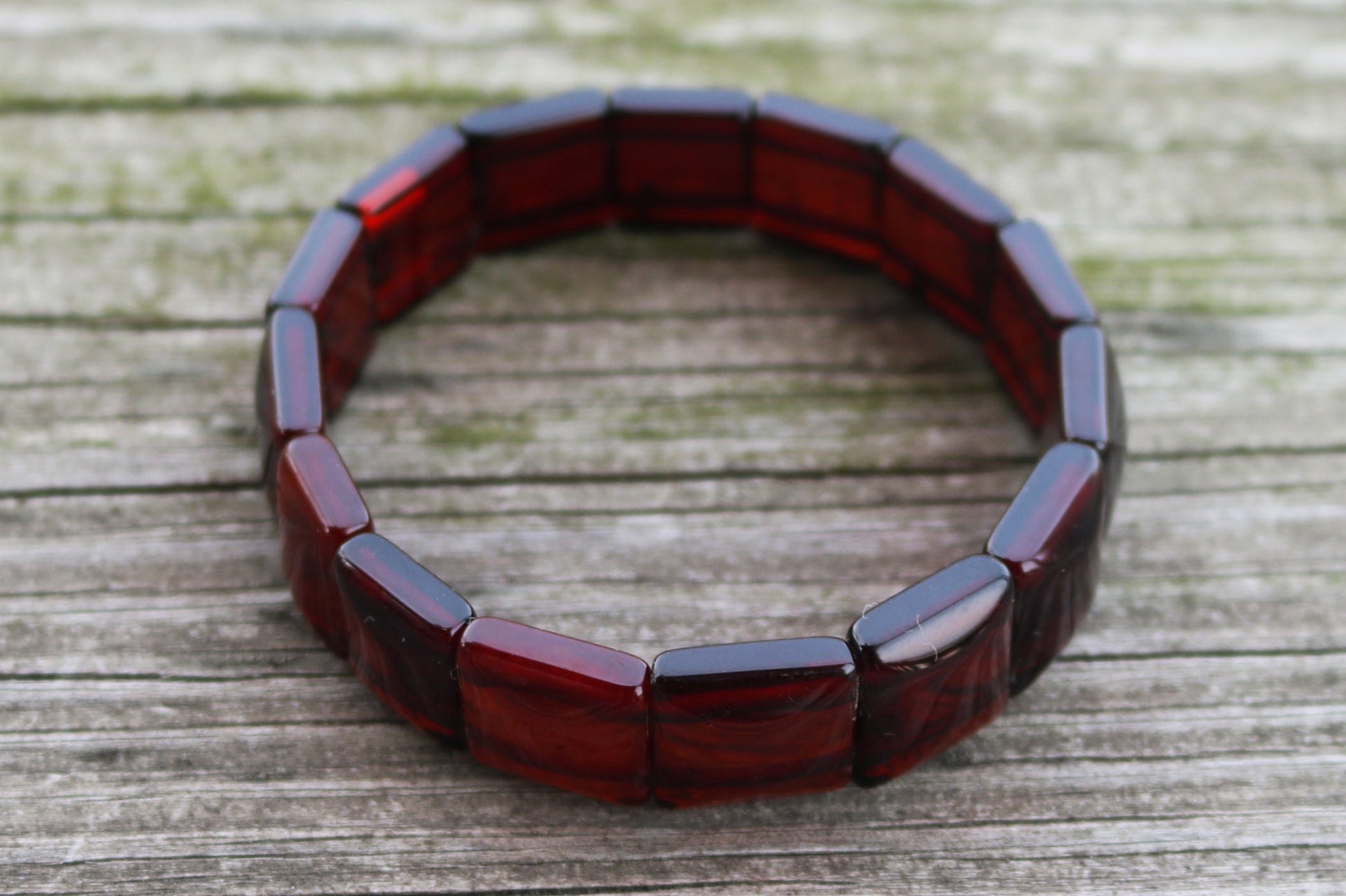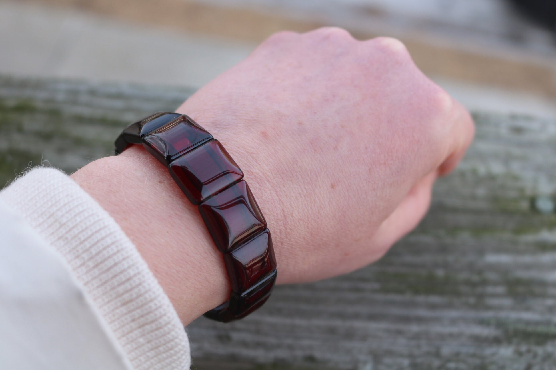 Baltic Amber bracelet in natural translucent cherry color. Shiny polished hand carved square beads.