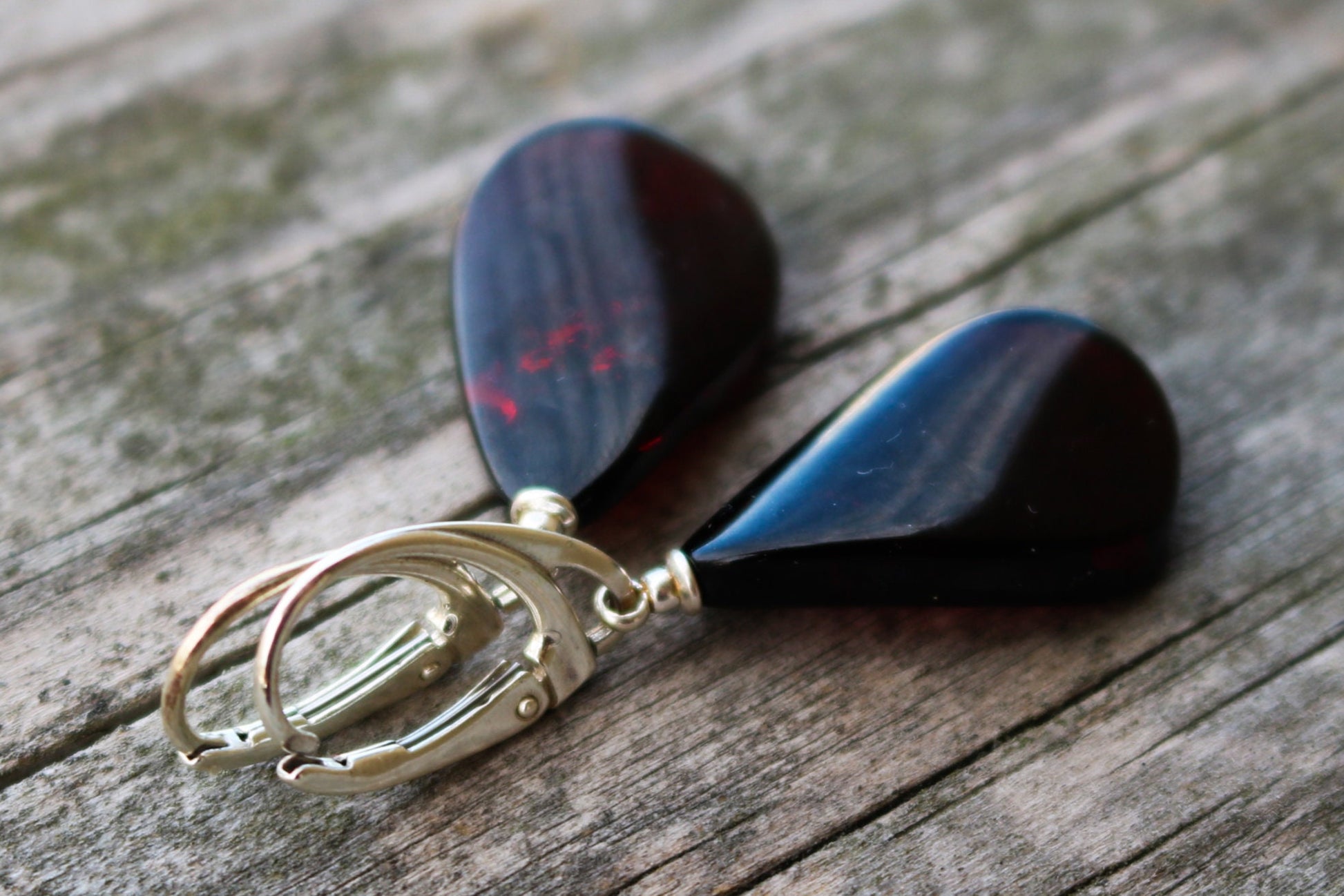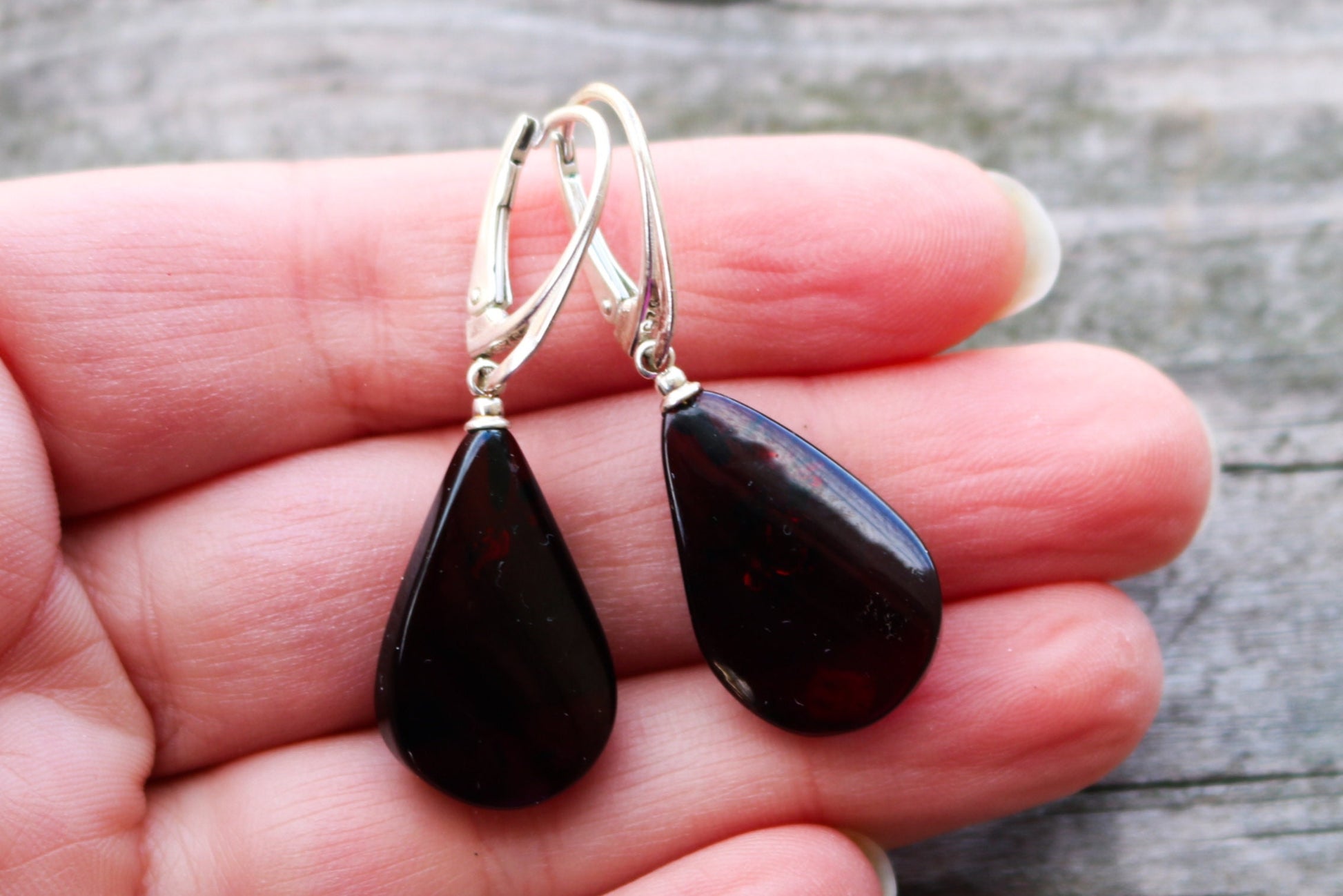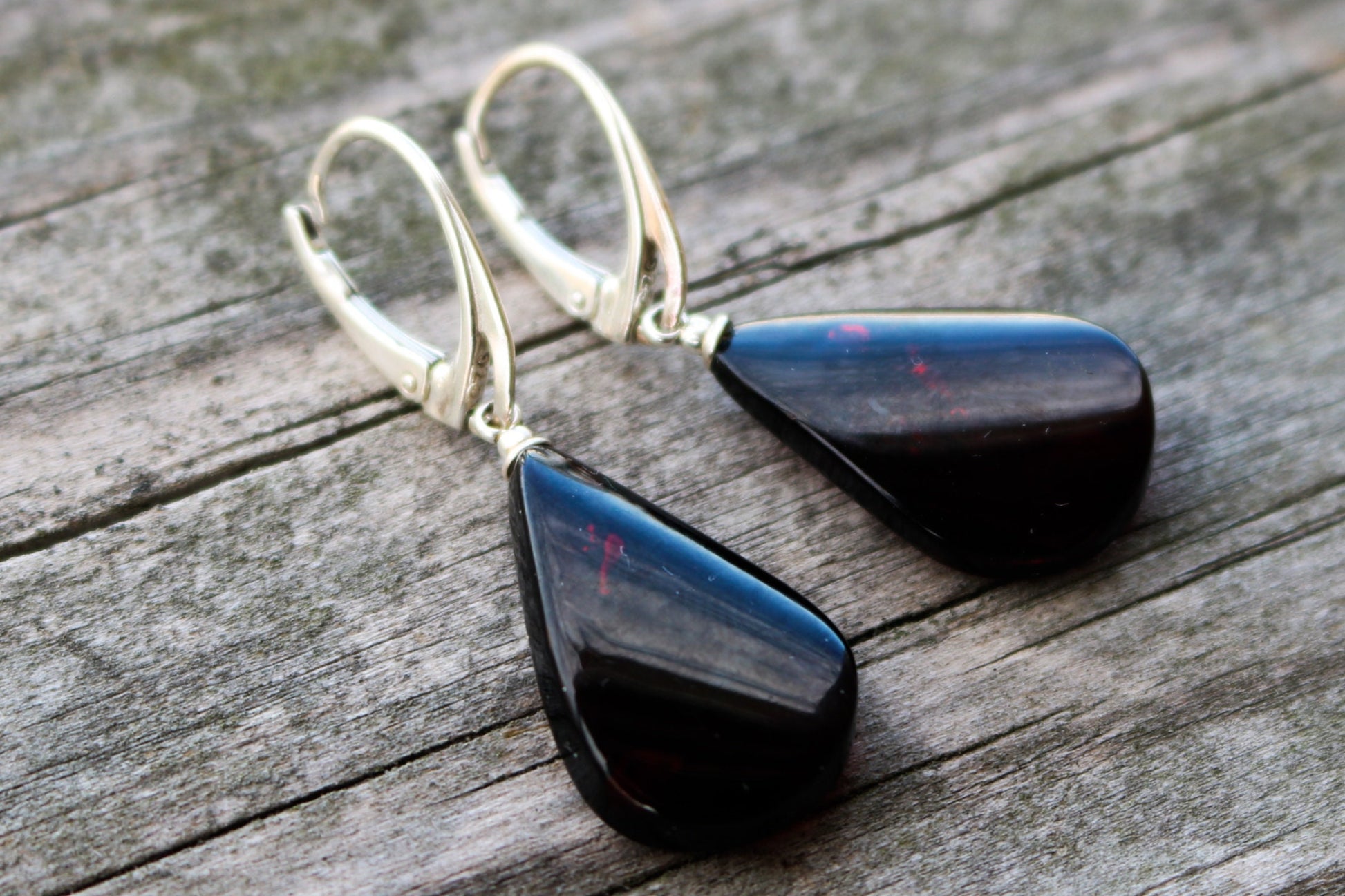 Baltic Amber dangling cherry color earrings hand carved as flat drops. Polished and set in 925 sterling silver.