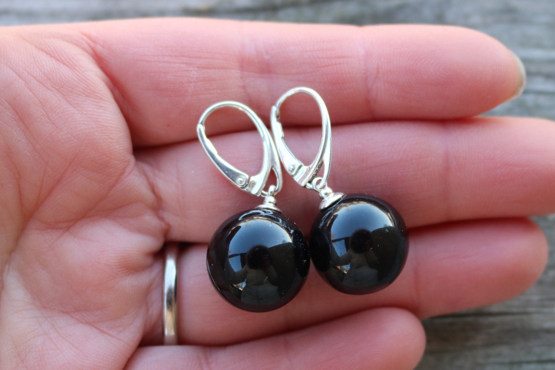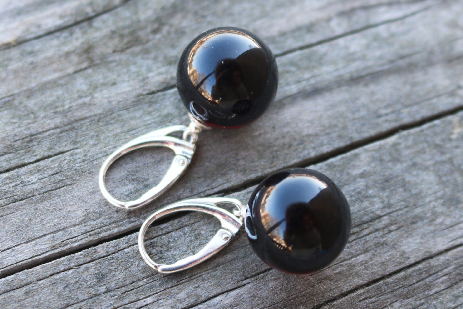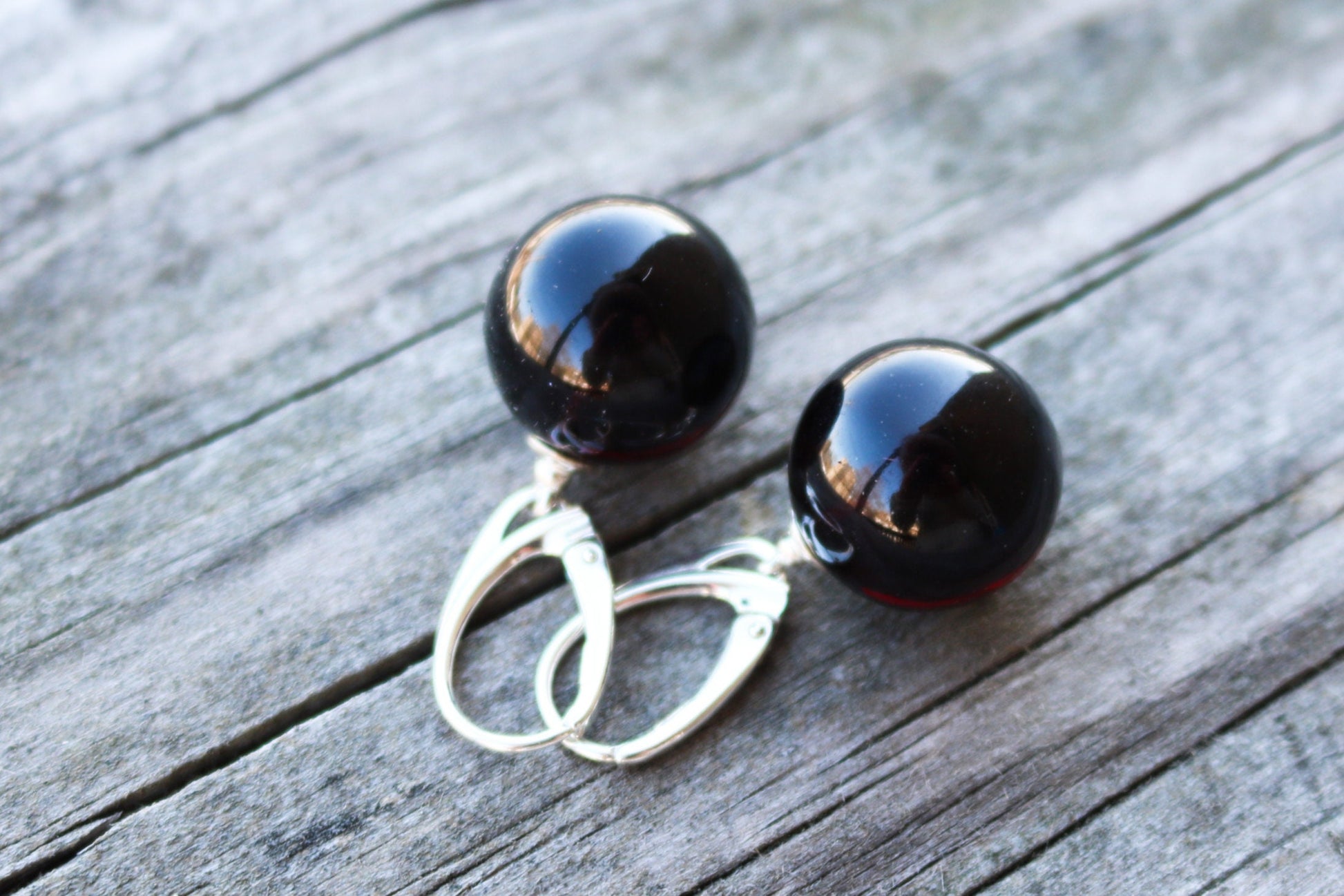 Baltic amber earrings made in dark cherry color. Ideally polished balls, set in 925 sterling silver.