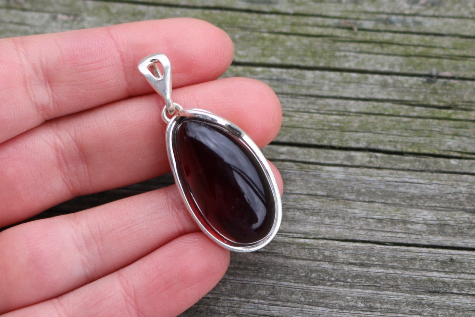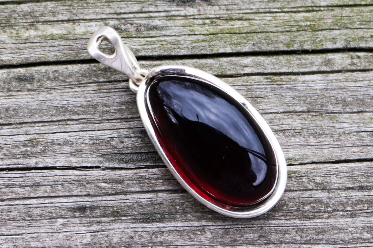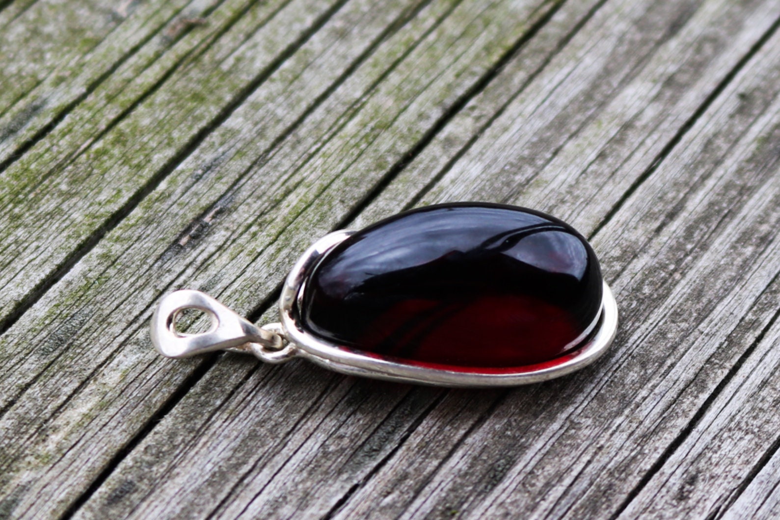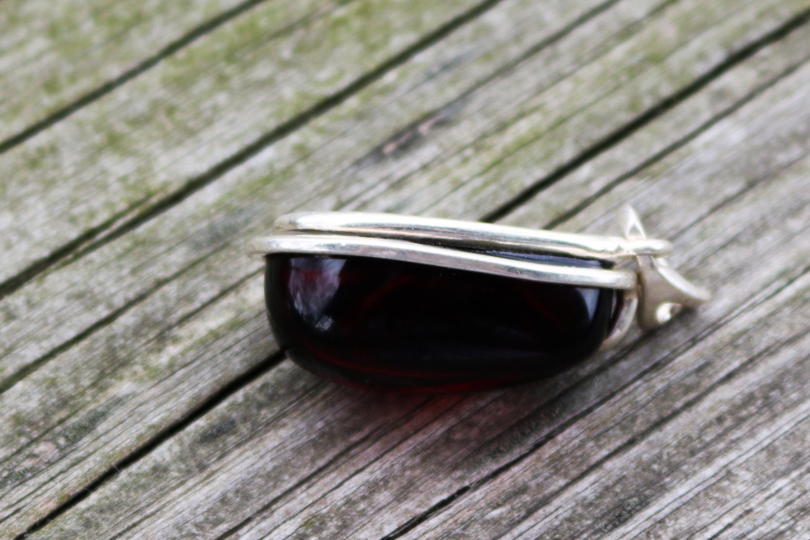 Baltic Amber full shape pendant in smooth dark cherry color. Polished and set in 925 sterling silver.