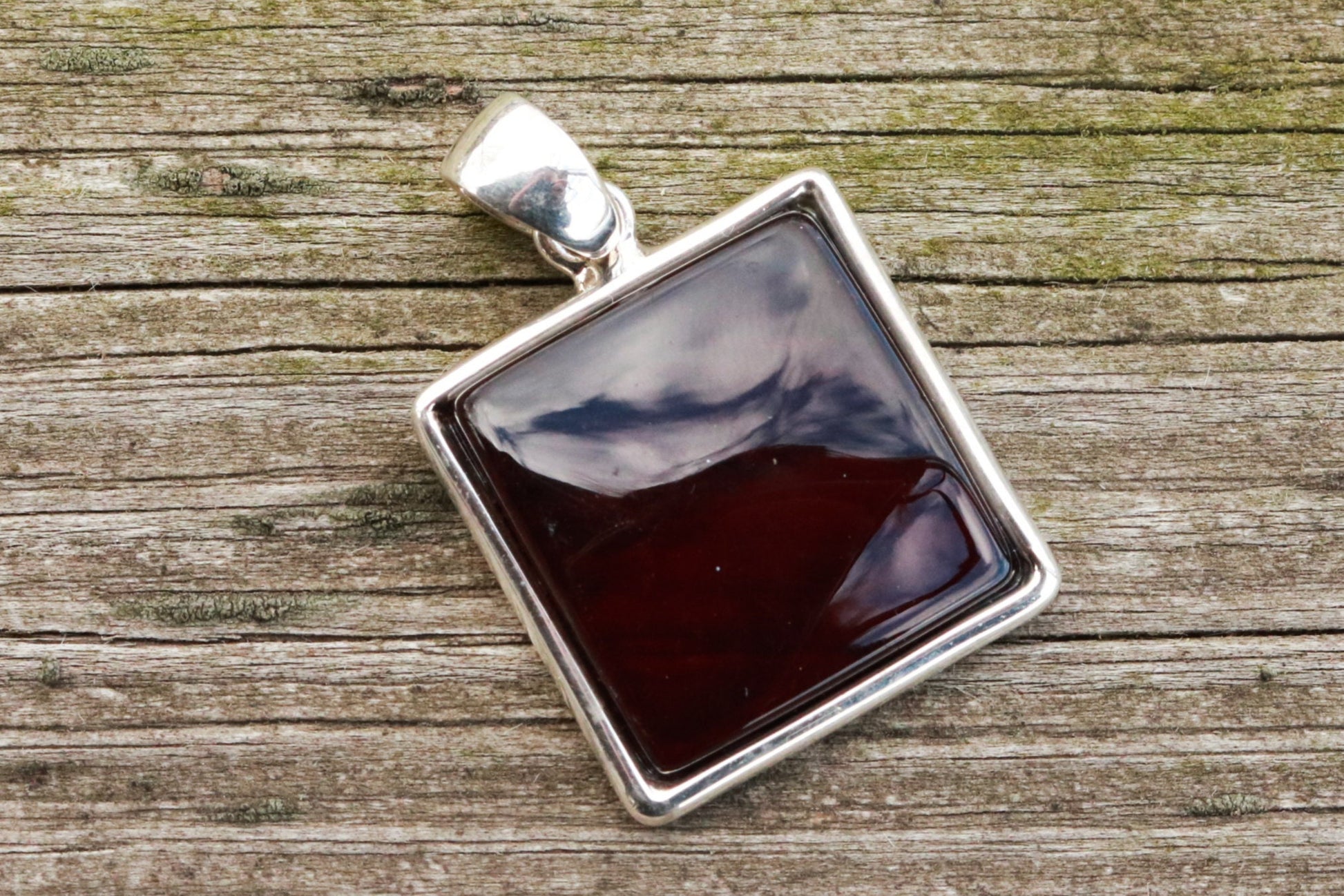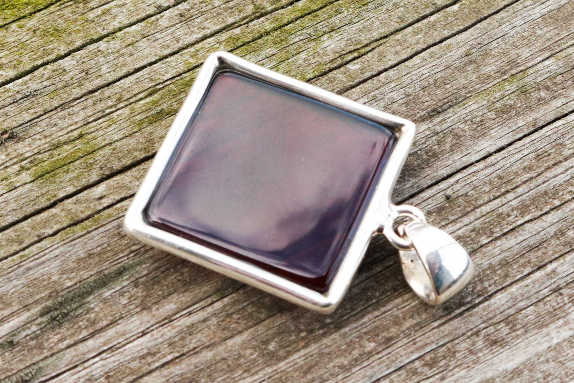 Baltic Amber square pendant in cherry color. Set in 925 sterling silver.