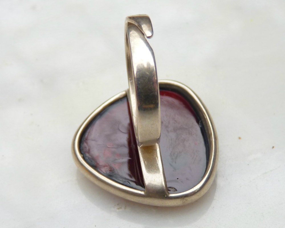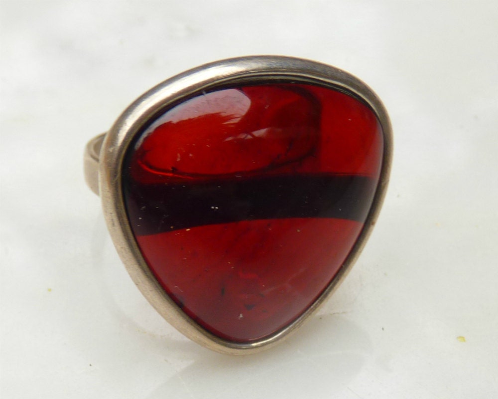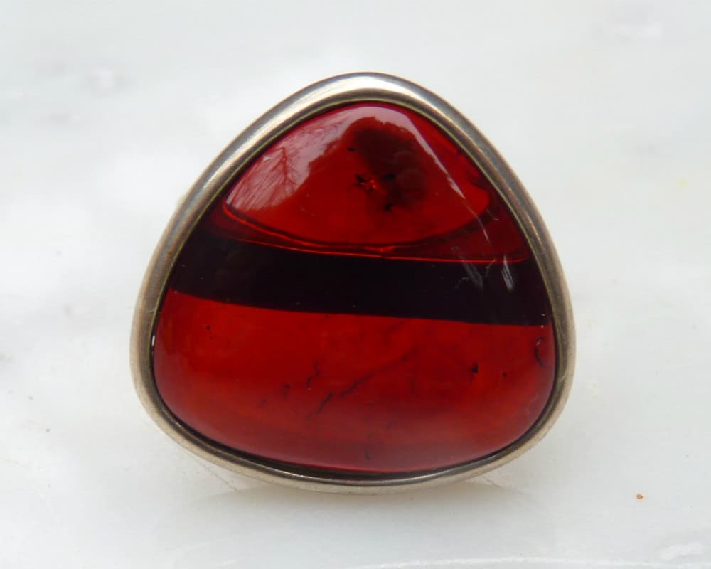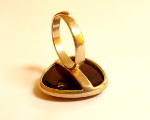 Baltic Amber hand carved ring in dark polished cherry color. Set in 925 sterling silver.