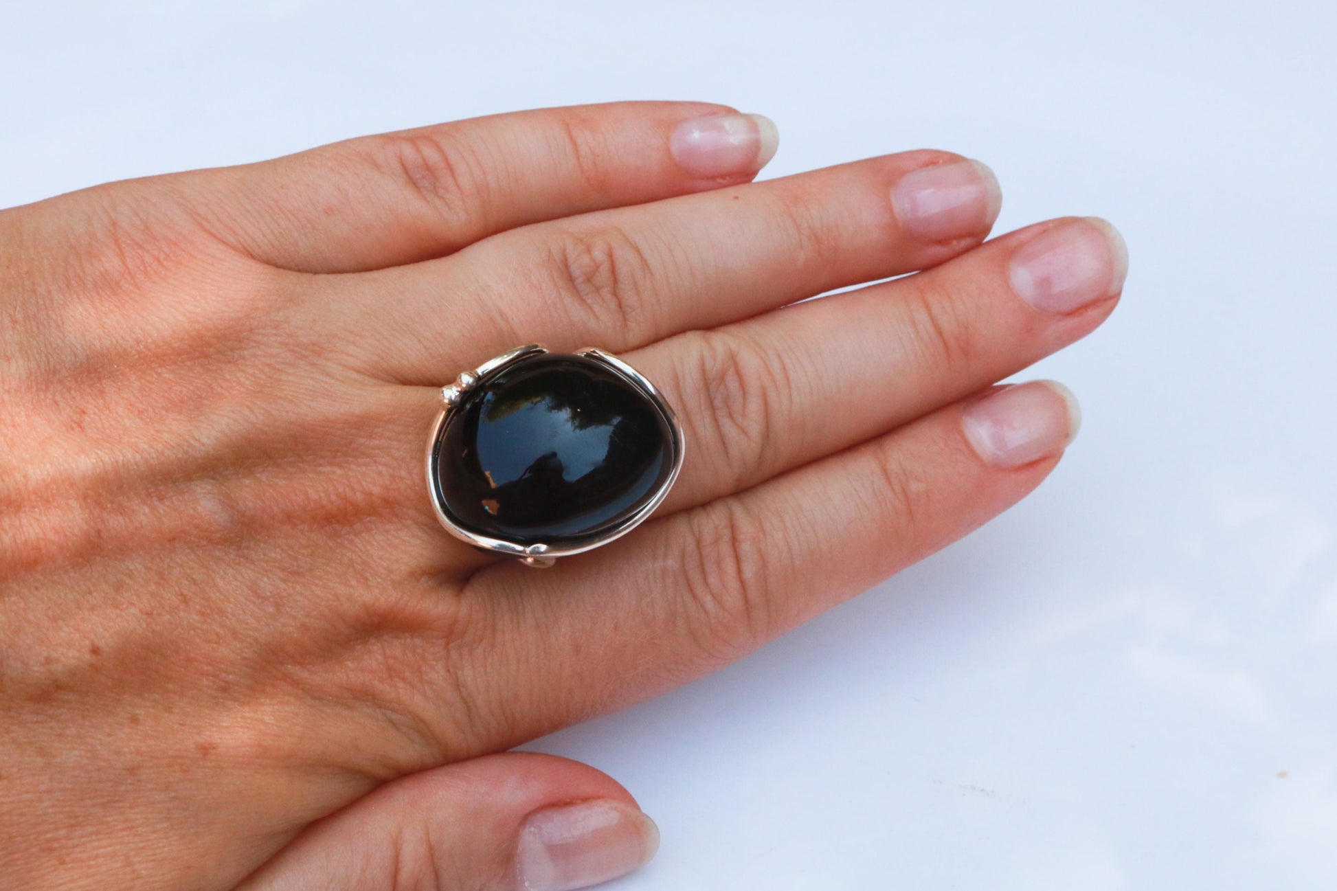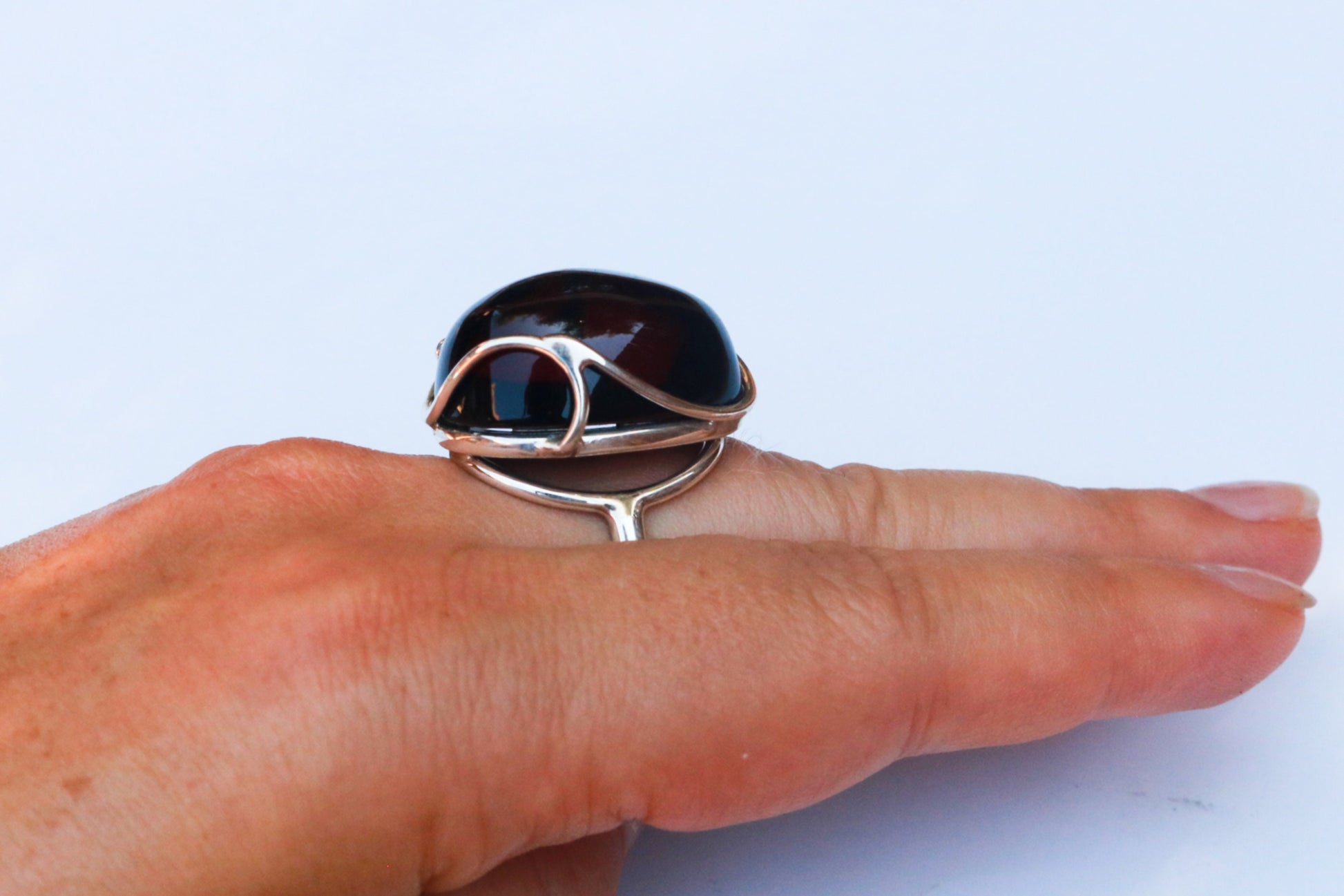 Baltic Amber ring in natural cherry color, fully translucent. Set in 925 sterling silver.