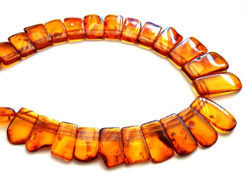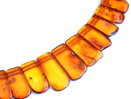It is probably the most popular, recognizable and one of the most common color, cognac (or whisky) amber comes mainly in treated form (initially transparent yellow), but can be also natural. Slow heating deepens the color, makes it more shimmering and bright than natural. Cognac amber is often autoclaved (treated with high pressure saturated steam at about 120°C/248°F) which results in inner cracking. The steam penetrates the amber’s structure and alter its color. That’s how decorative bubbles (or so-called “scales”) and shiny discs are created. Heating is a very cold technique that has been in use for hundreds of years to enhance amber’s natural color while autoclaving has been developed in the second half of the 20th century. There are several shades of cognac amber, varying from light honey to dark cognac, almost cherry shade.