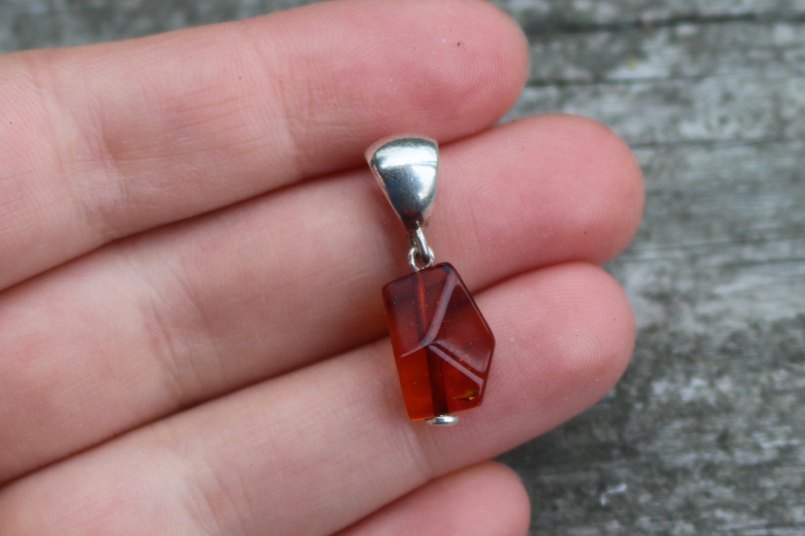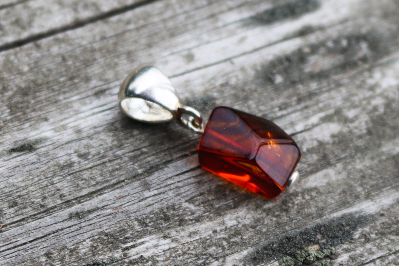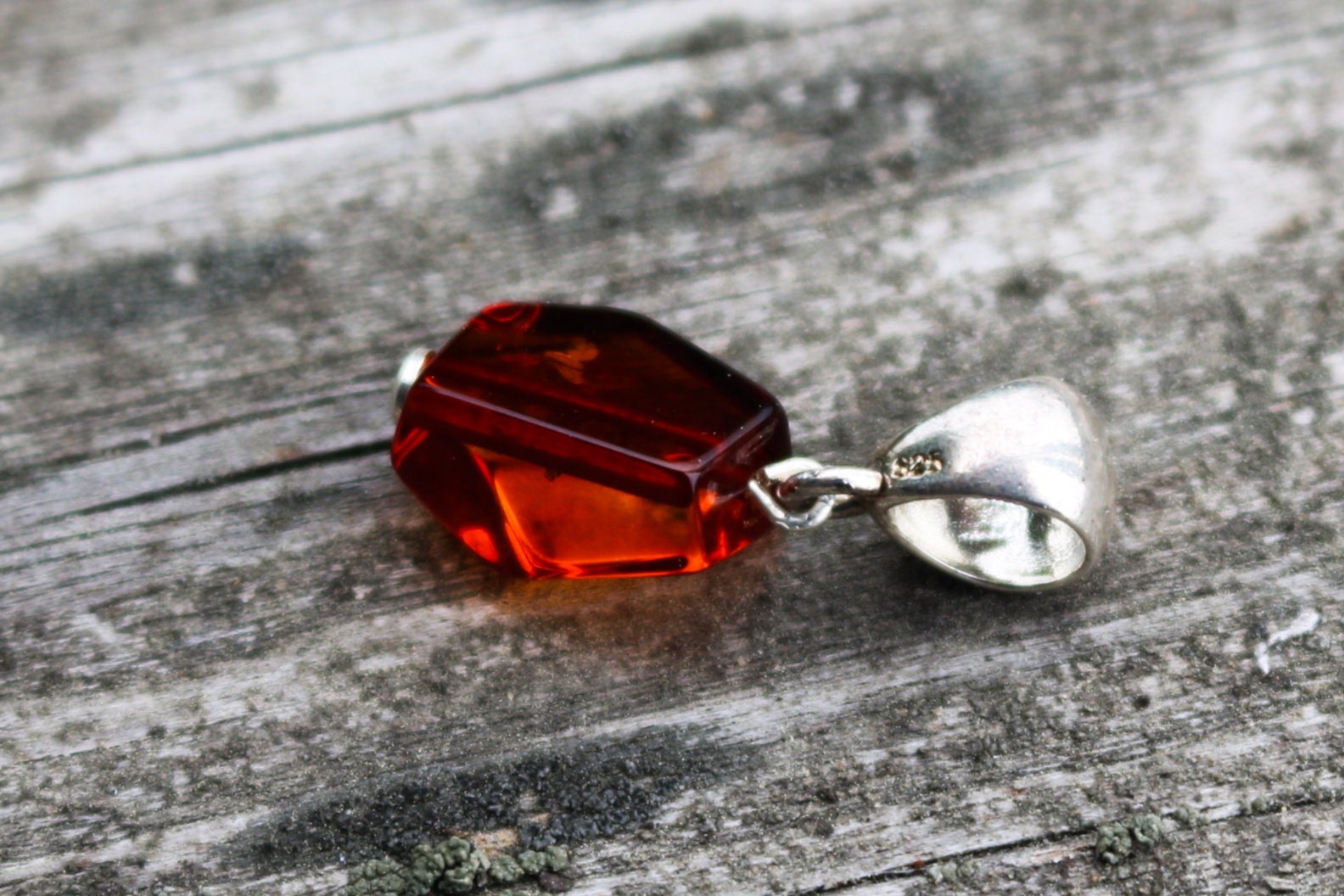 Charm style Baltic amber pendant small hand carved and faceted in cognac color. Set in 925 sterling silver.