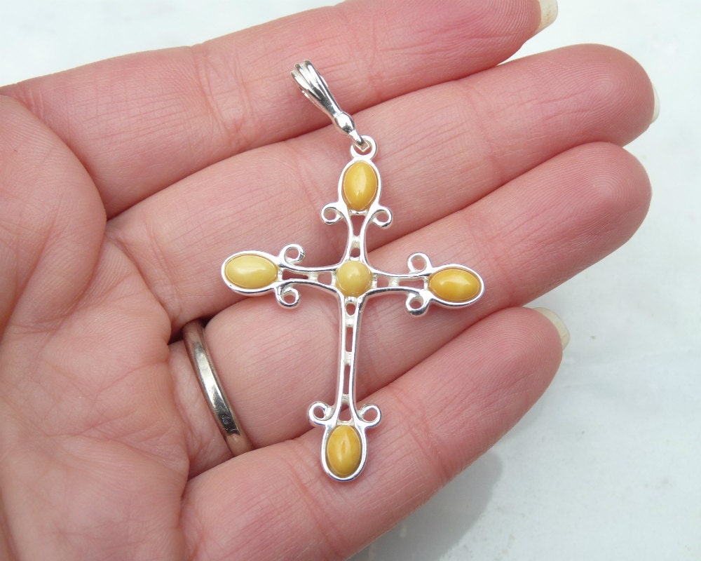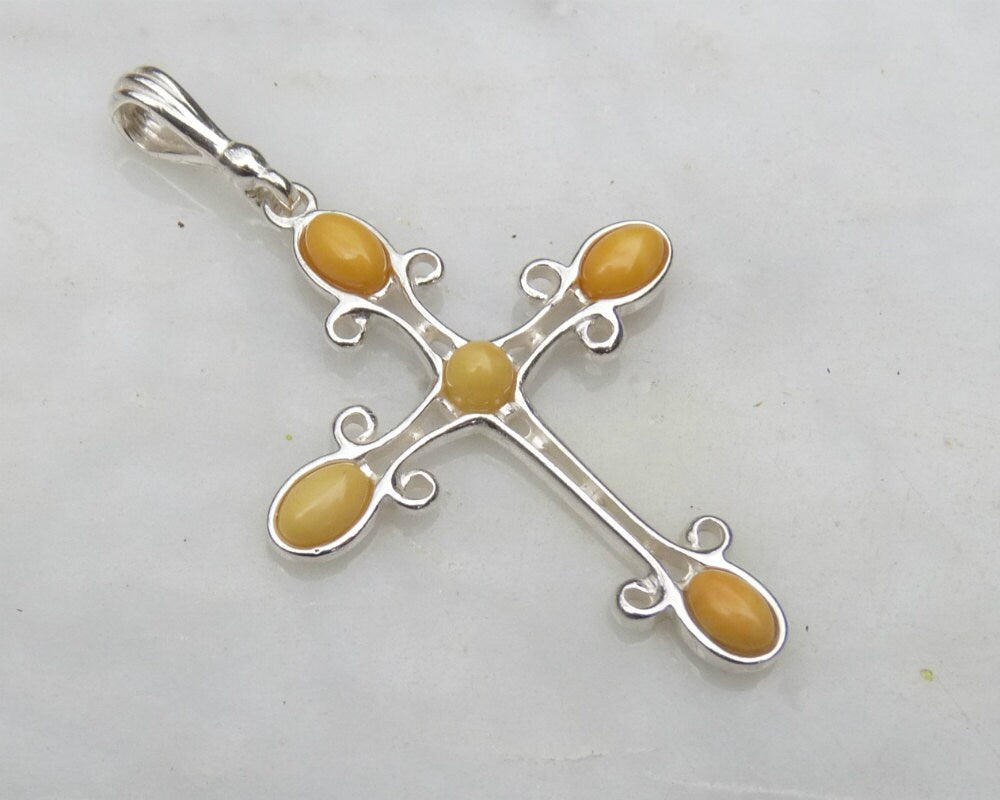 925 sterling silver cross pendant embellished with natural untreated butterscotch color Baltic amber beads.
