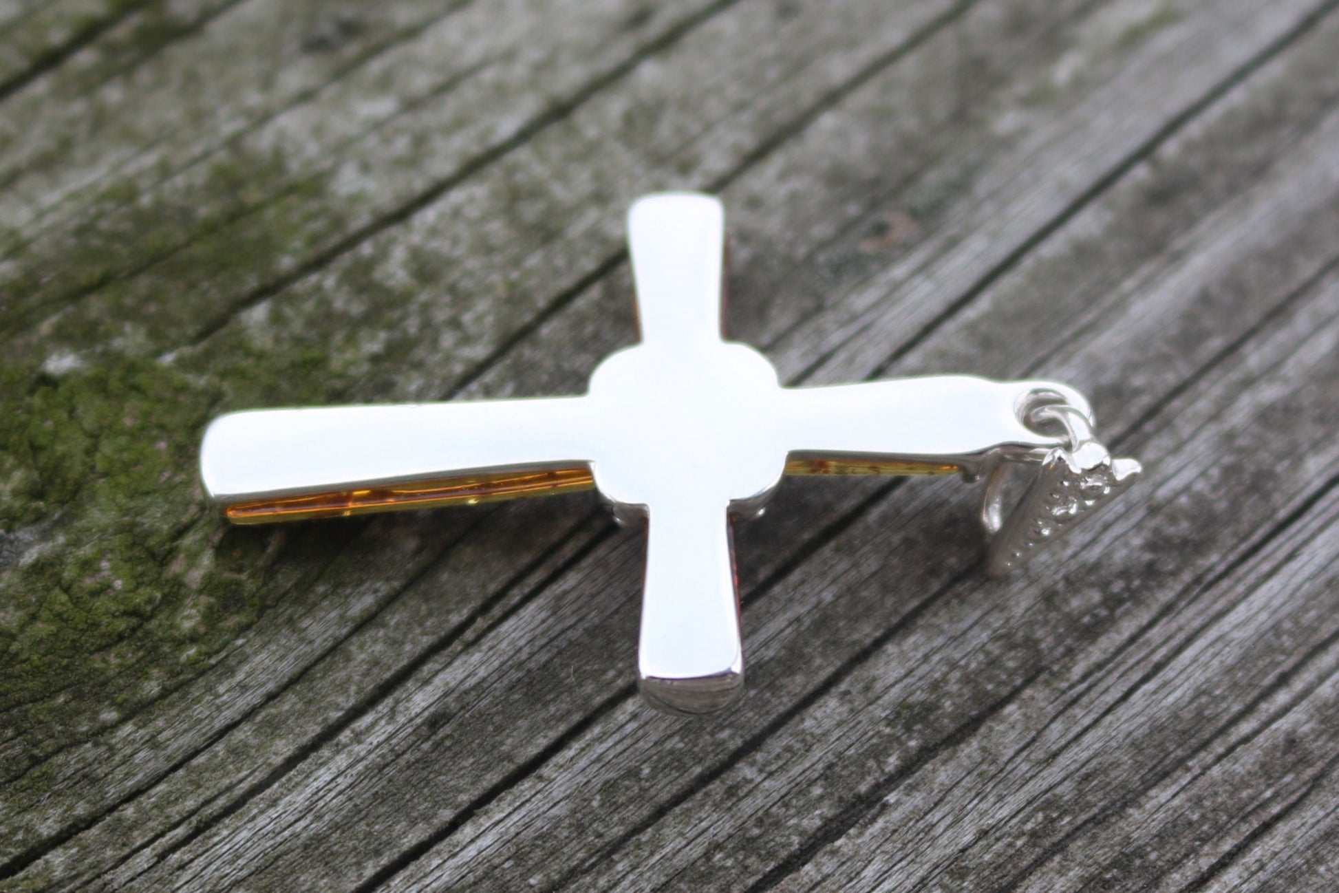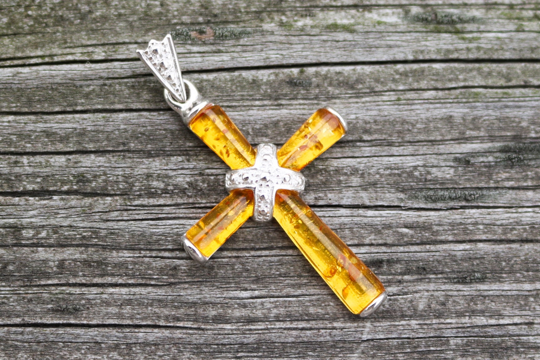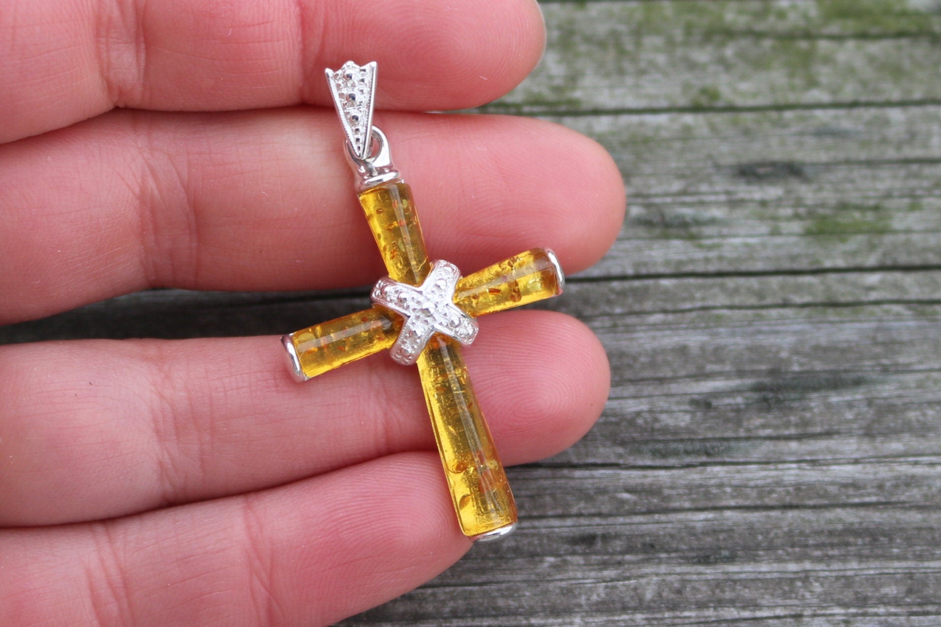 Baltic Amber Cross Pendant Yellow Natural Unisex Jewelry 1.9" 925 silver