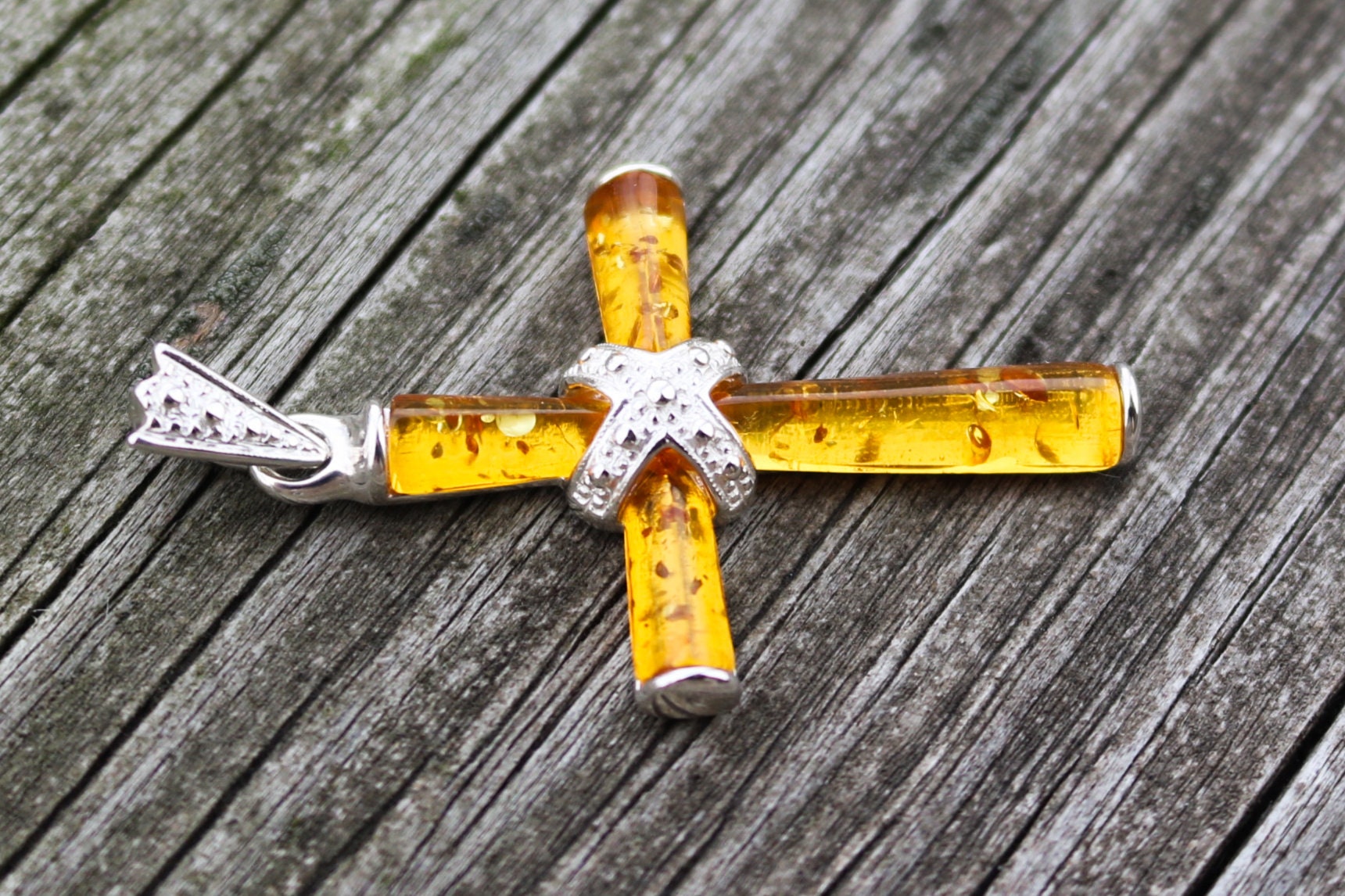 Unique Baltic Amber cross in sparkling yellow color. This is natural untreated color.