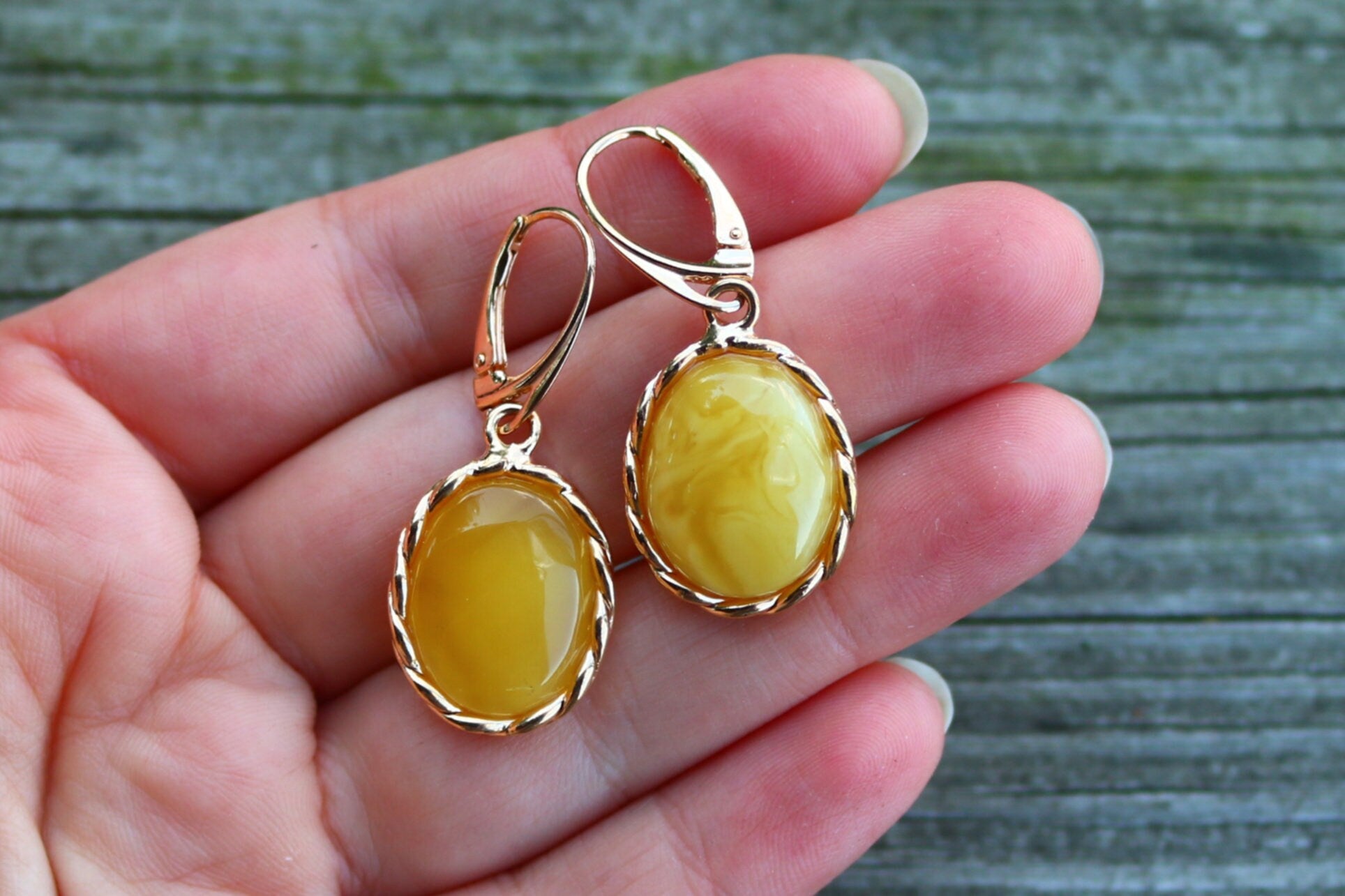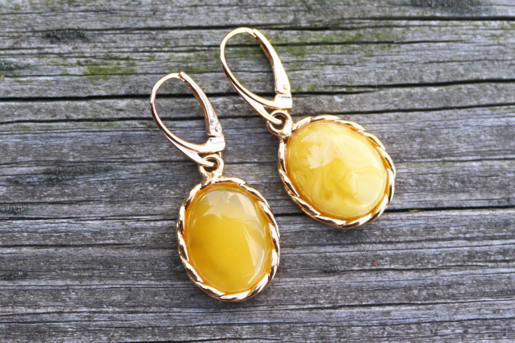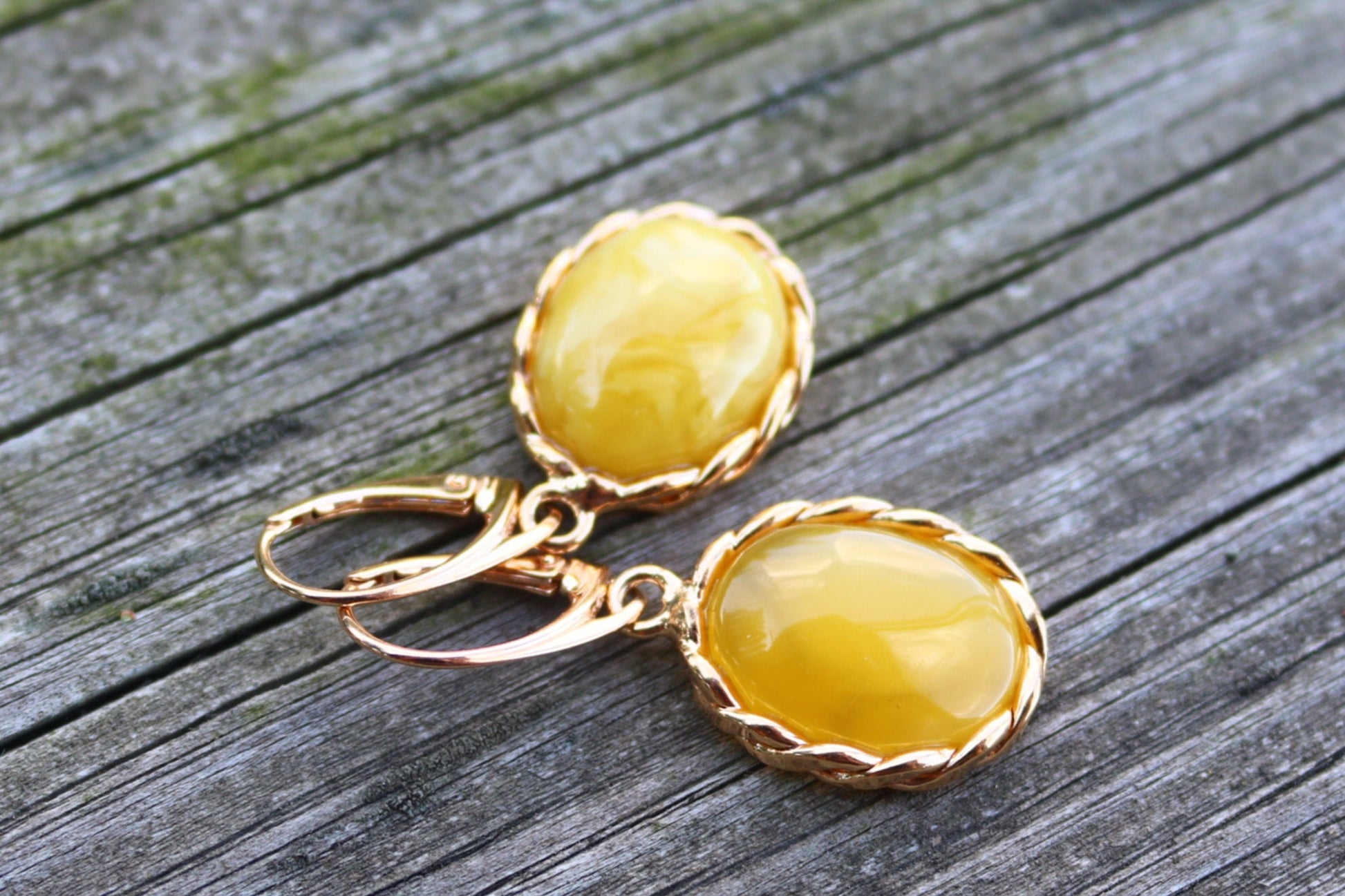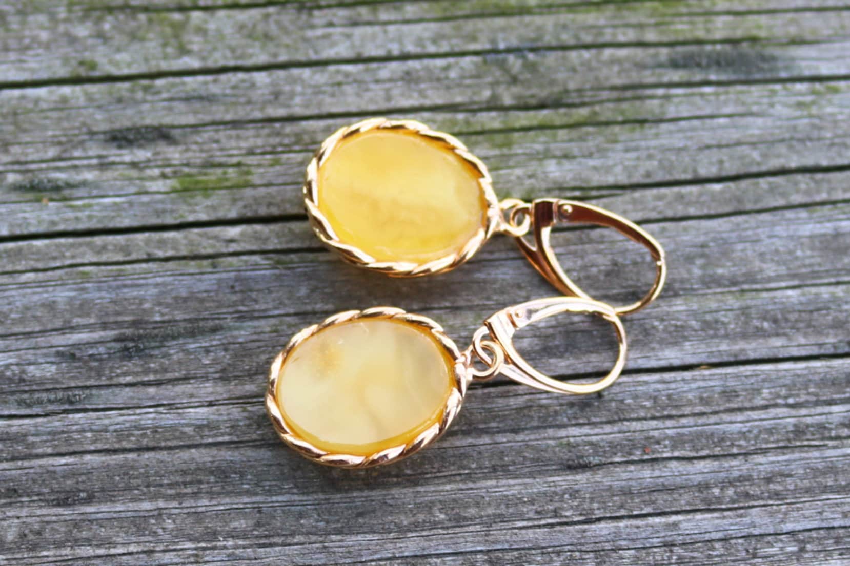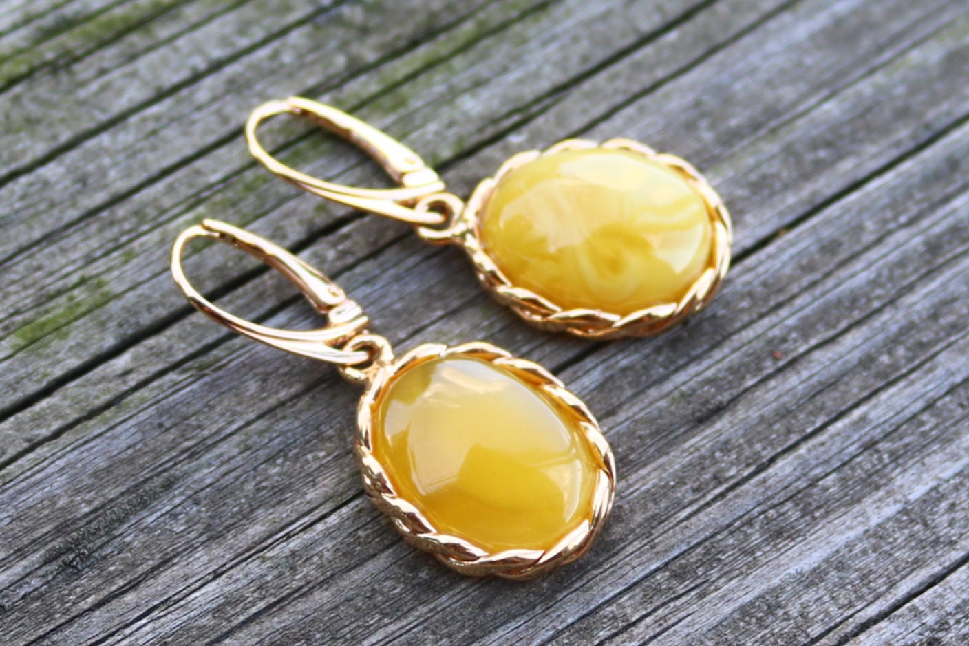 Baltic Amber earrings in antique butterscotch (yolk) color. Set in gold plated 925 sterling silver.