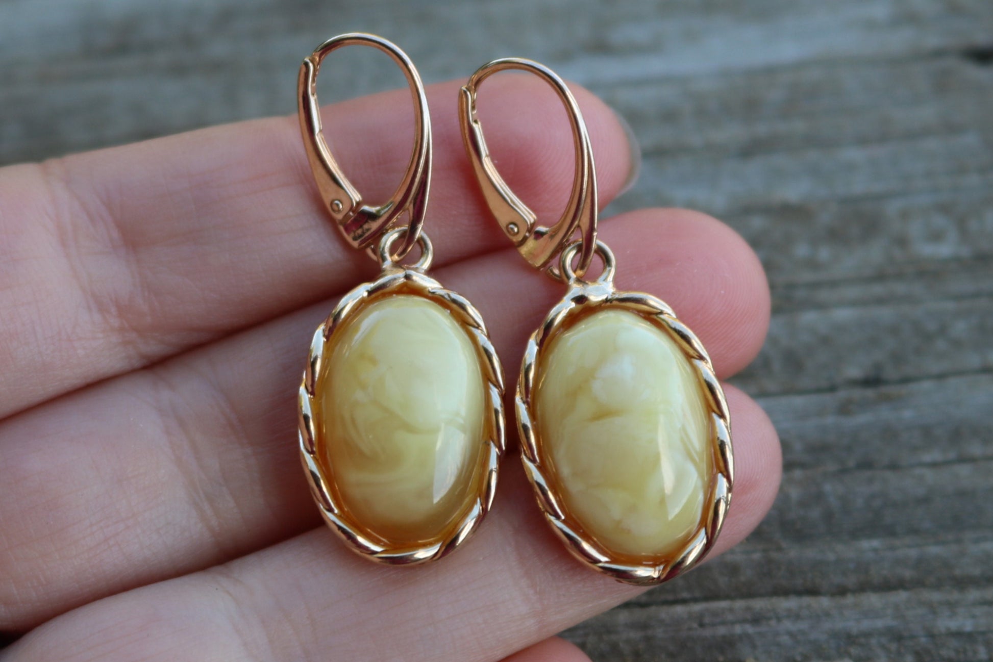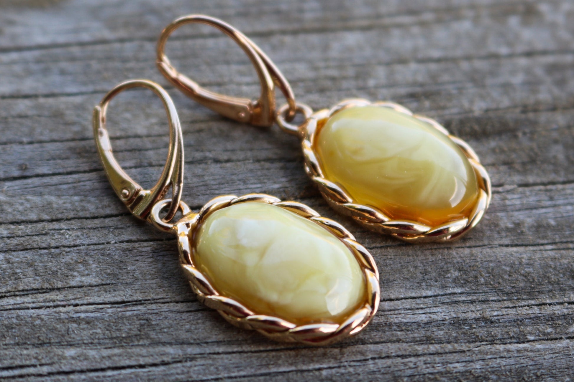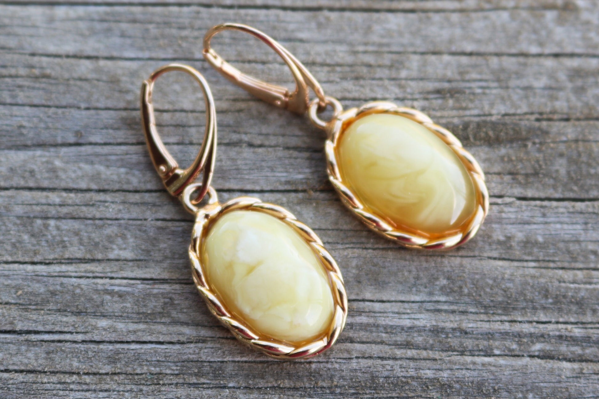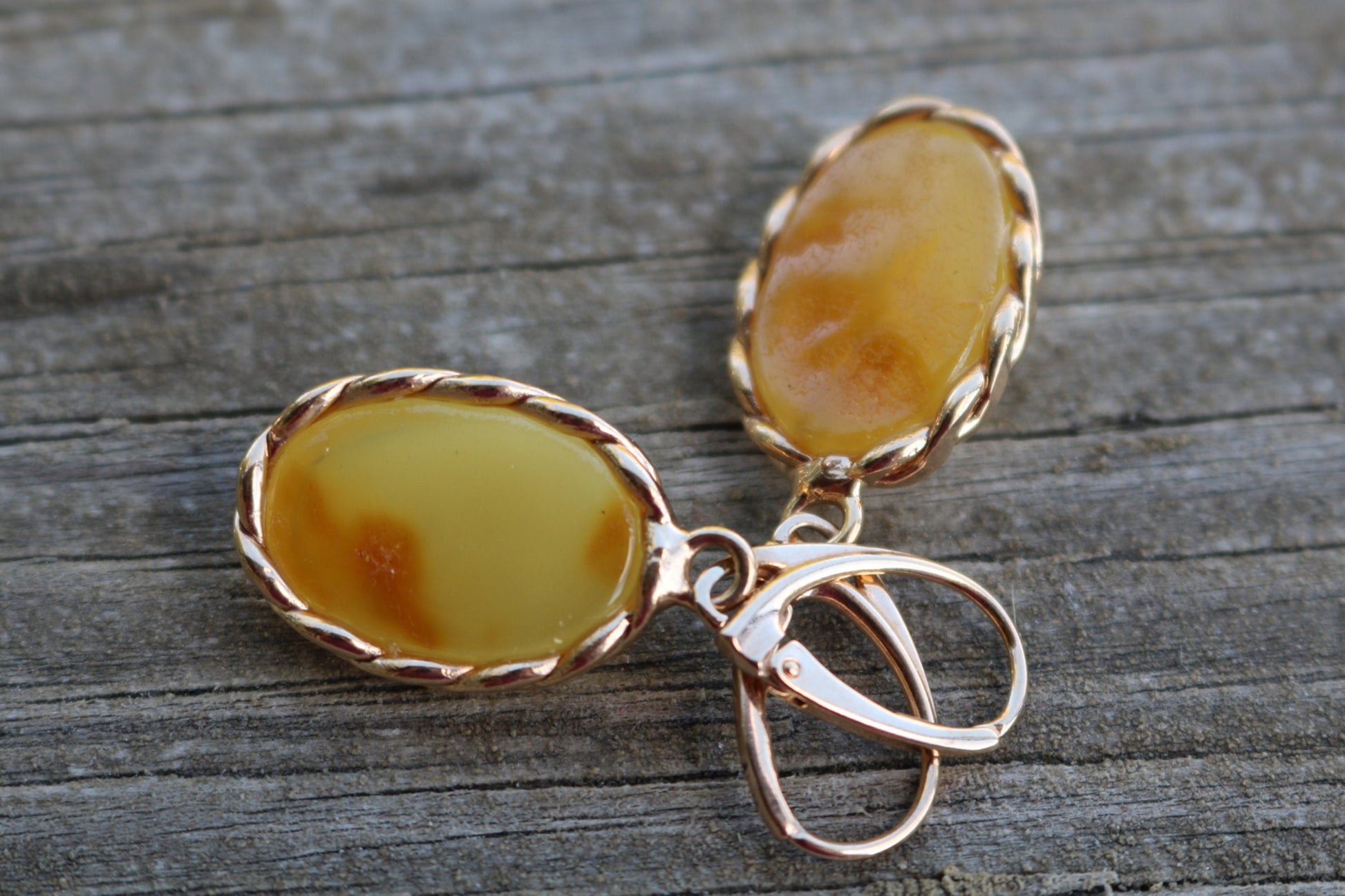 Baltic Amber Earrings Butterscotch Milky Gold Plated Oval Jewelry 1.69" 7.5 gram 925 Silver