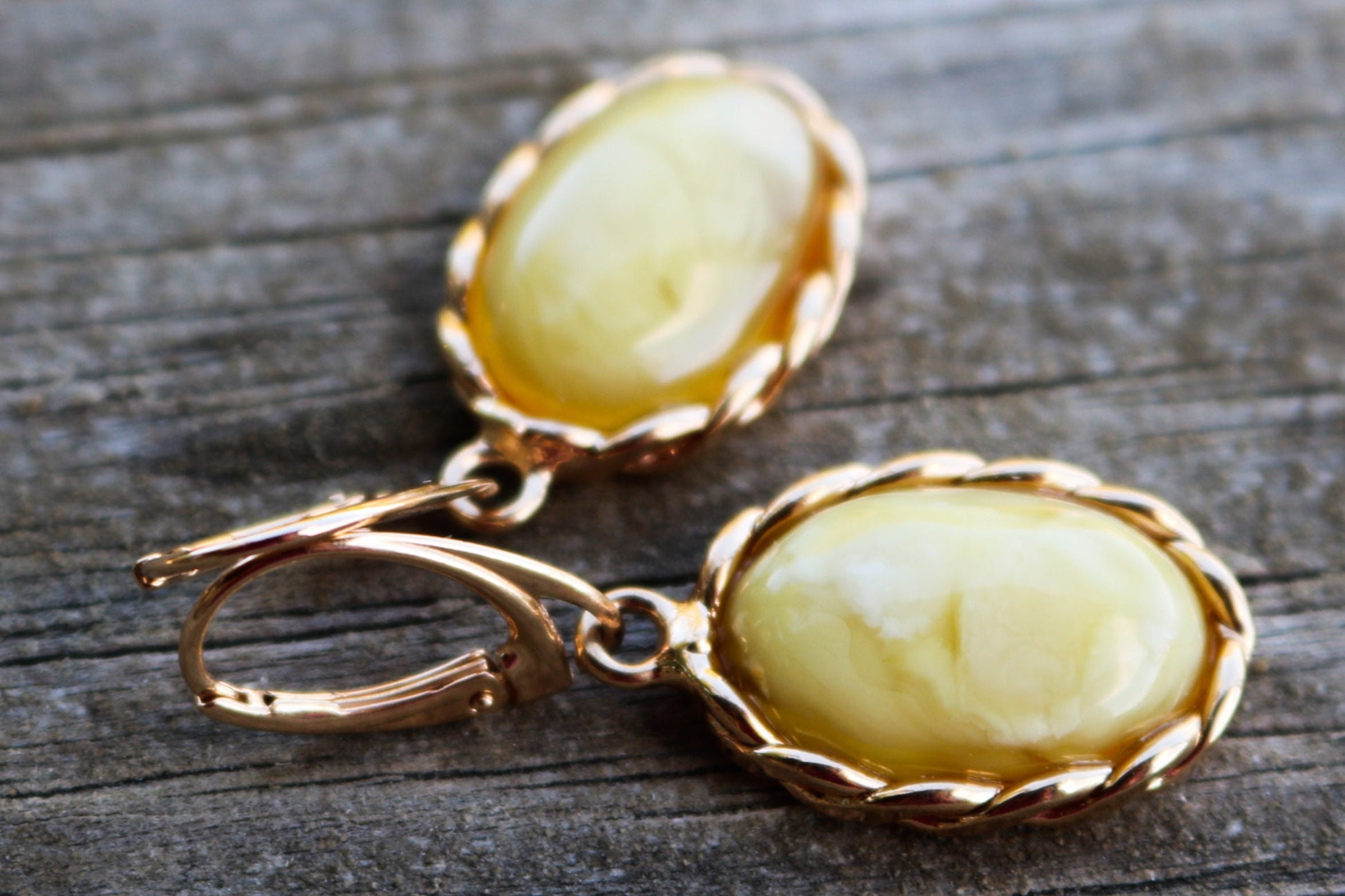 Baltic Amber earrings in milky butterscotch color. Natural raw untreated stone, polished. Set in gold plated 925 sterling silver.
