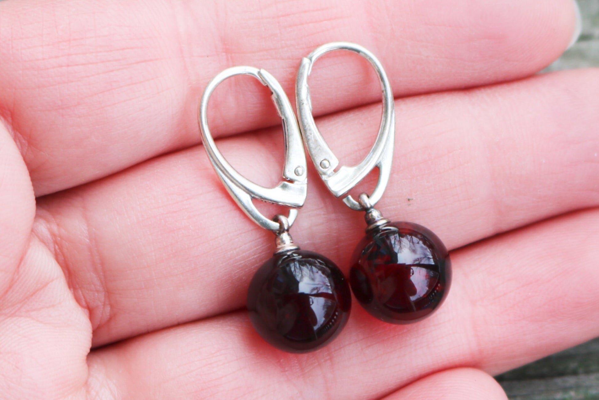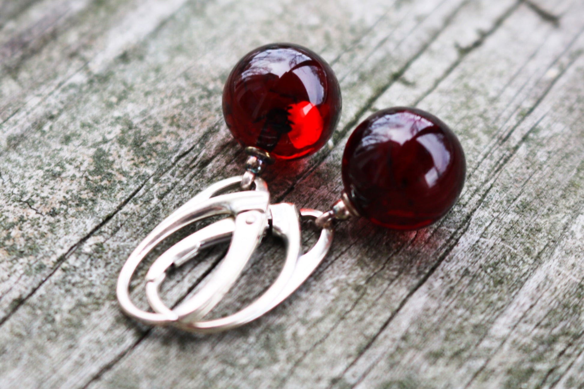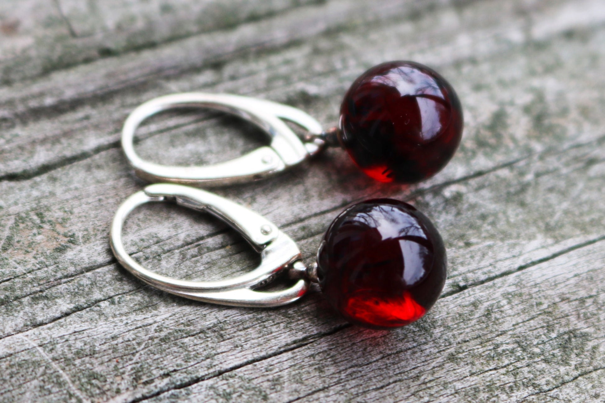 Baltic Amber Earrings Cherry Ball Dangling Natural Jewelry 1.2" 10 mm 925 Silver