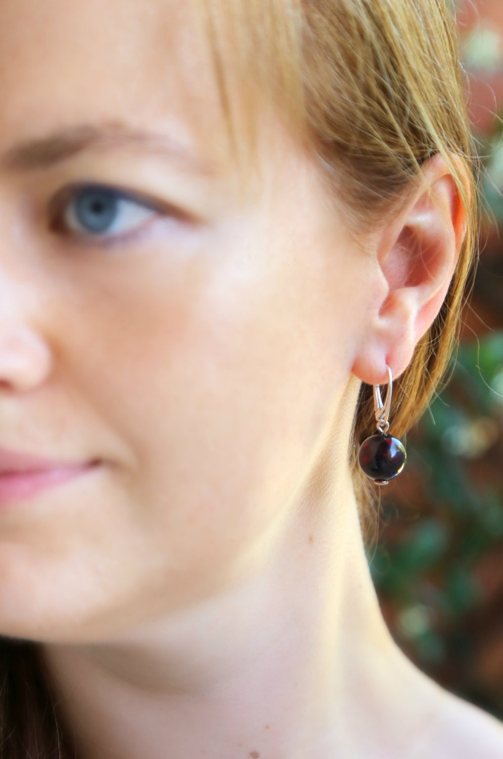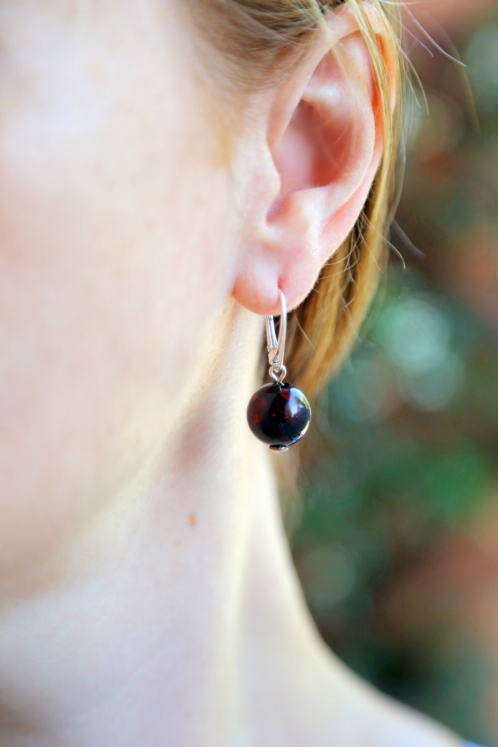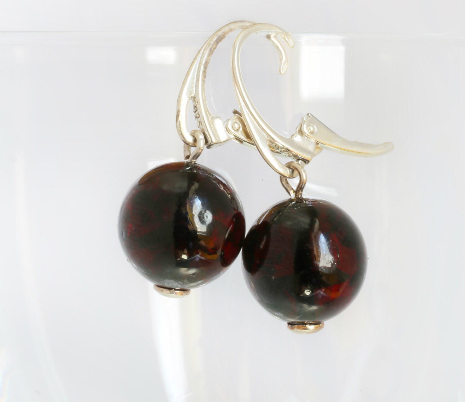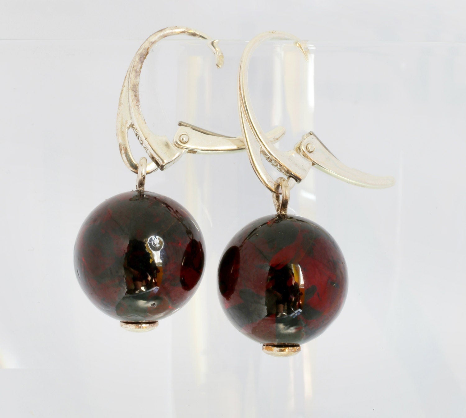 Baltic Amber Earrings Cherry Ball Dangling Natural Jewelry 1.3" 13 mm 925 Silver