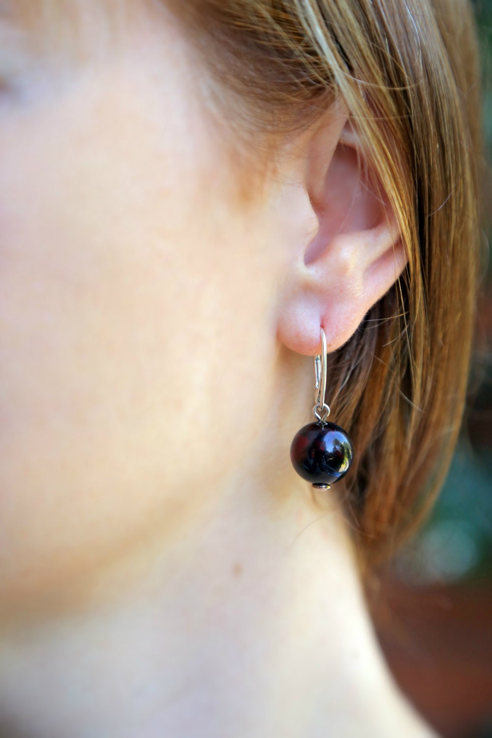 Baltic Amber earrings shaped as ideally round balls, set in 925 sterling silver. This is natural amber. Each bead is carved out of one piece of amber.