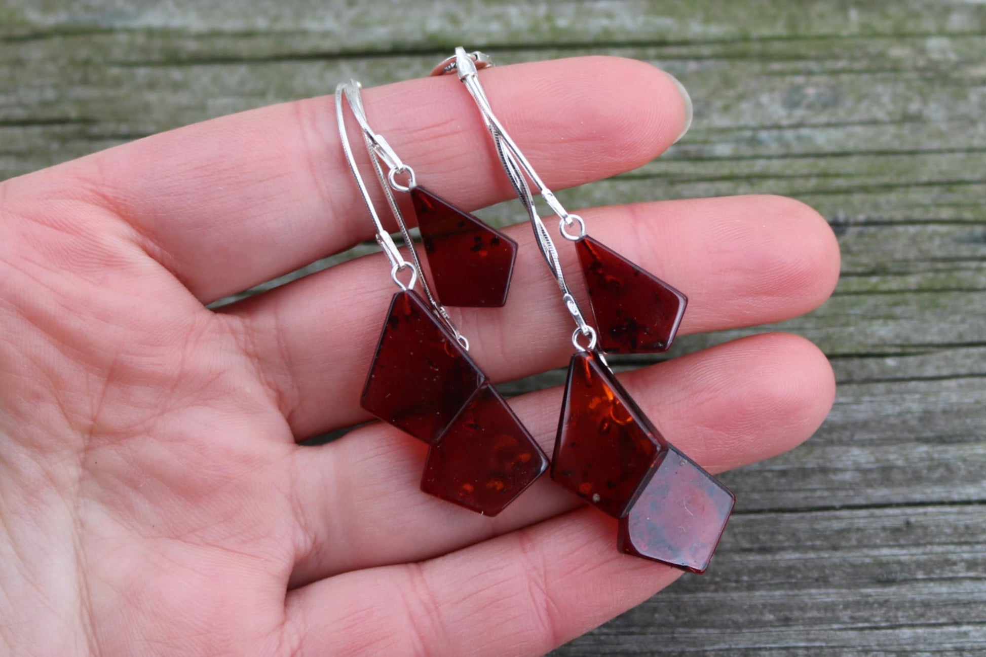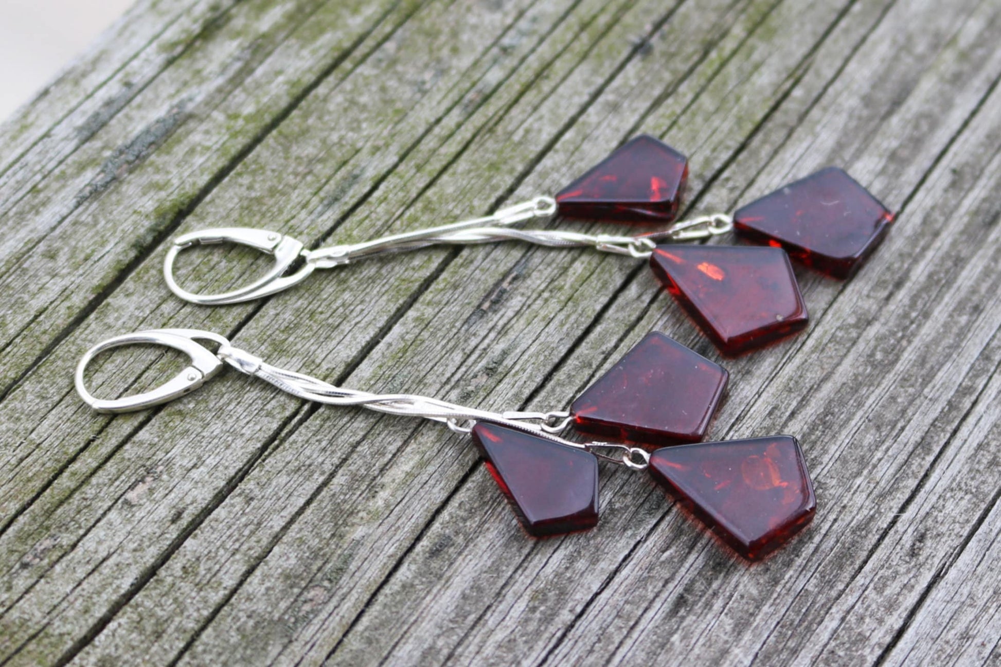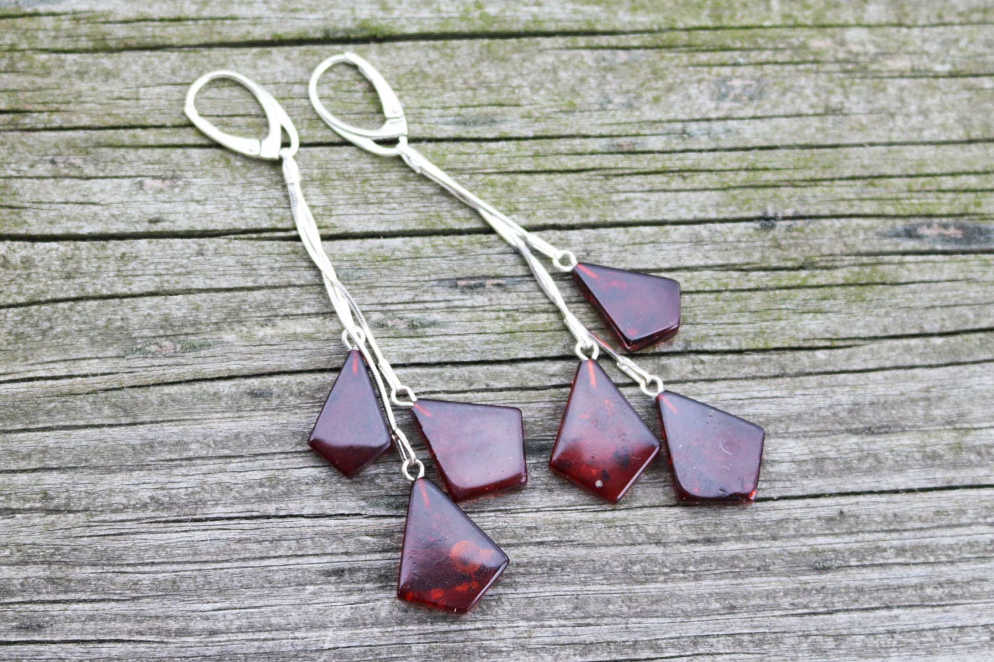 Baltic Amber hand crafted chain earrings in sparkling cherry color. Set in 925 sterling silver.