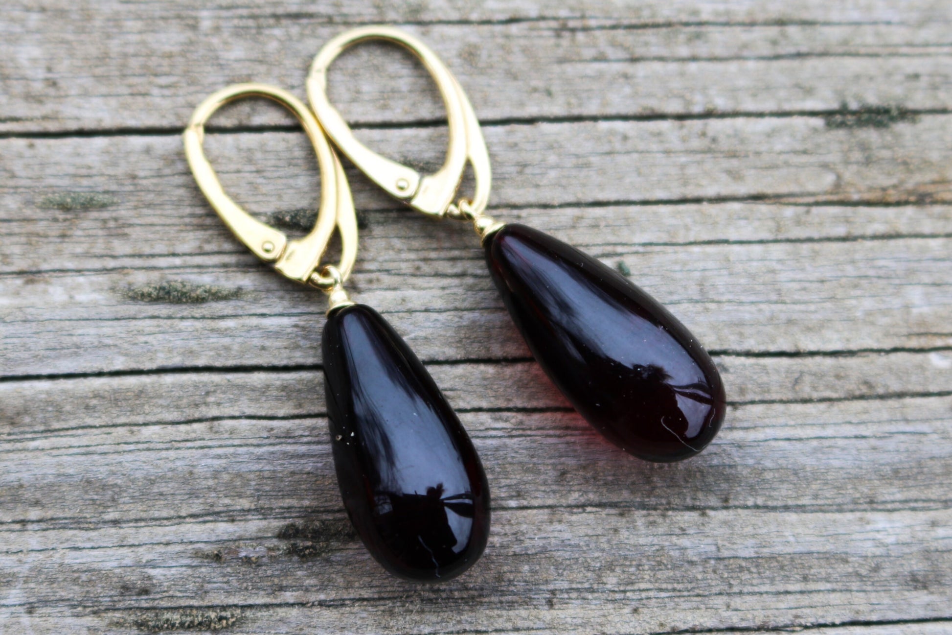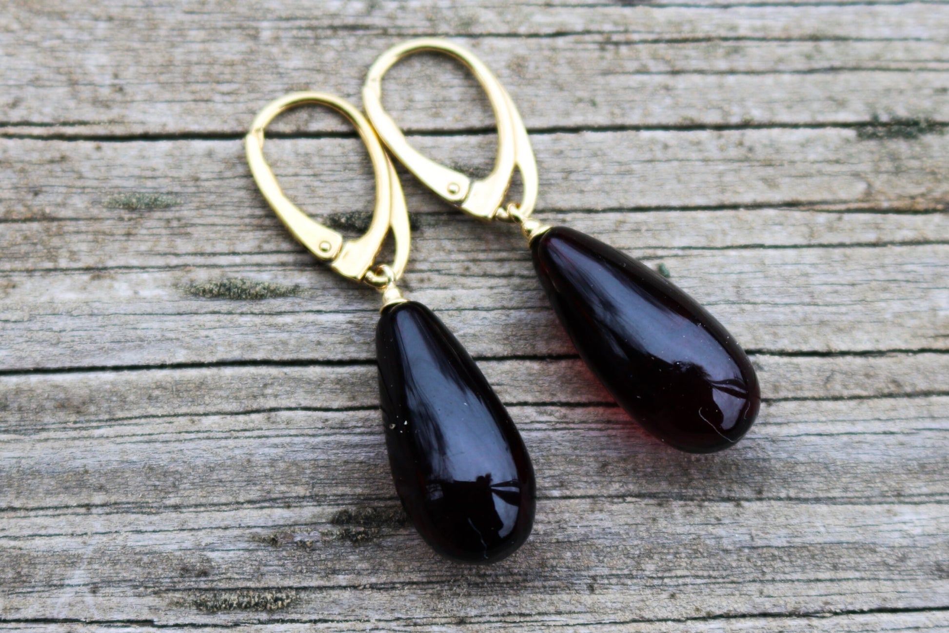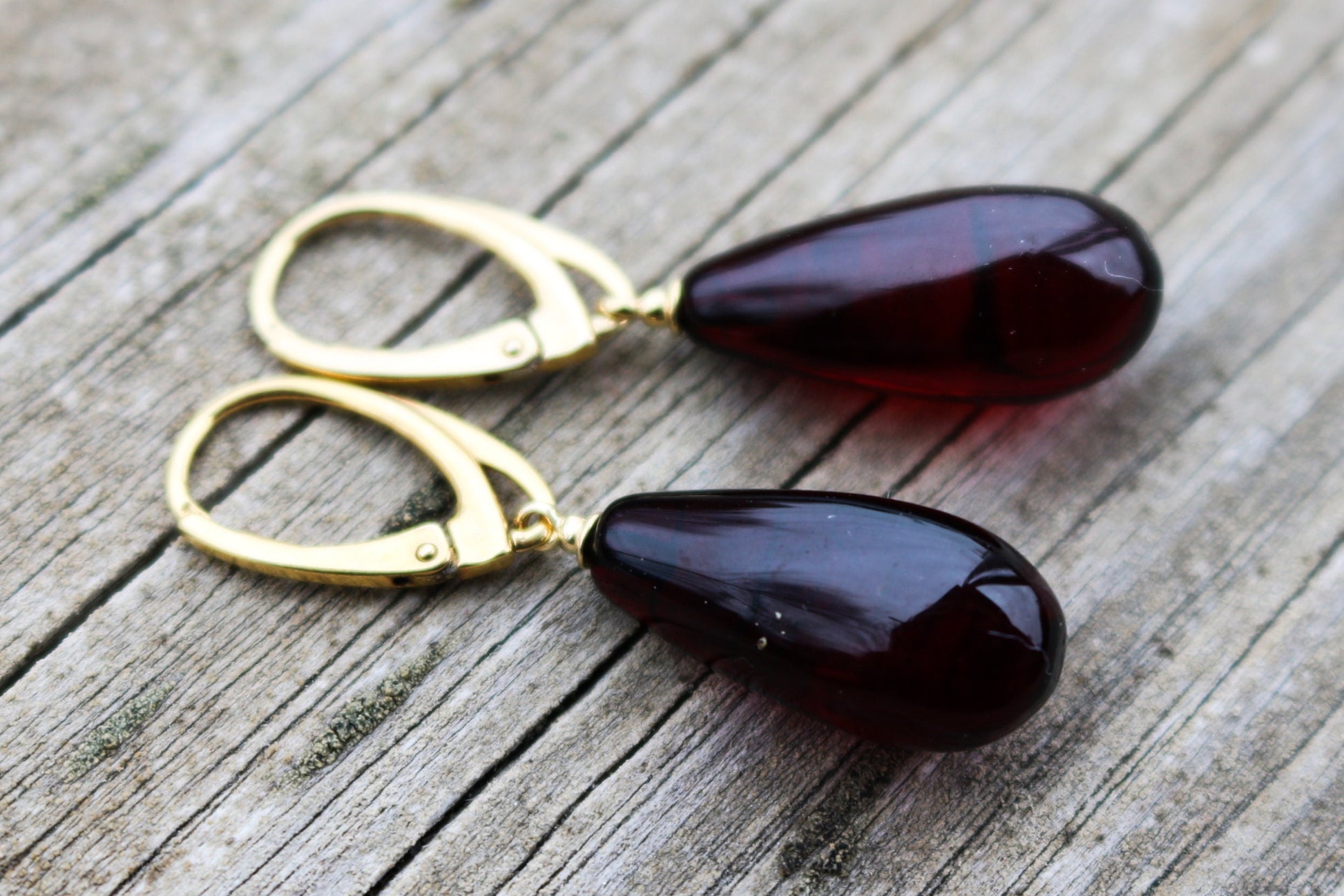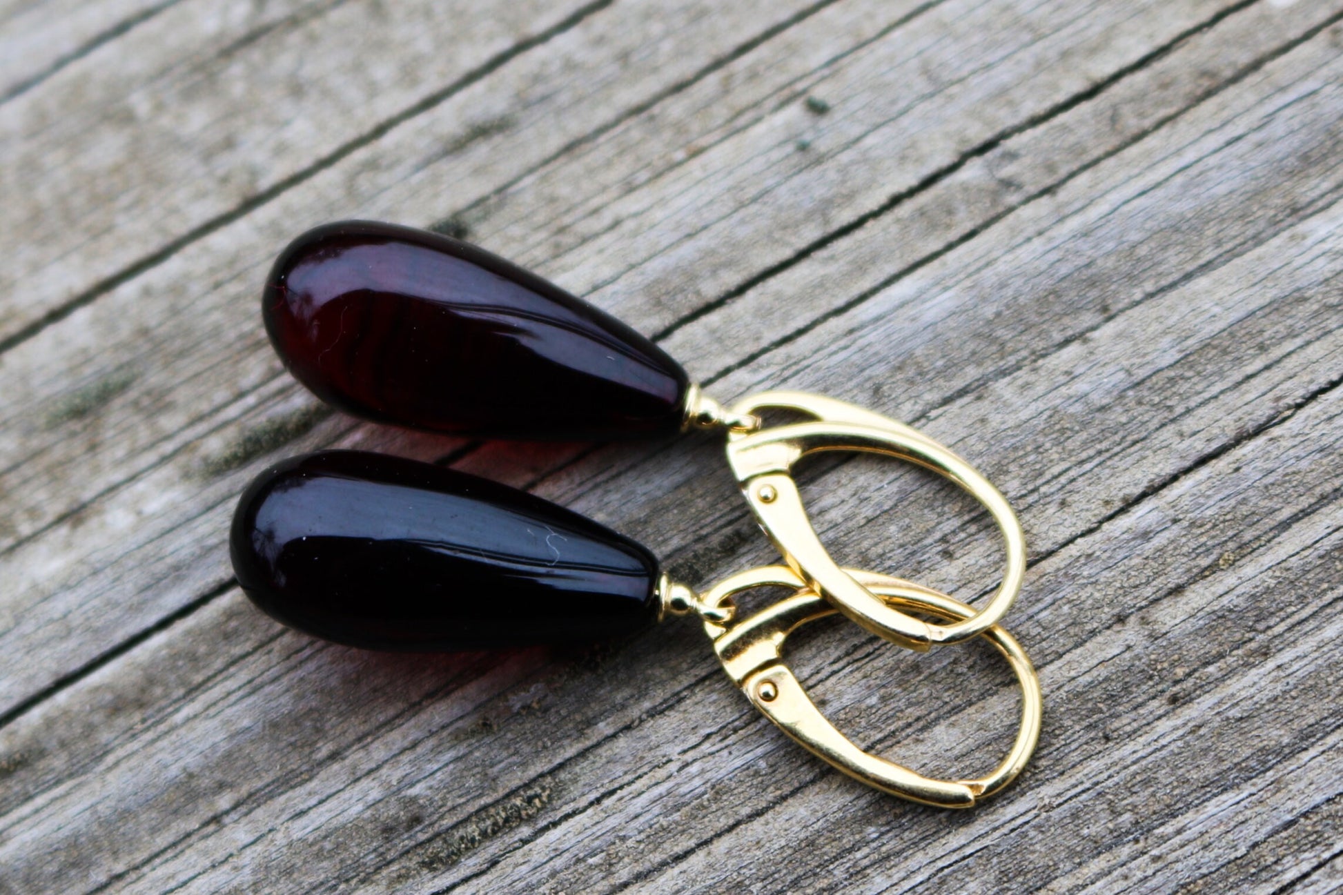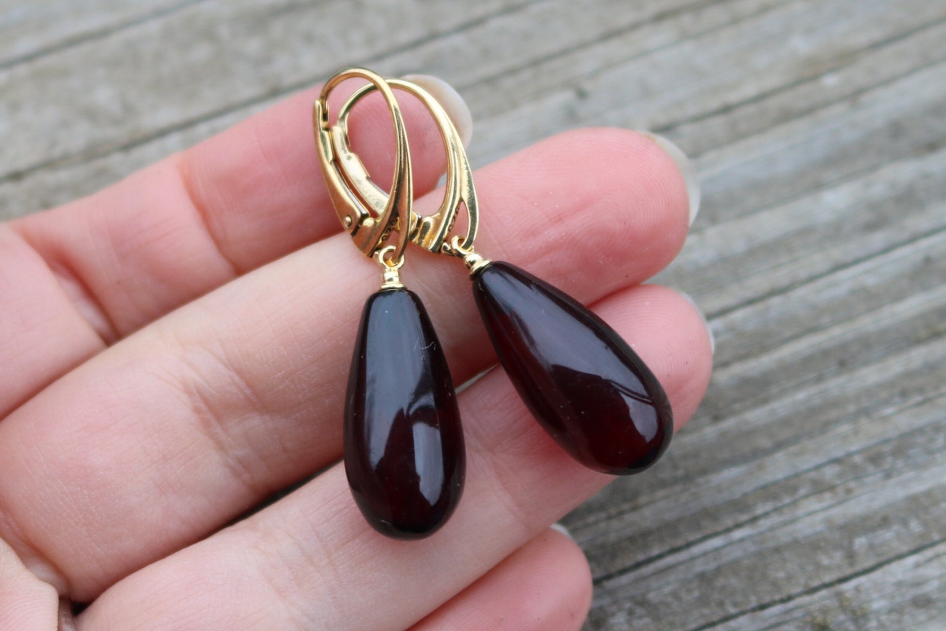 Beautiful earrings hand carved drop earrings in dark cherry color. Set in 925 gold plated sterling silver.