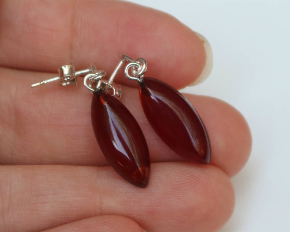 Very light weighted Baltic Amber dark cherry color carved earrings set in 925 sterling silver.