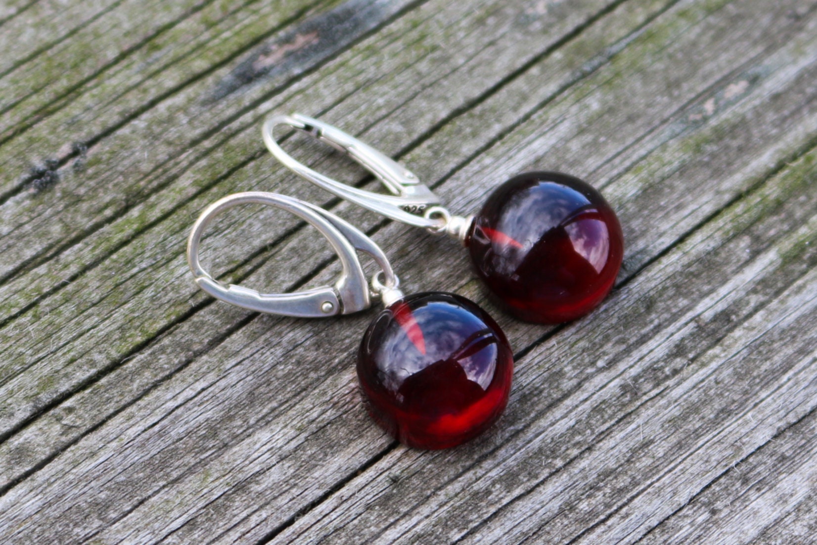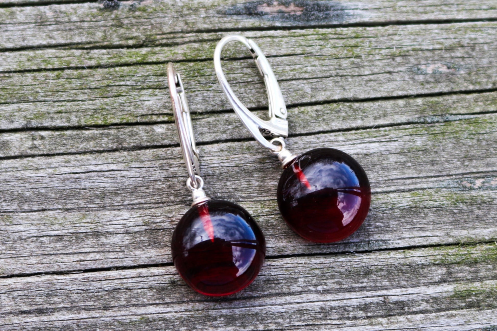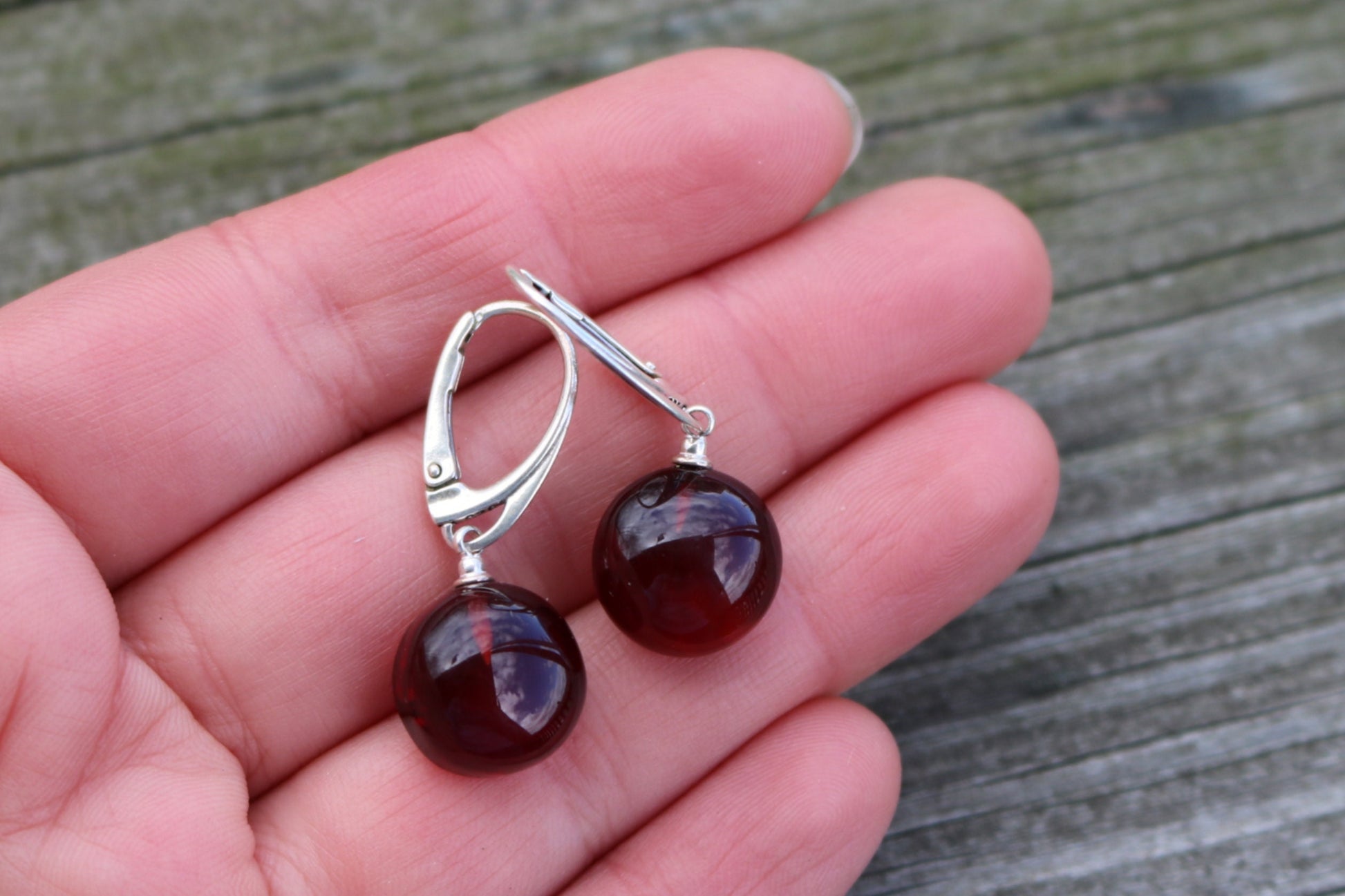 Baltic Amber hand crafted round earrings in dark cherry color. Set in 925 sterling silver.