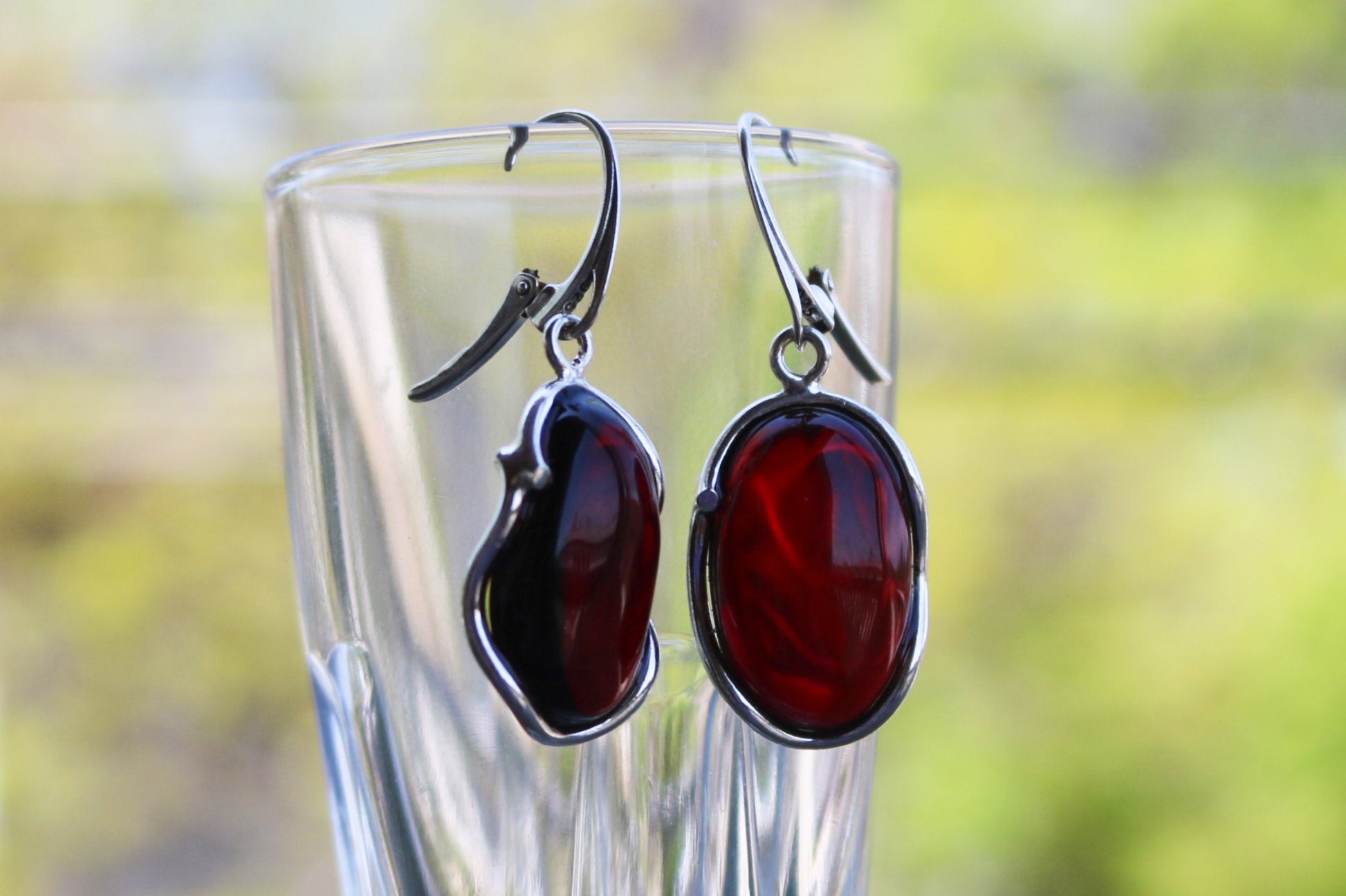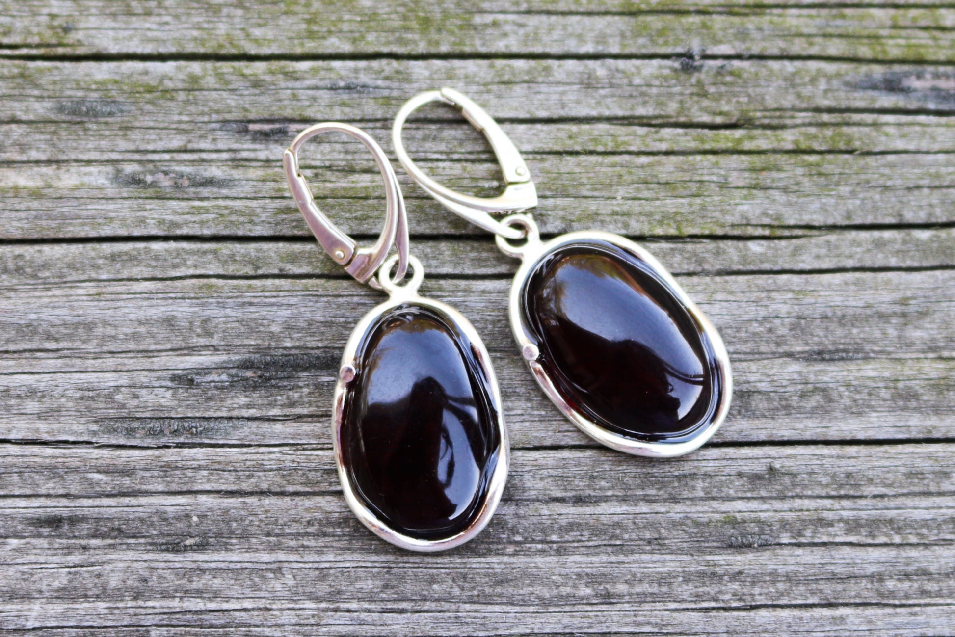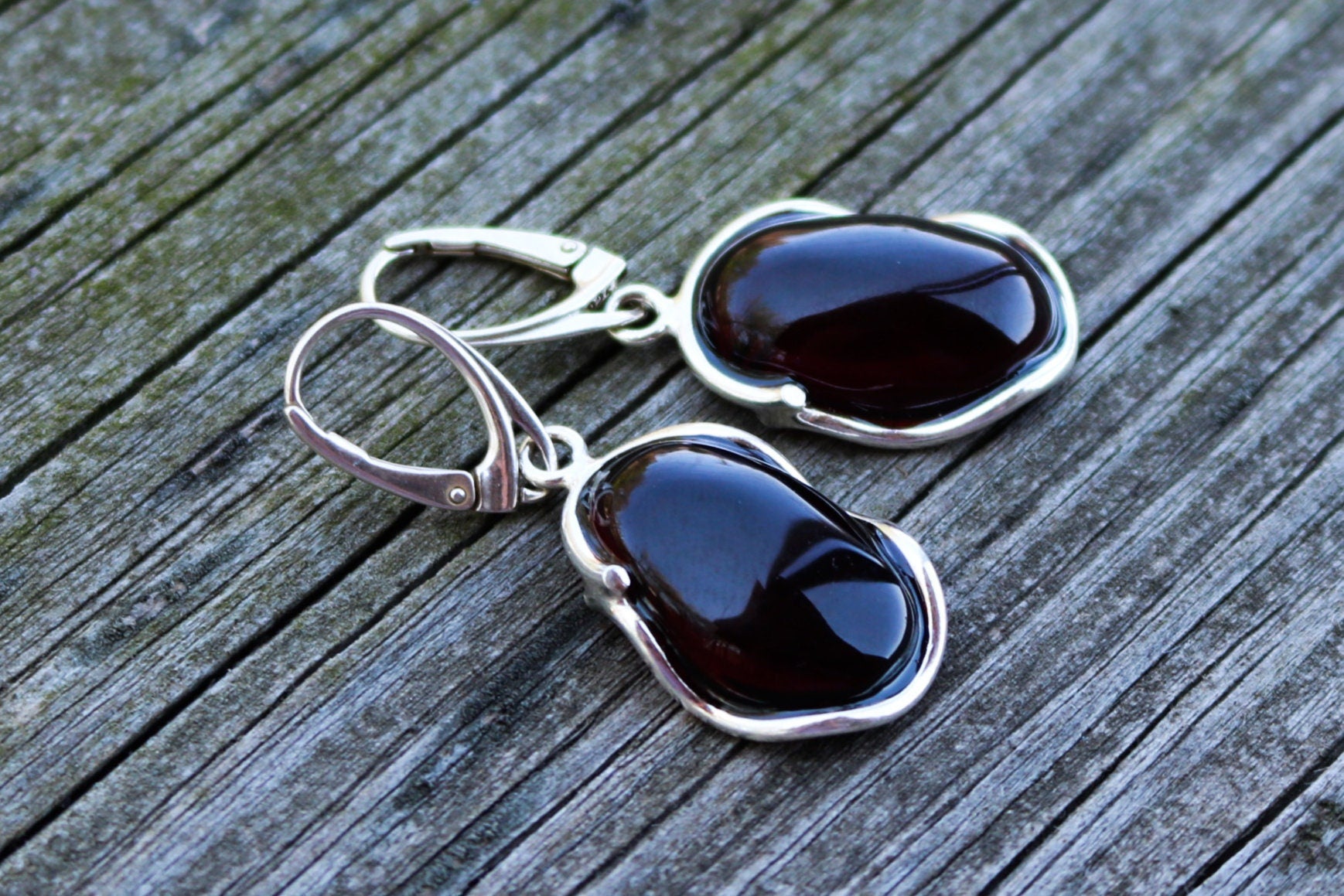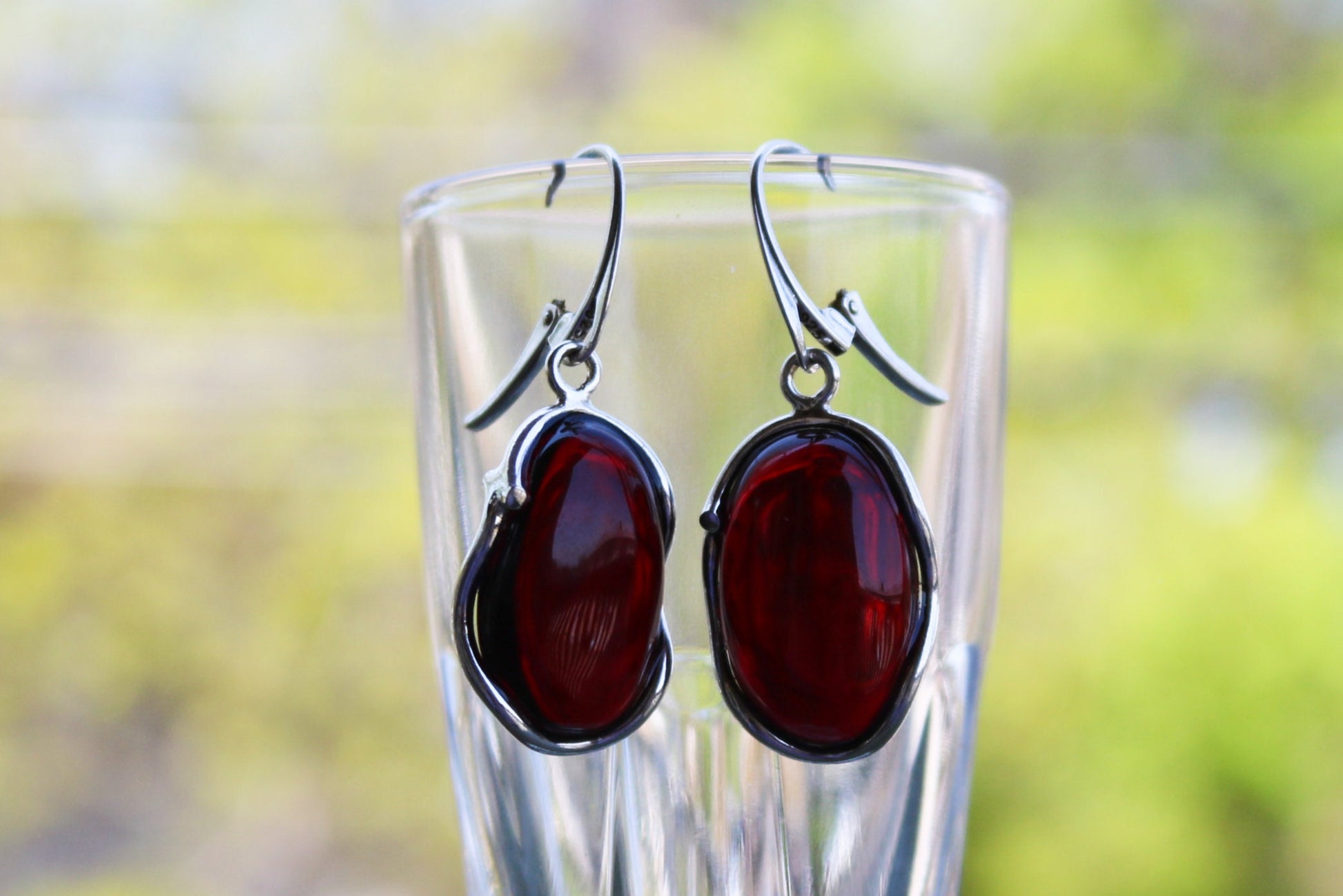 Baltic Amber oval earrings made out of dark cherry color. Set in 925 sterling silver.