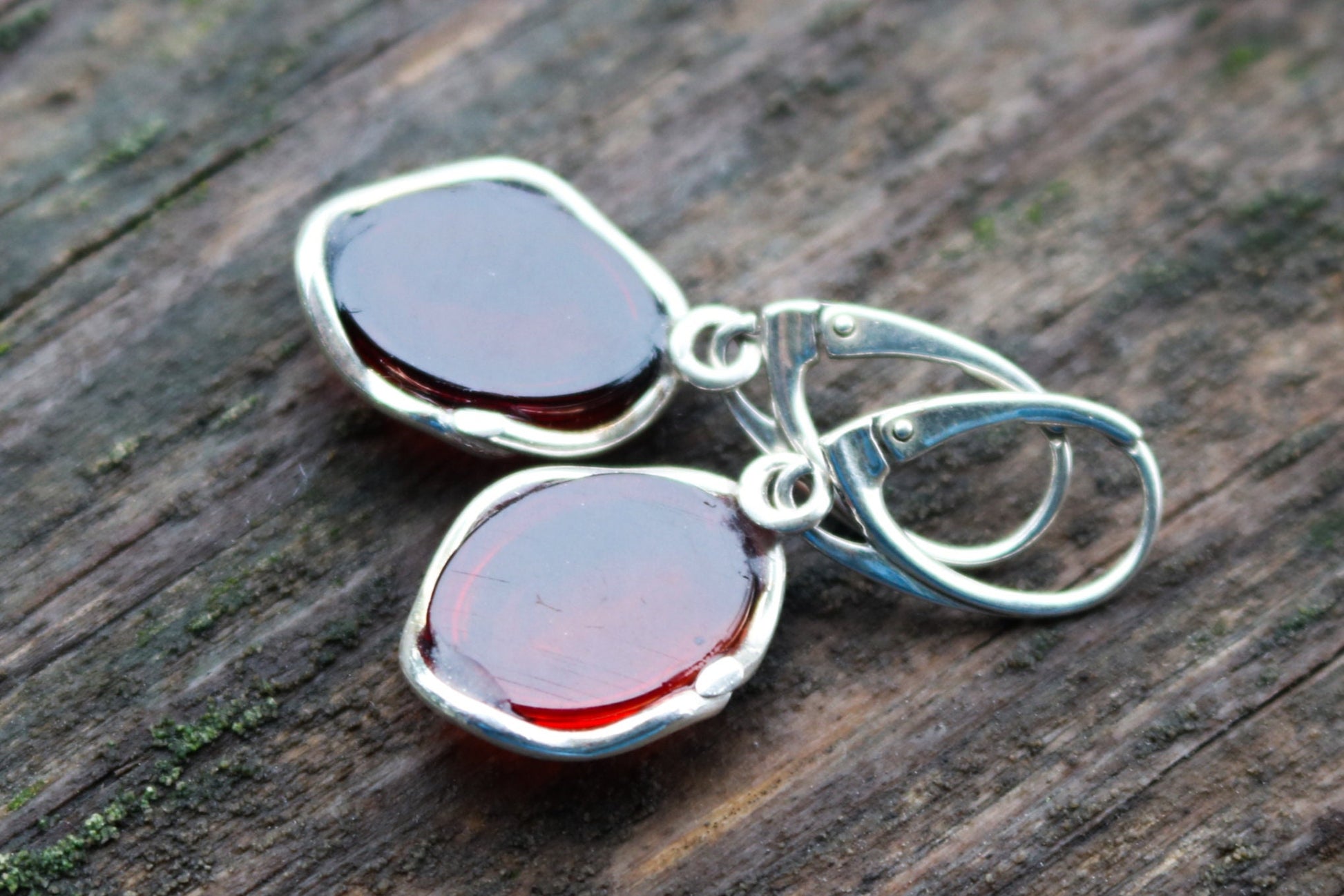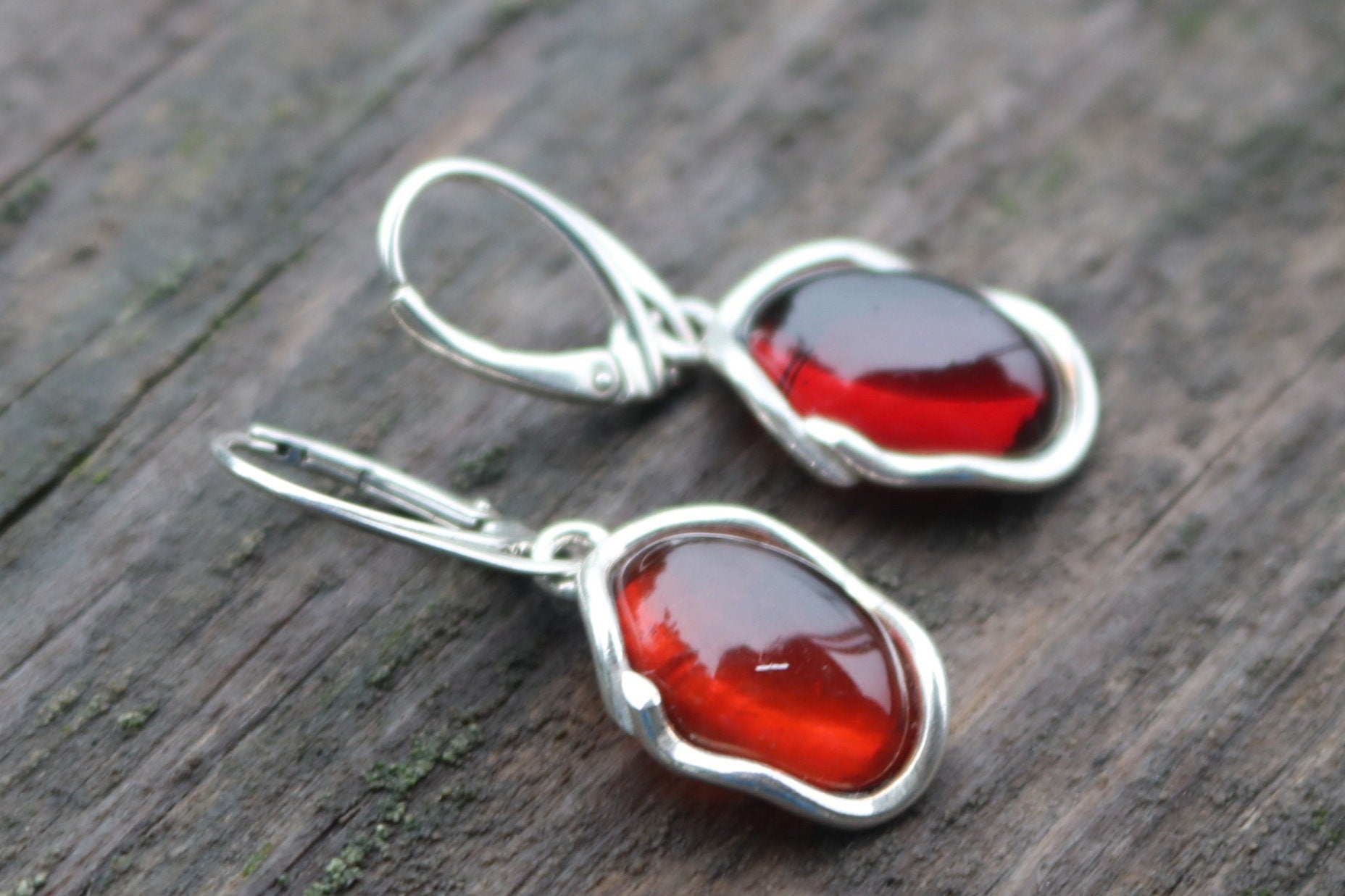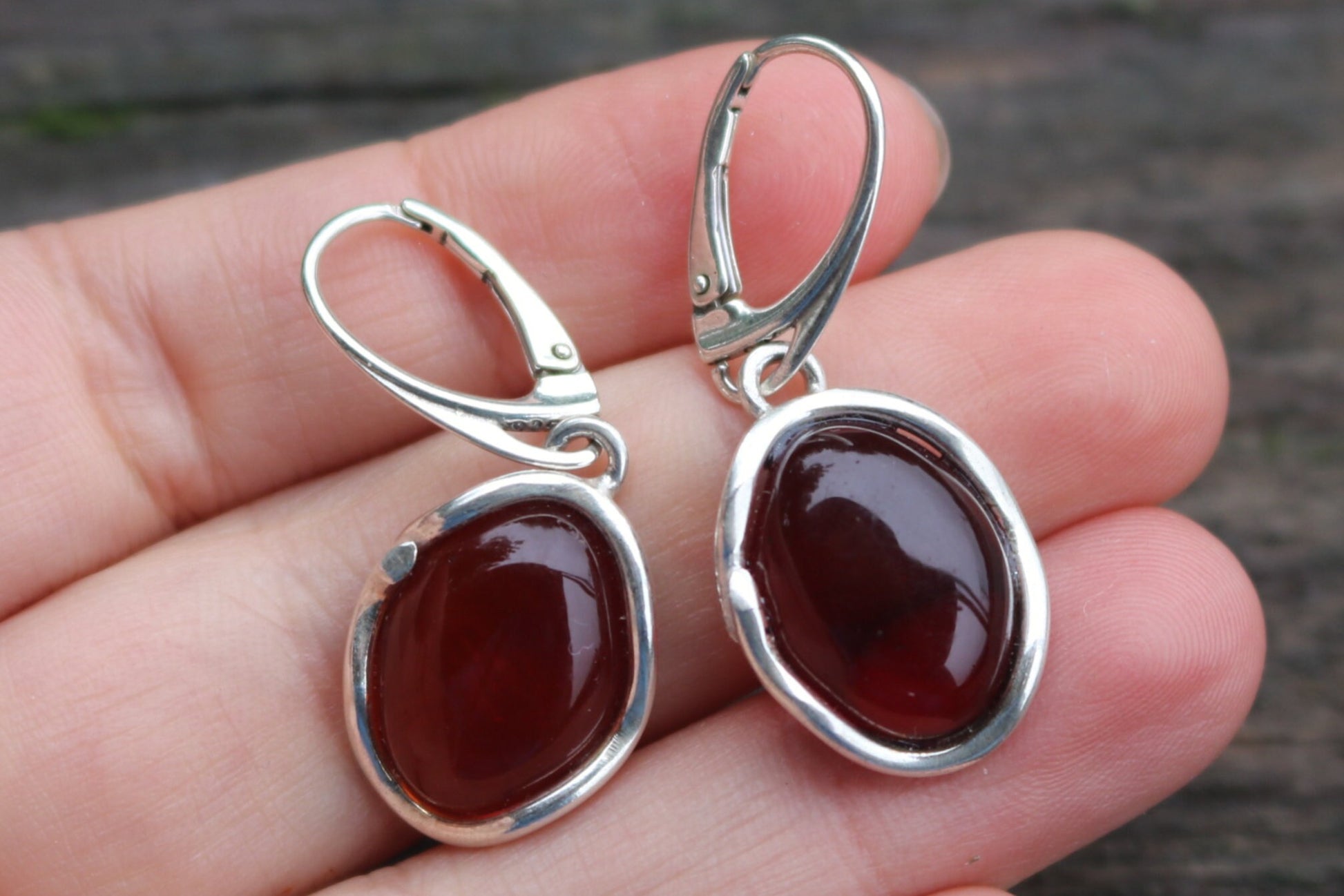 Baltic Amber hand carved oval earrings in natural untreated cherry color. Set in 925 sterling silver.