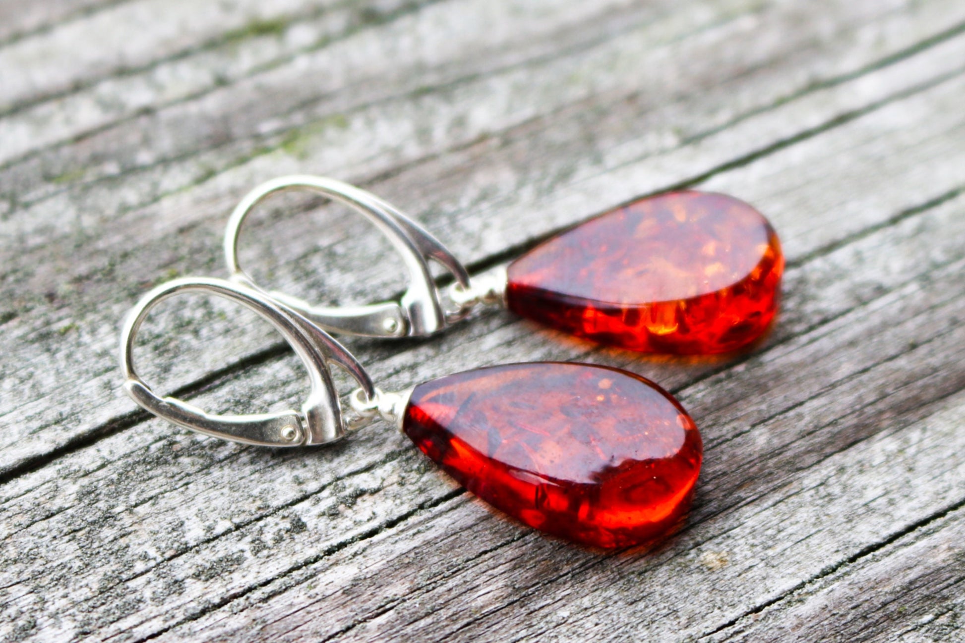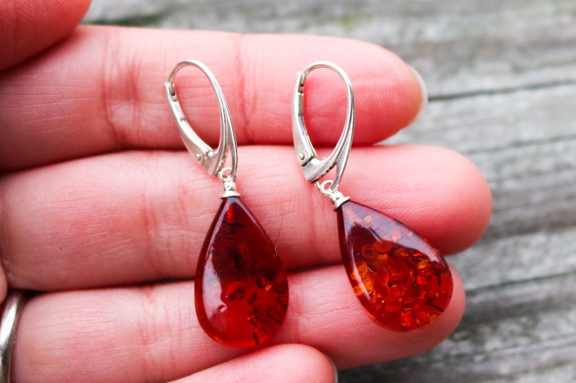 Baltic Amber Earrings Cognac Drop Natural Sparkling Jewelry 1.52" 3.2 gram 925 Silver