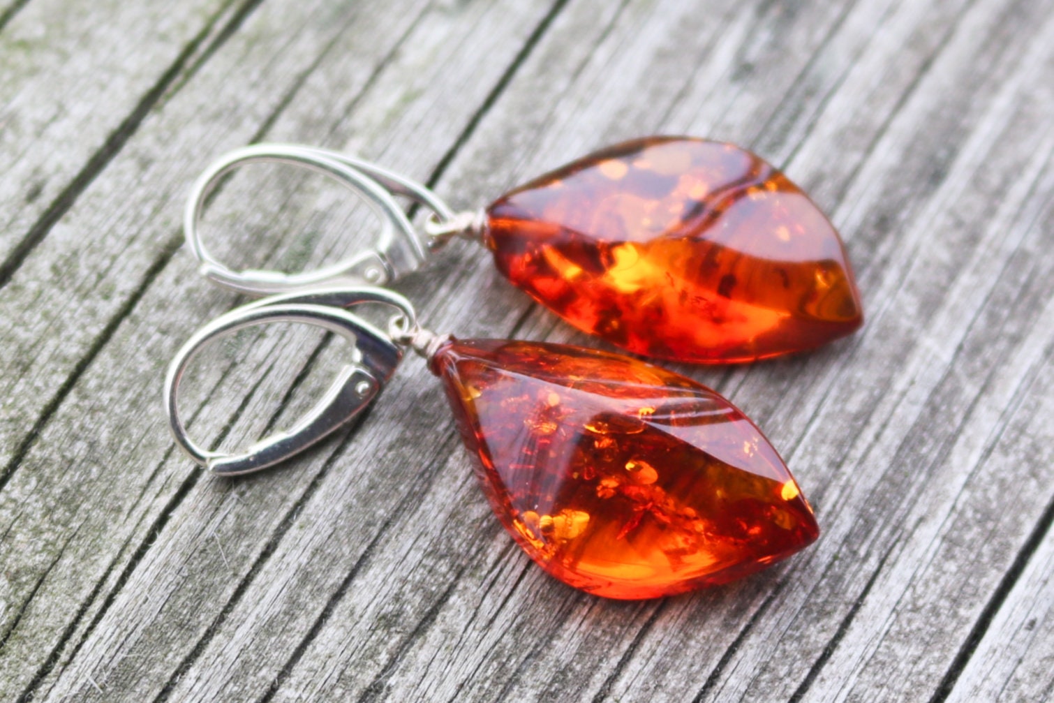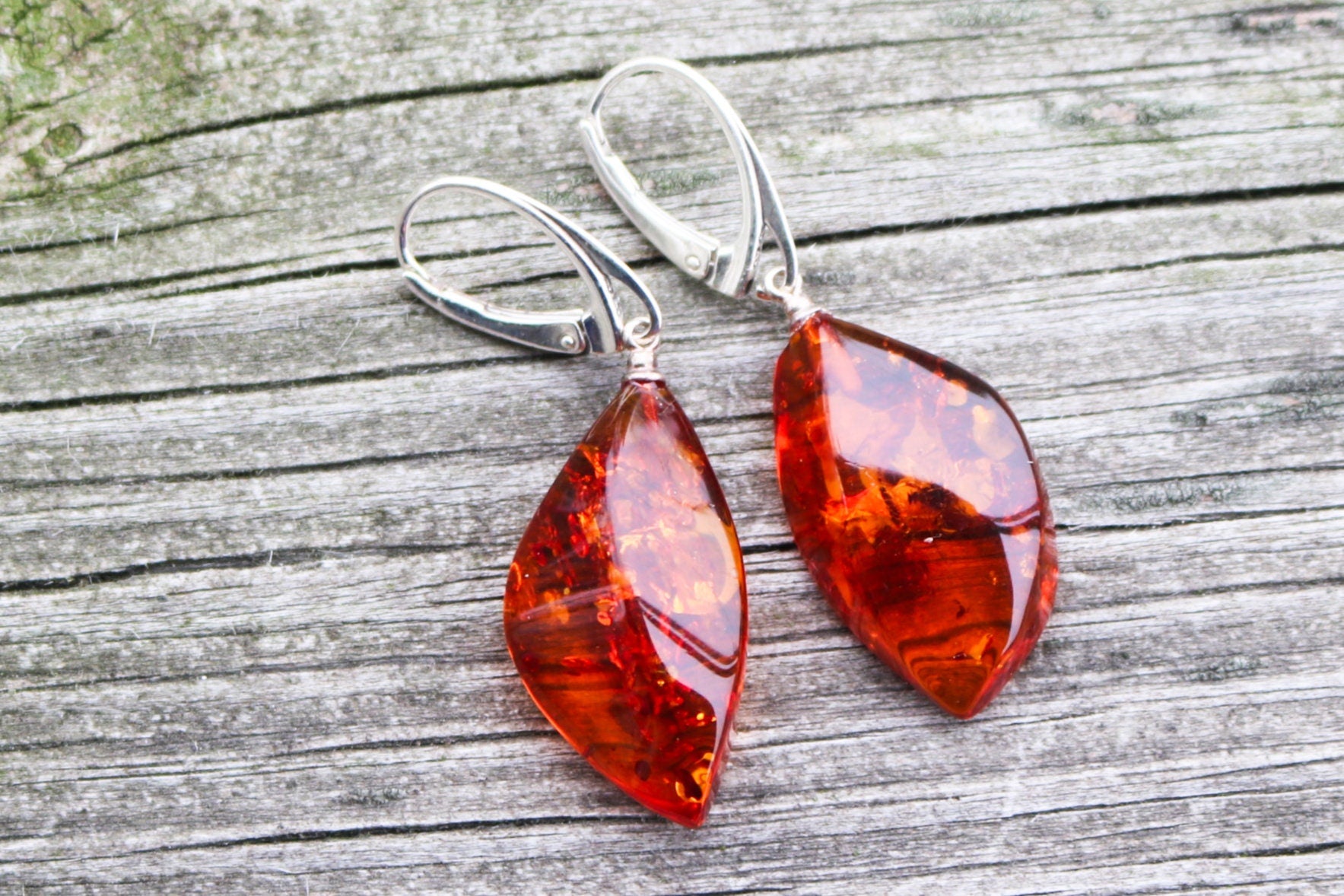 Baltic Amber hand faceted earrings in sparkling cognac color. Set in 925 sterling silver.
