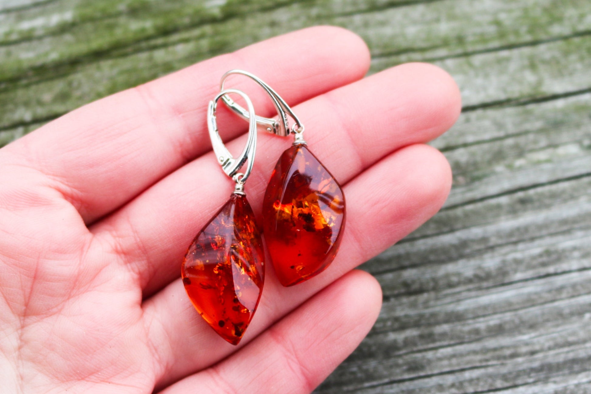 Baltic Amber Earrings Cognac Faceted Sparkling 1.85" 925 Silver 5.4 gram