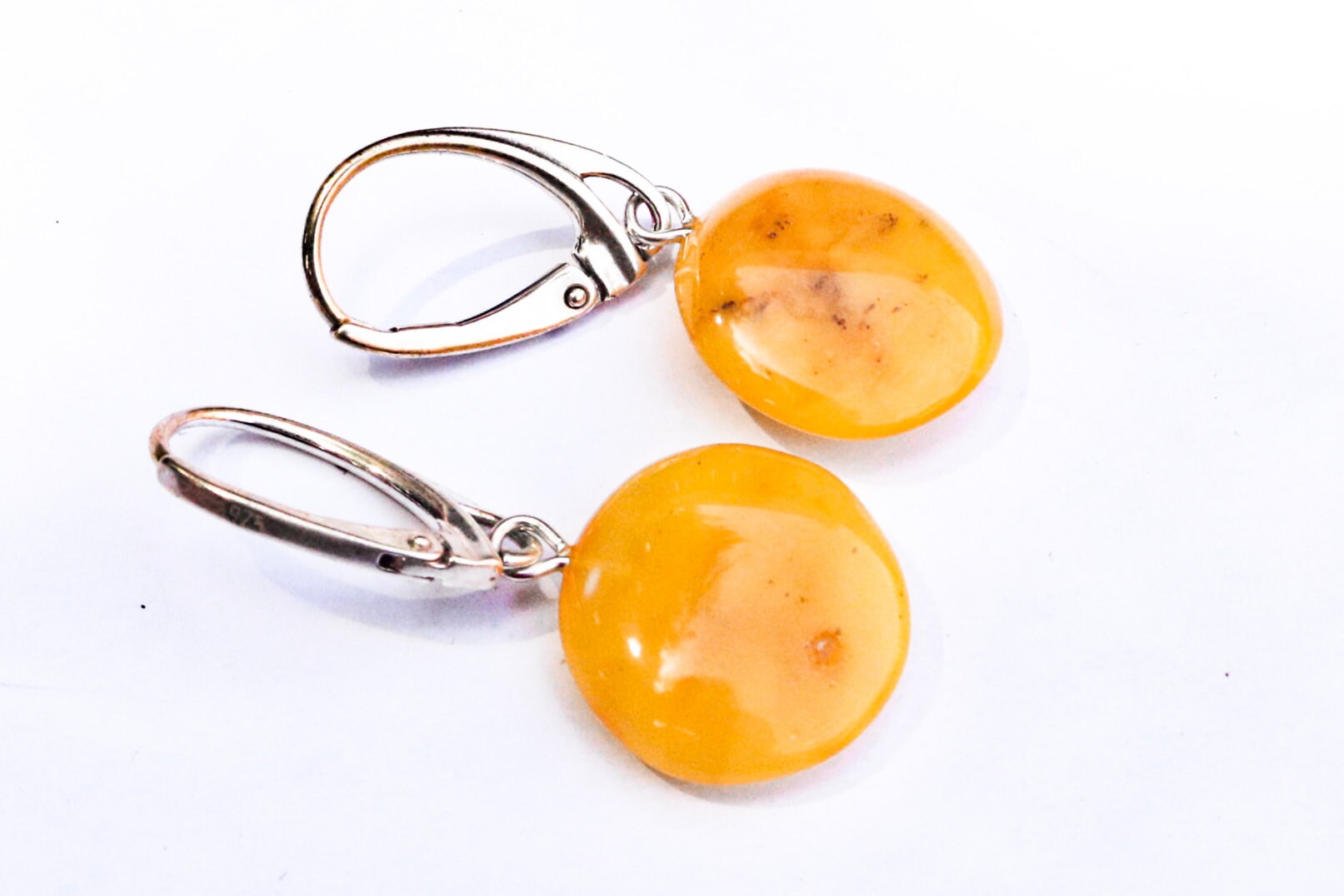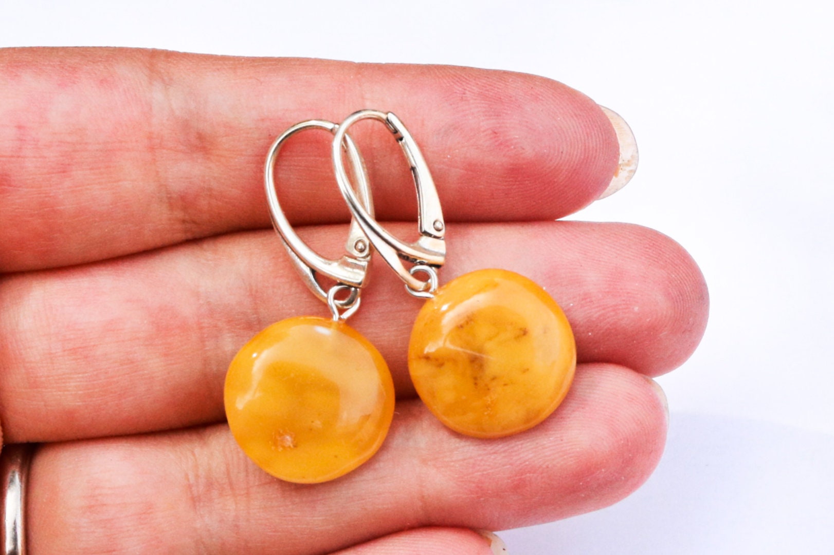 Baltic Amber Earrings Disc Butterscotch Yolk Natural Jewelry 1.35" 2.6 gram 925 Silver