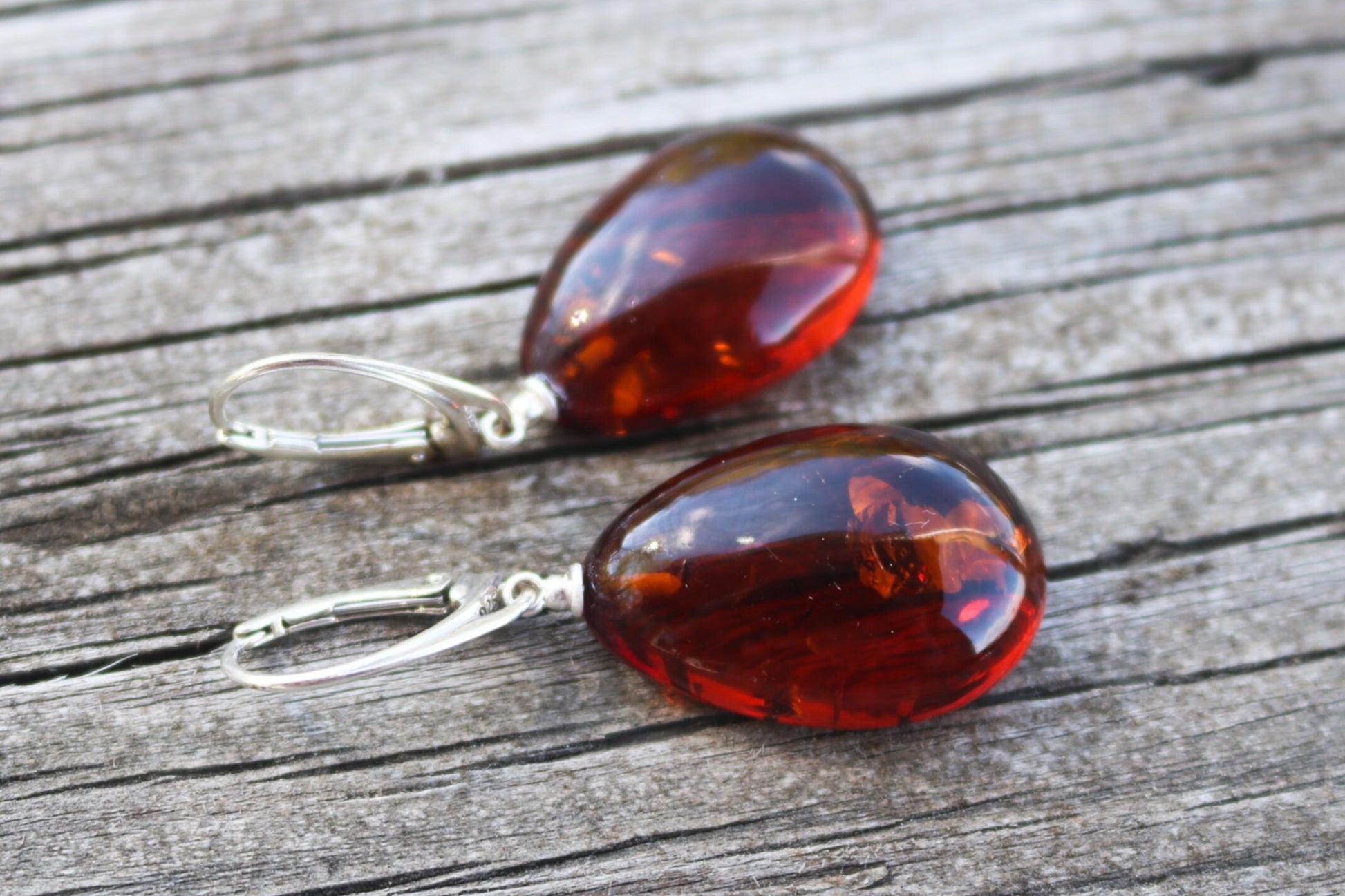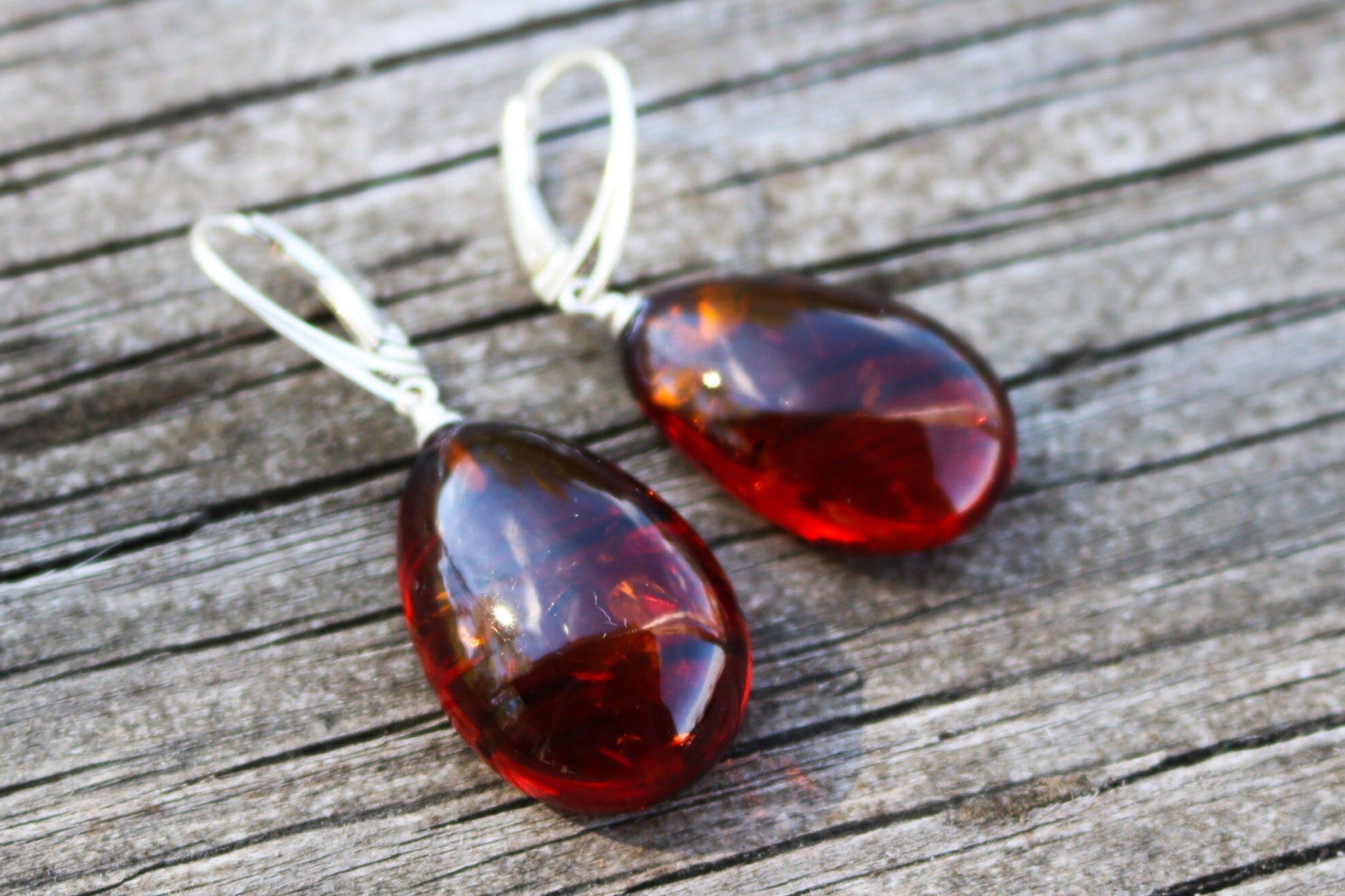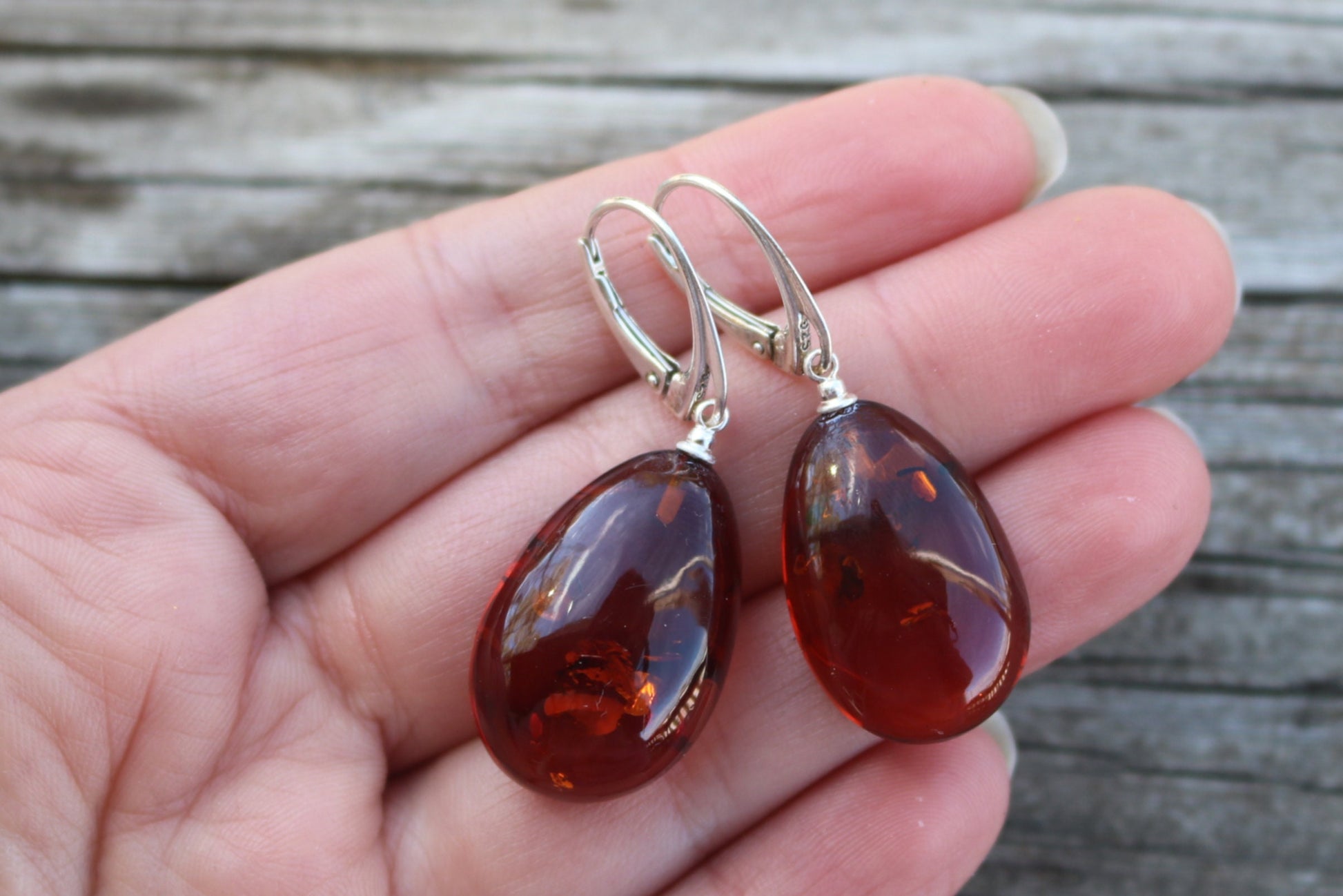 Baltic Amber Earrings Drops Cognac Shaped Natural Jewelry 1.75" 5.6 925 silver