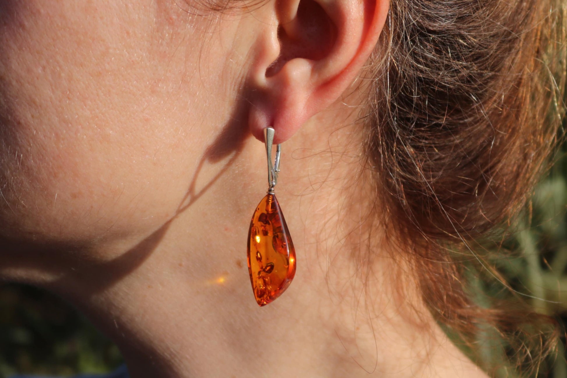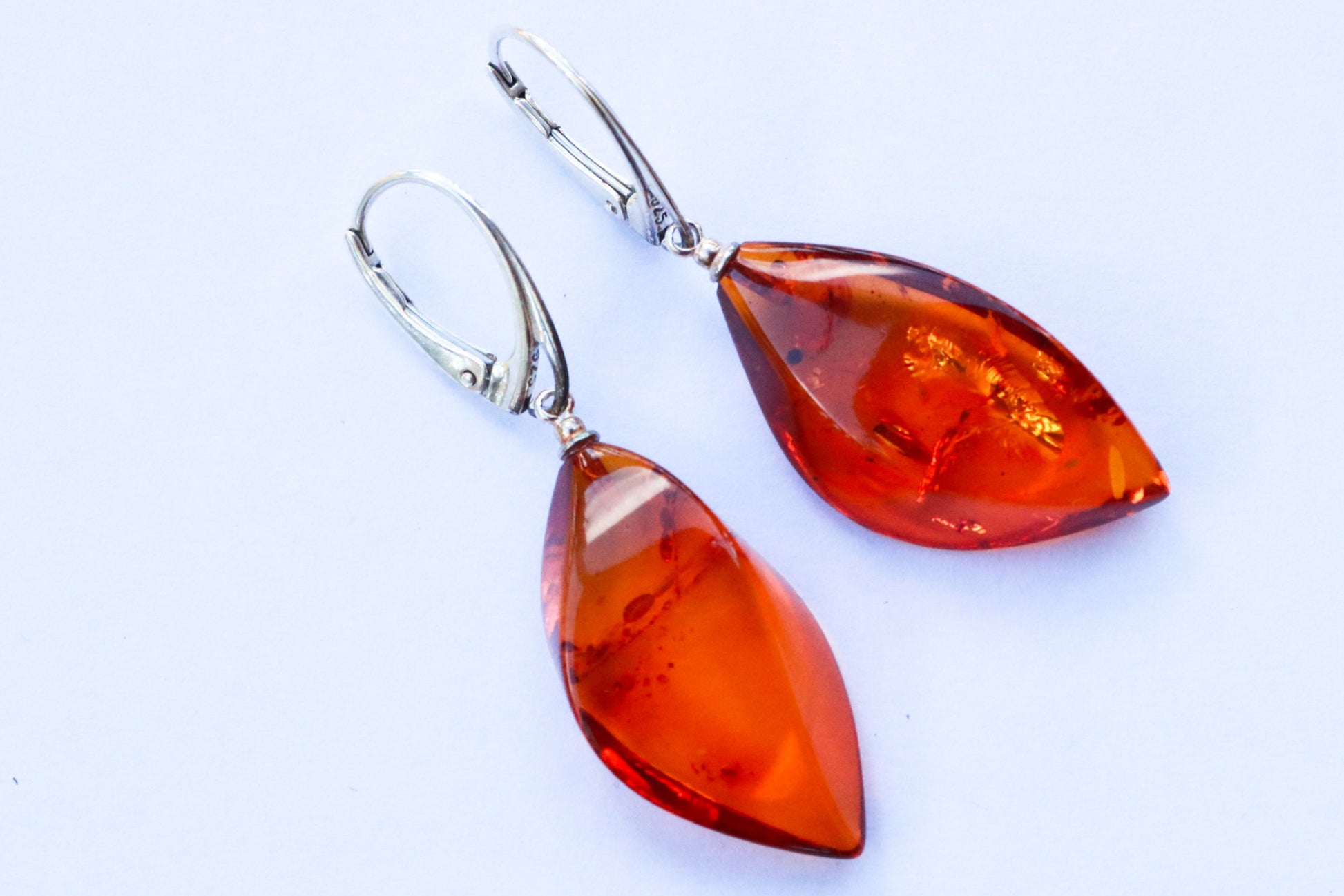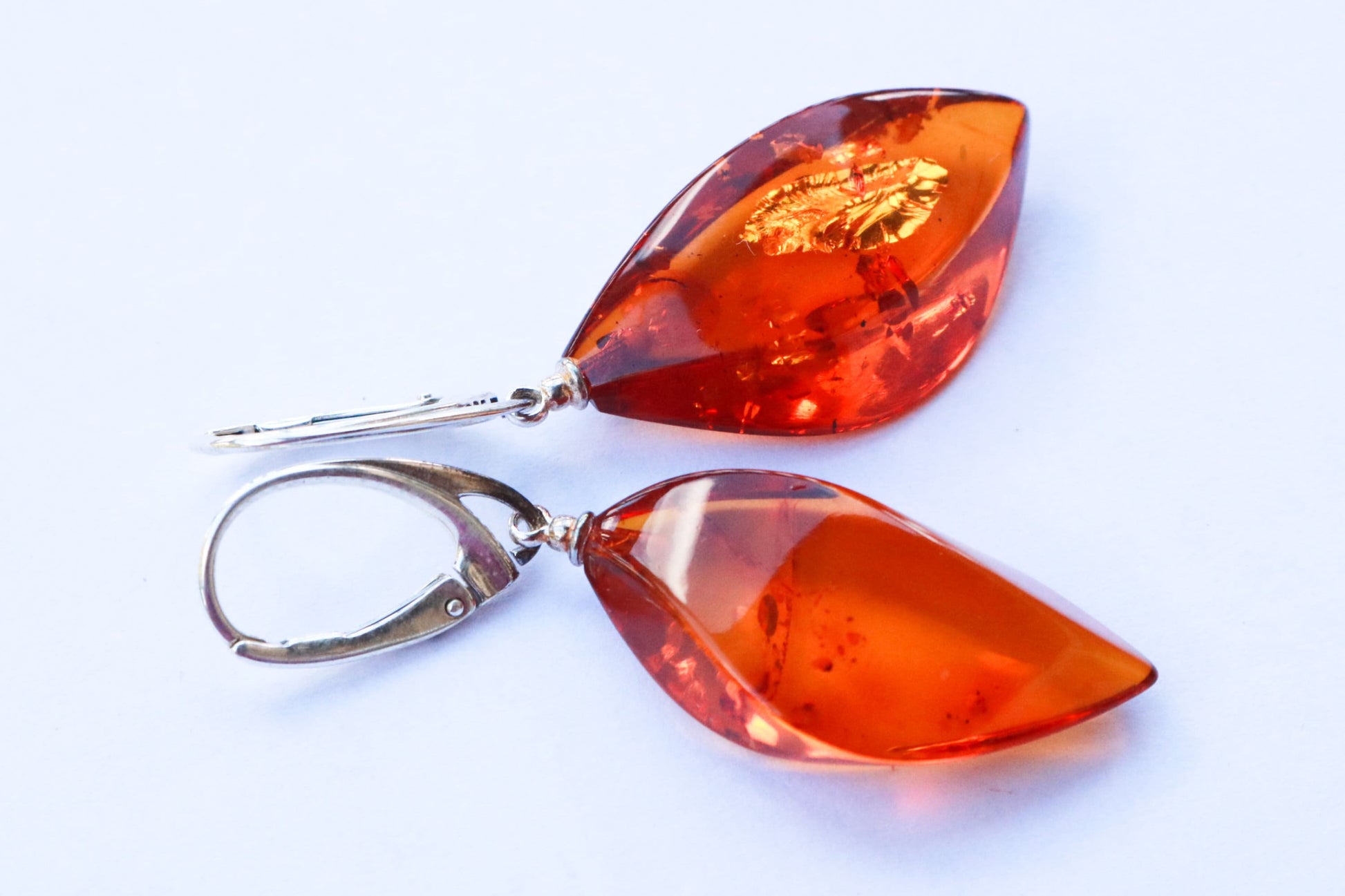 Gorgeous Baltic Amber dangling drop earrings hand carved and faceted in transparent sparkling cognac color. Natural solid amber.