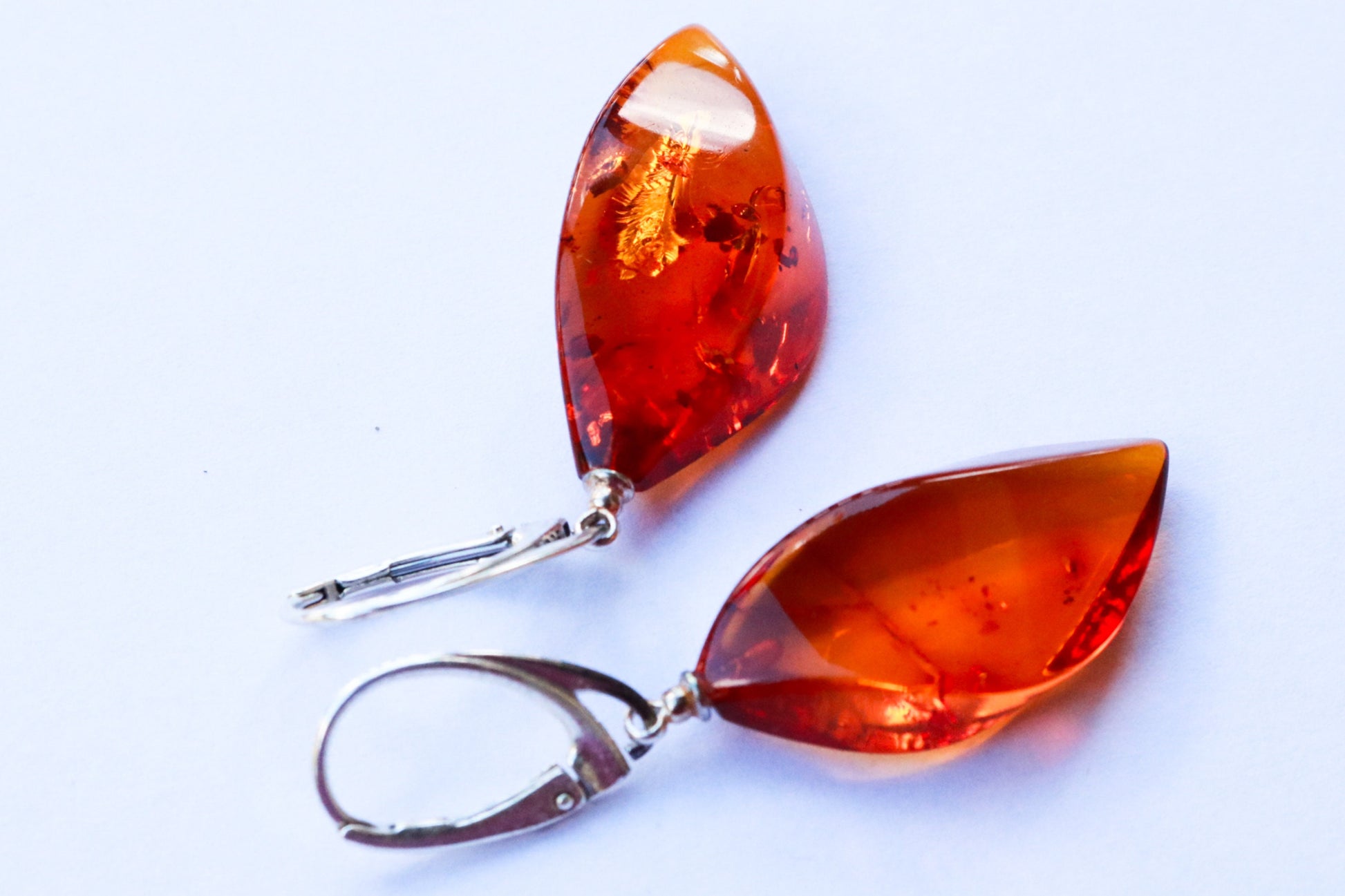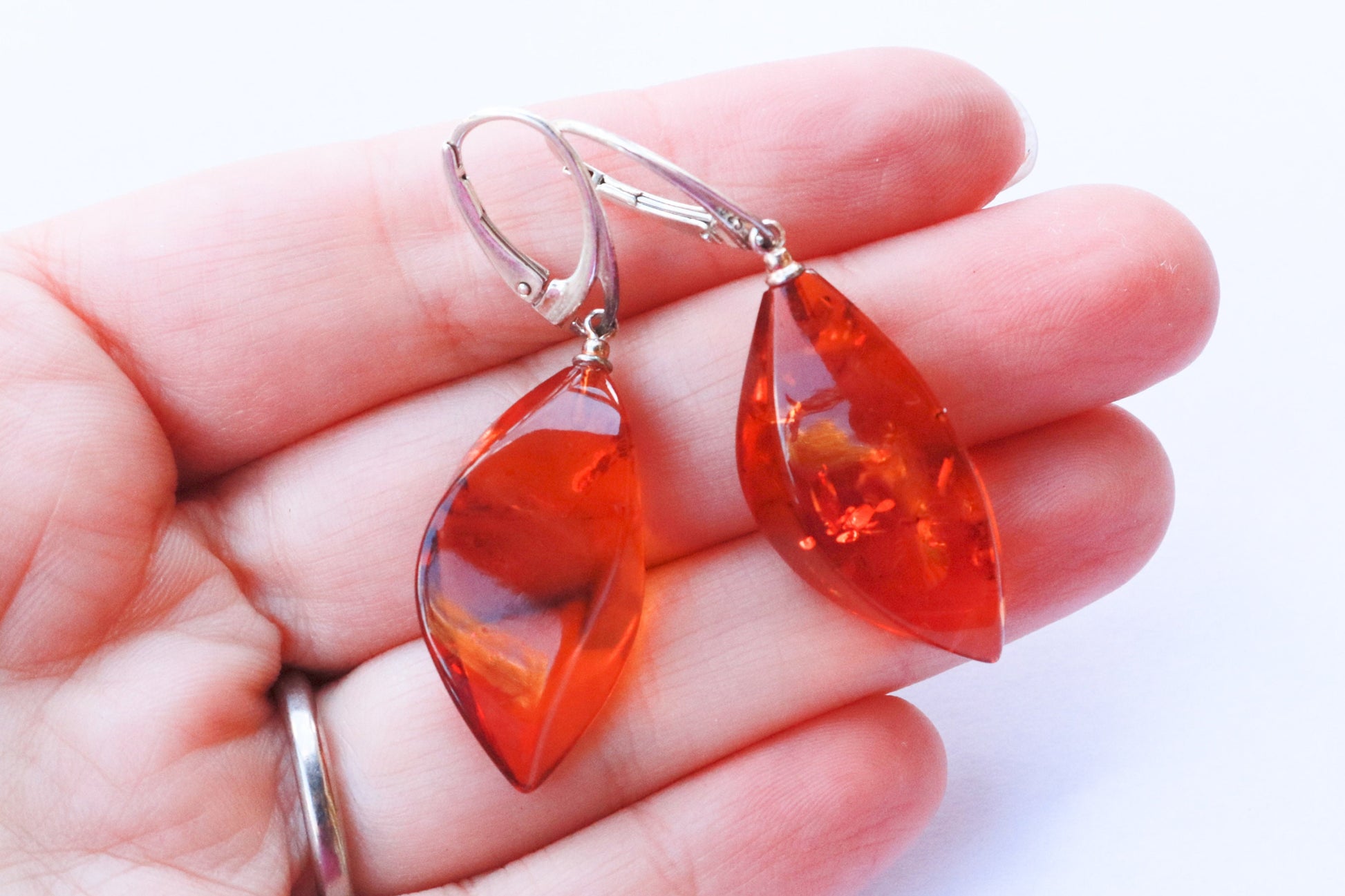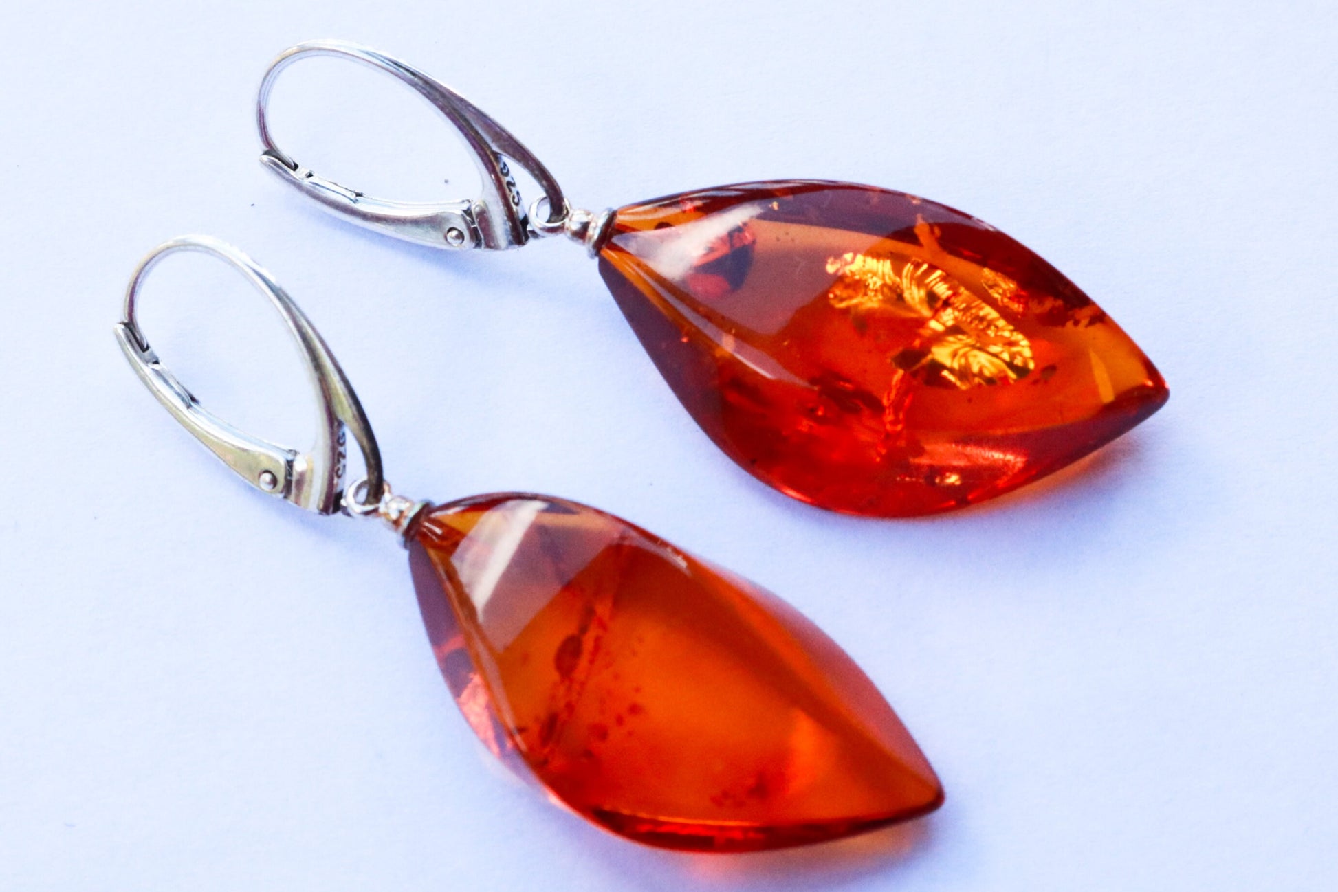 Gorgeous Baltic Amber dangling drop earrings hand carved and faceted in transparent sparkling cognac color. Natural solid amber.